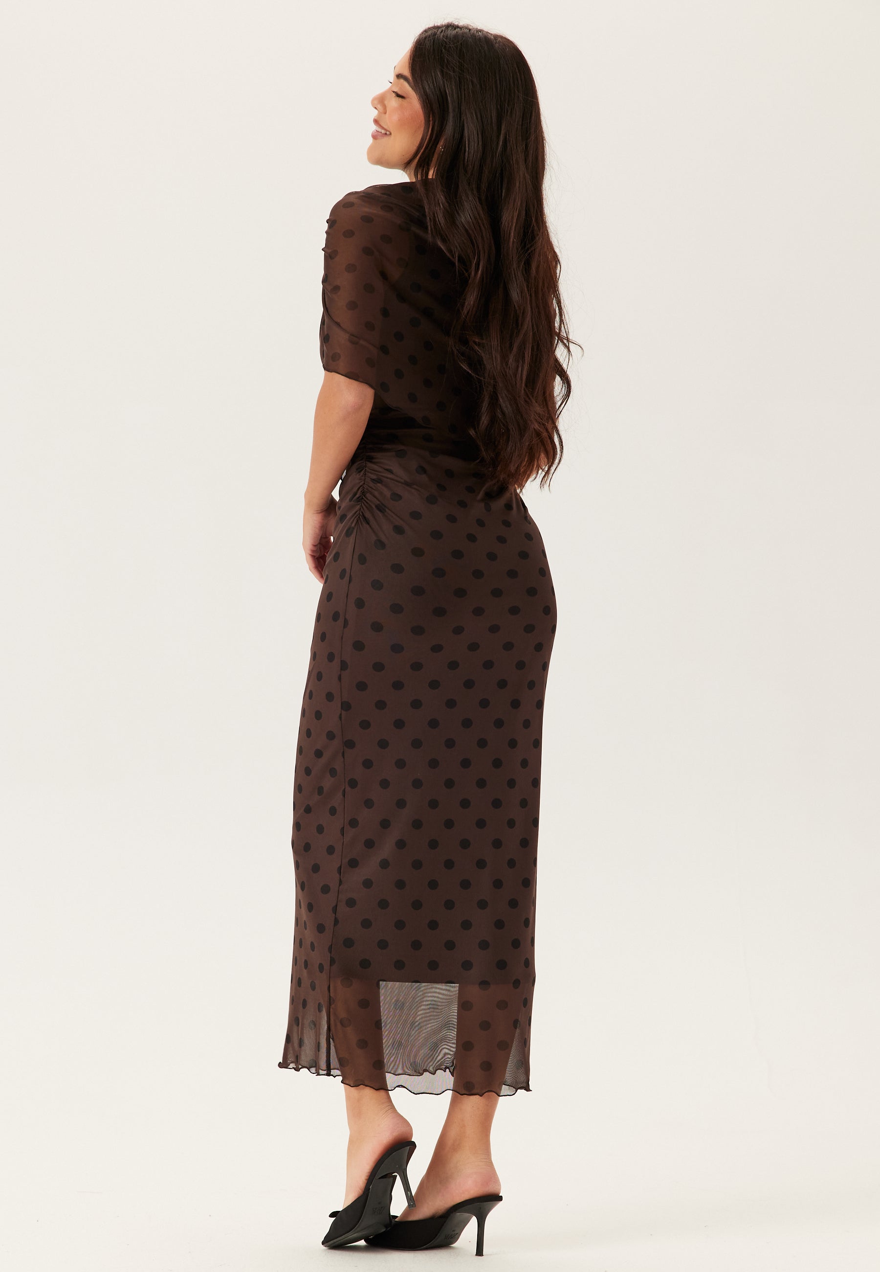This ankle-length mesh dress in a dark brown polka dot print is made for weddings, parties, and evening events when you want something that feels both comfortable and a little more striking. The stretchy mesh fabric moves with you, while the draped cape detail at the top gives it a soft, statement look that sets it apart from a classic party dress.