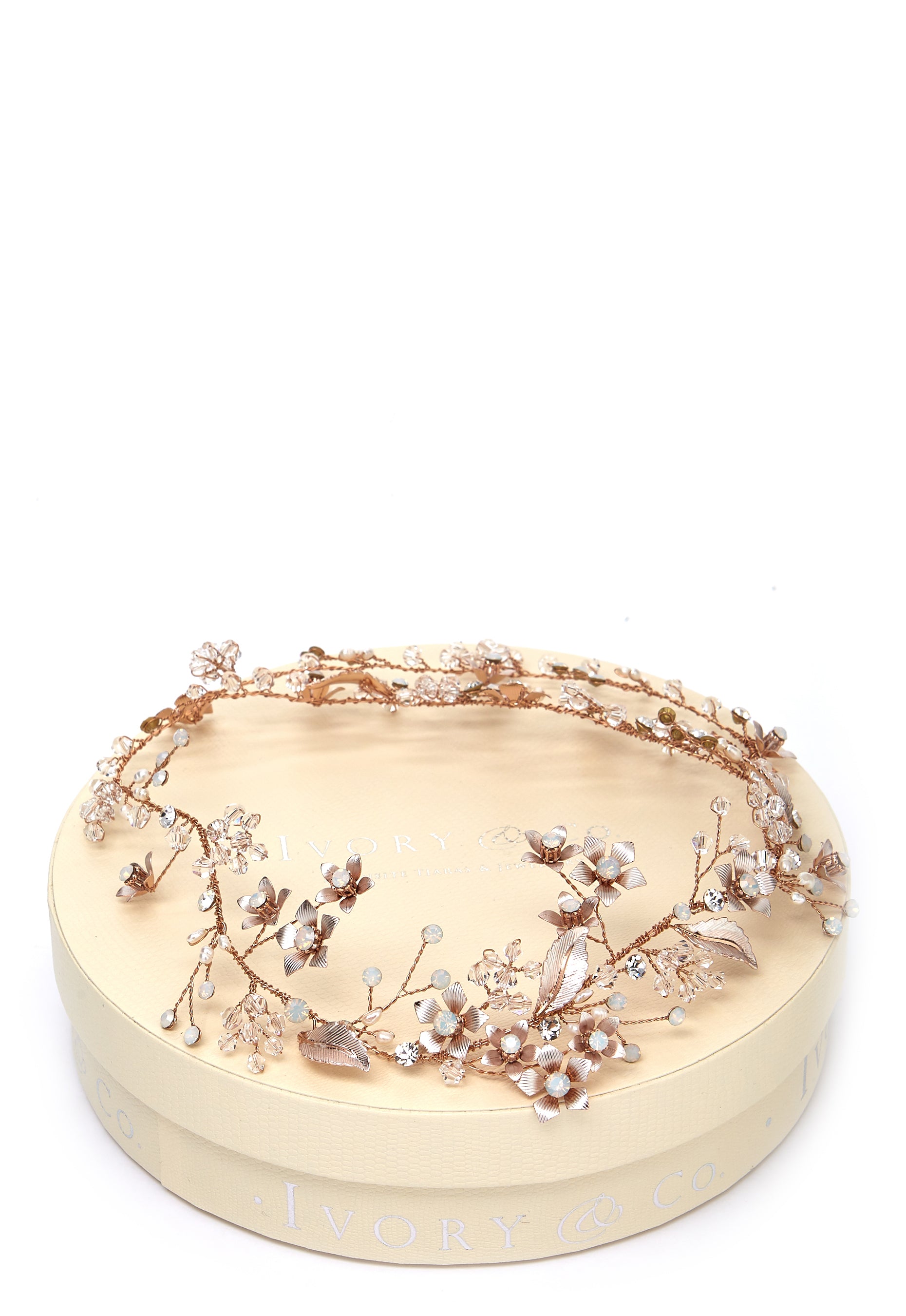 Gorgeous hair comb with gems from IVORY & CO. The hair comb has a luxurious look and is perfect for weddings and other very special occasions. - Beautiful gems and rose gold metal details - Small holes at ends for fastening - Delivered in a luxury, round gift box For returns to be accepted, the item must be returned in its original packaging with tags intact.
