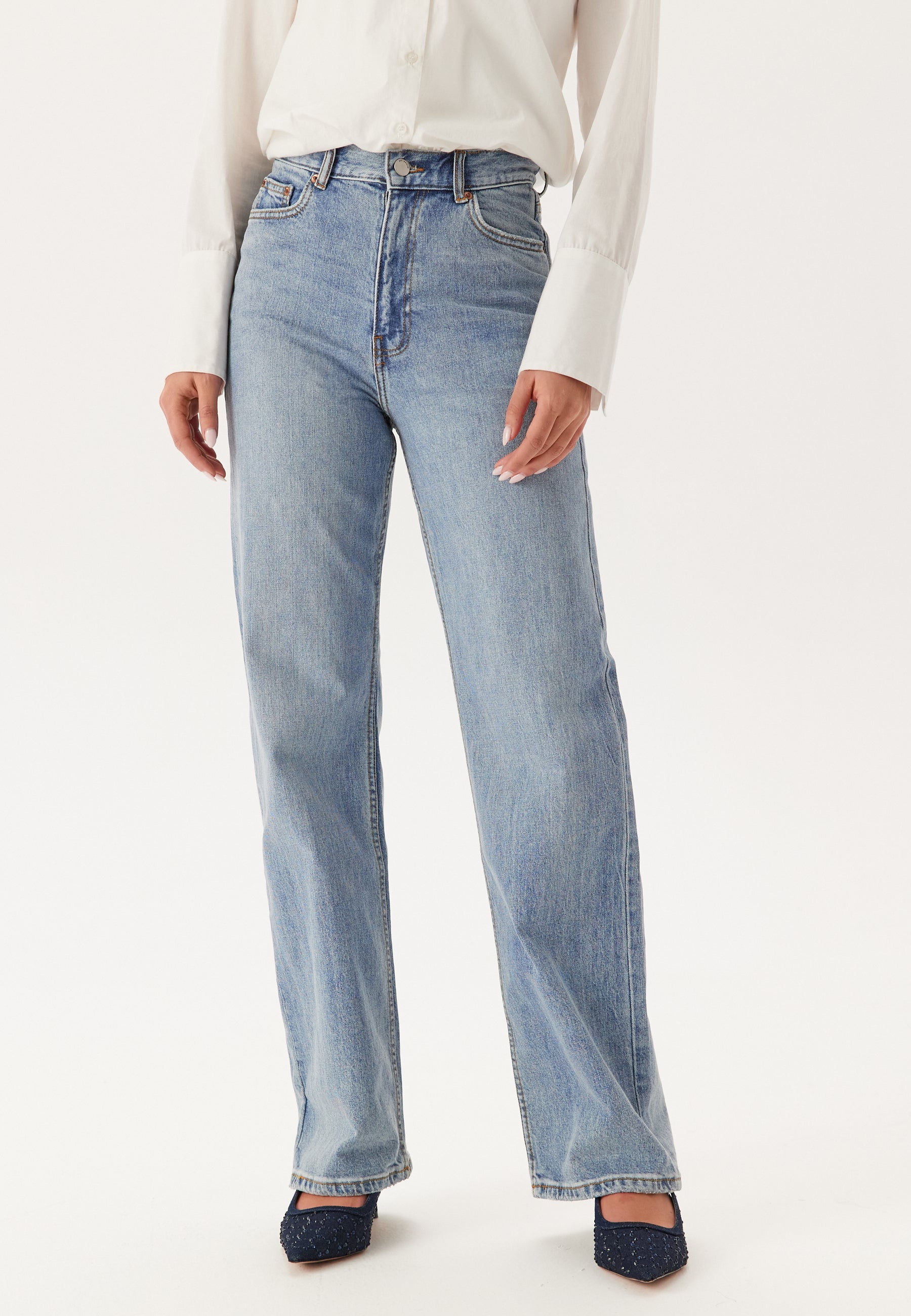 - Zip fly with button.