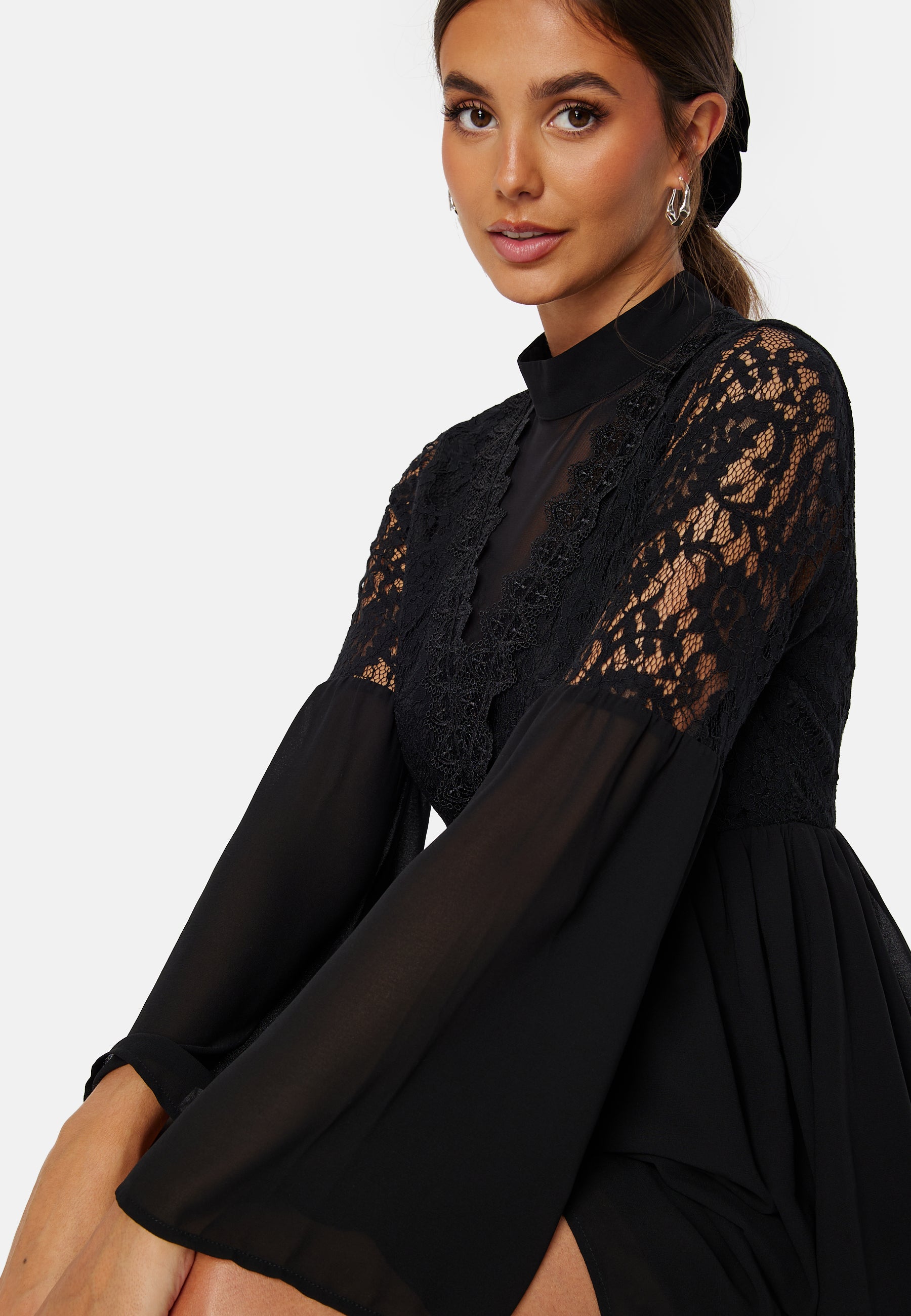 - Non-stretch, woven material with lace fabric on the upper part.