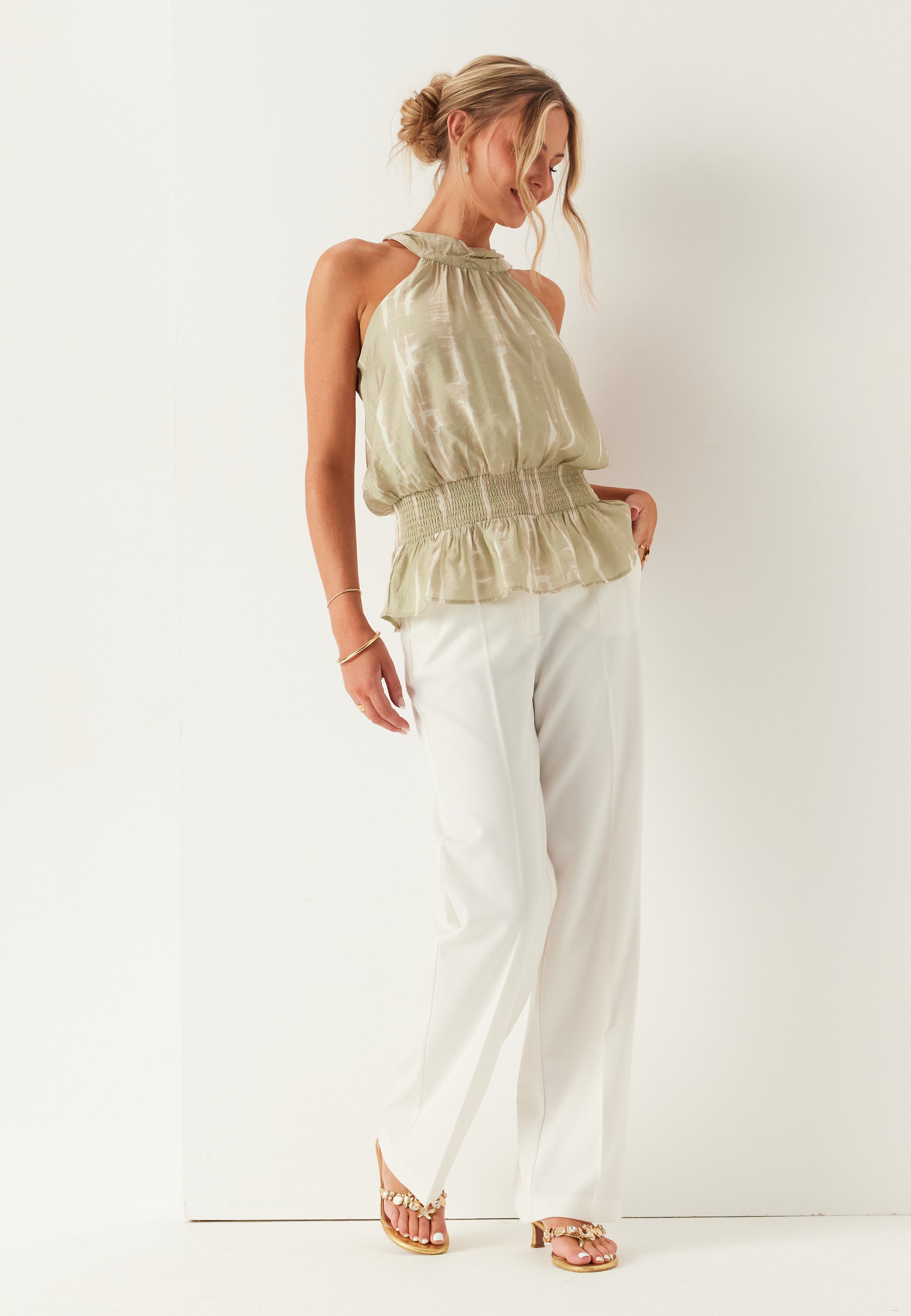 This sleeveless halter neck blouse is an easy party top for dinners, summer events, and nights when you want something light but still polished. The soft woven fabric and loose fit give it an airy feel, while the high neckline adds a clean, dressed-up shape that stands out from a standard sleeveless blouse.