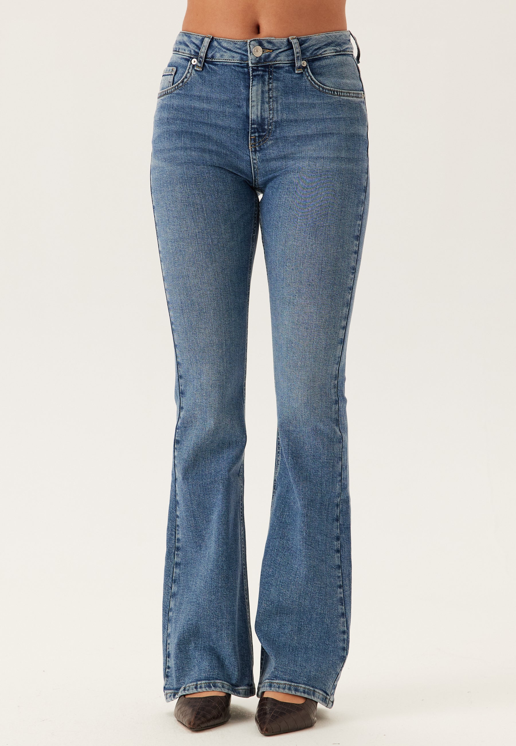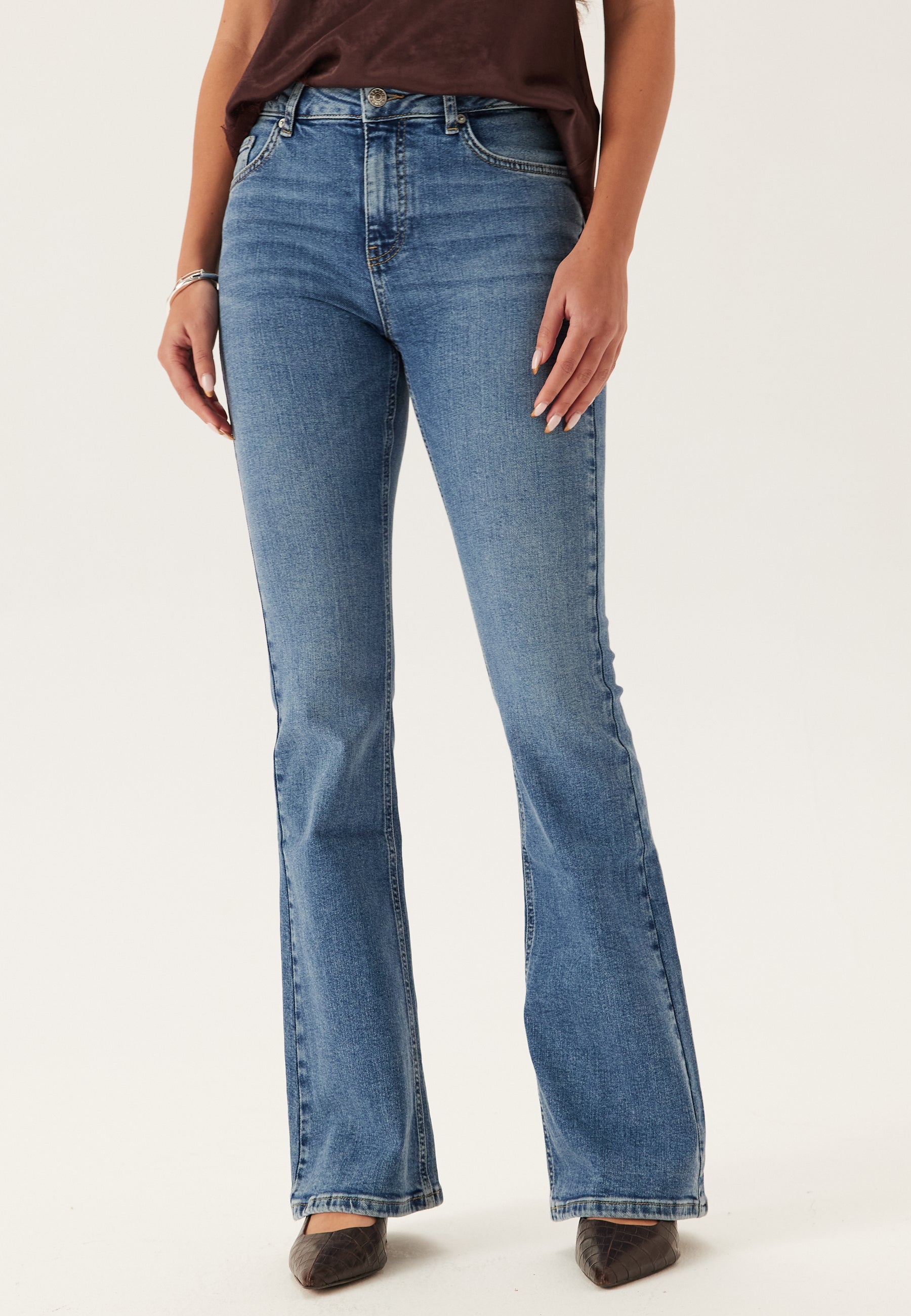 - Flared, body-hugging, stretchy fit