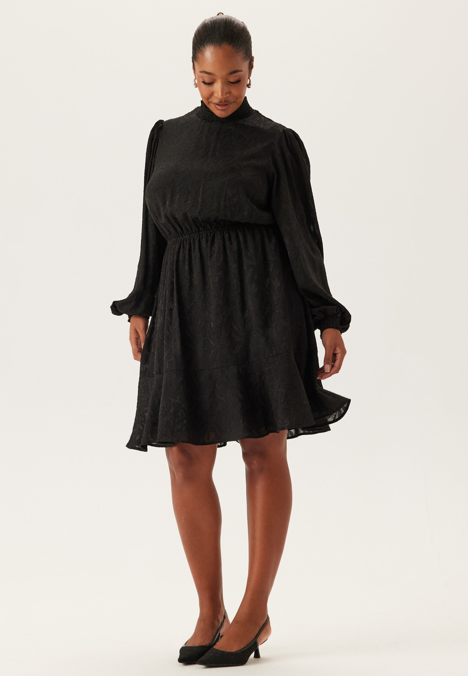 - High neckline with smocked collar and button closure at the neck