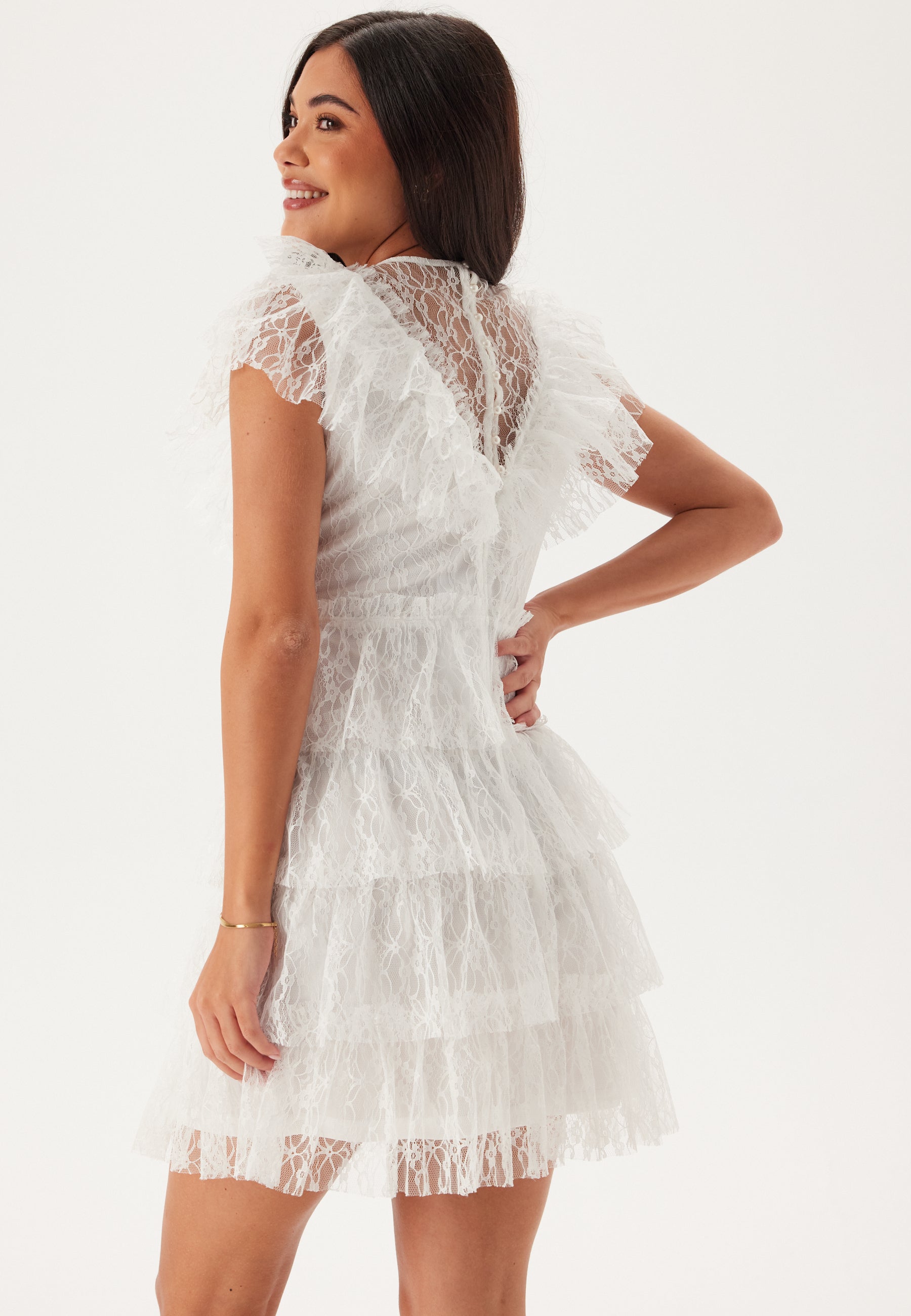 The defined waist and button fastening at the neck add subtle structure and refinement, making this piece a standout choice among party dresses. Its short length and sleeveless design keep it light and airy, perfect for warmer weather or layered with a jacket for cooler evenings. The intricate lace detail and layered frills bring texture and visual interest without overwhelming the look.