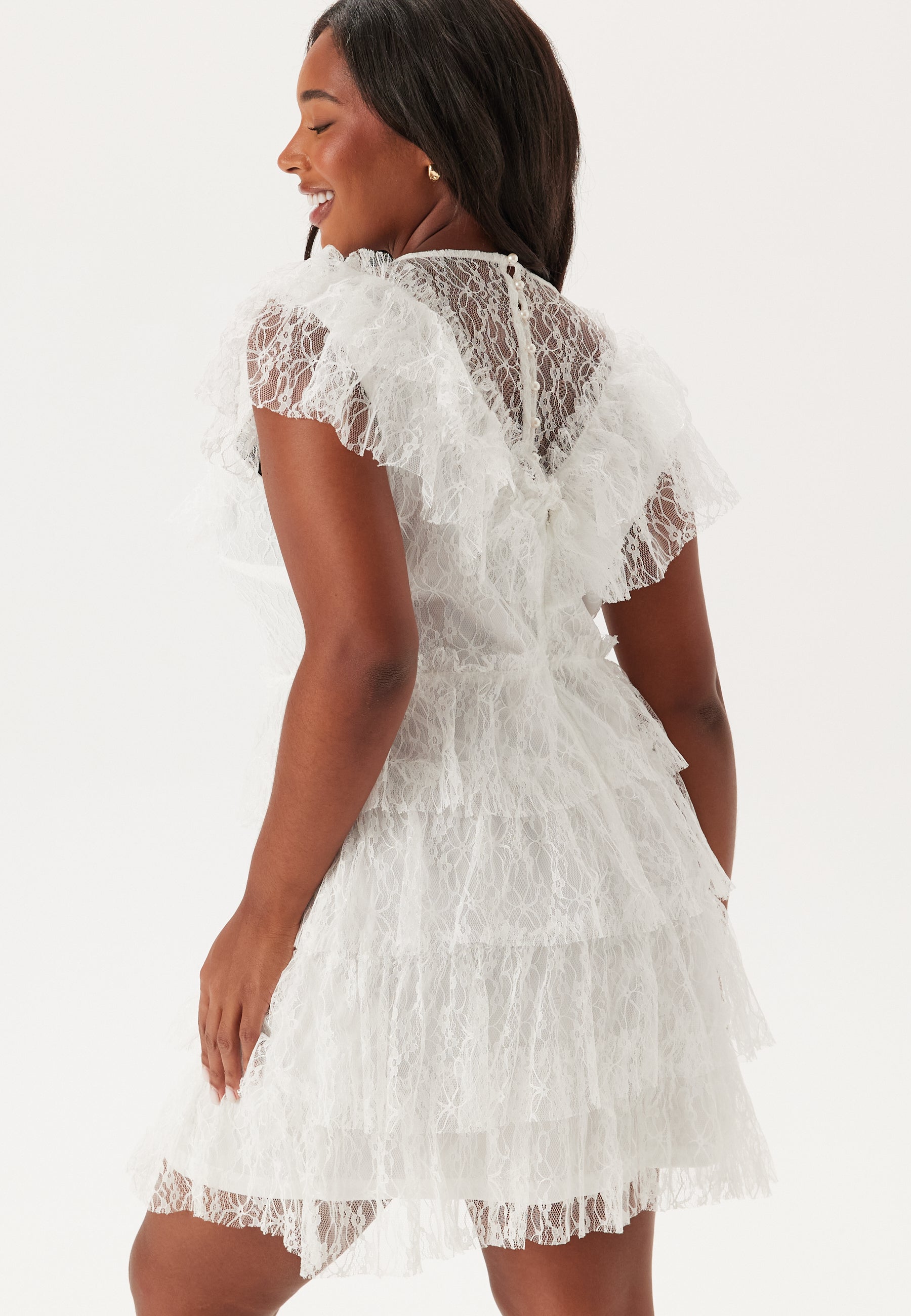 This white lace mini dress is designed for special occasions like graduations, summer parties, or elegant daytime events. It combines delicate lace fabric with a flounced neckline and soft ruffle tiers for a romantic, feminine silhouette that enhances your natural shape. The dress is lined for comfort and modesty, ensuring you feel confident throughout your celebration.