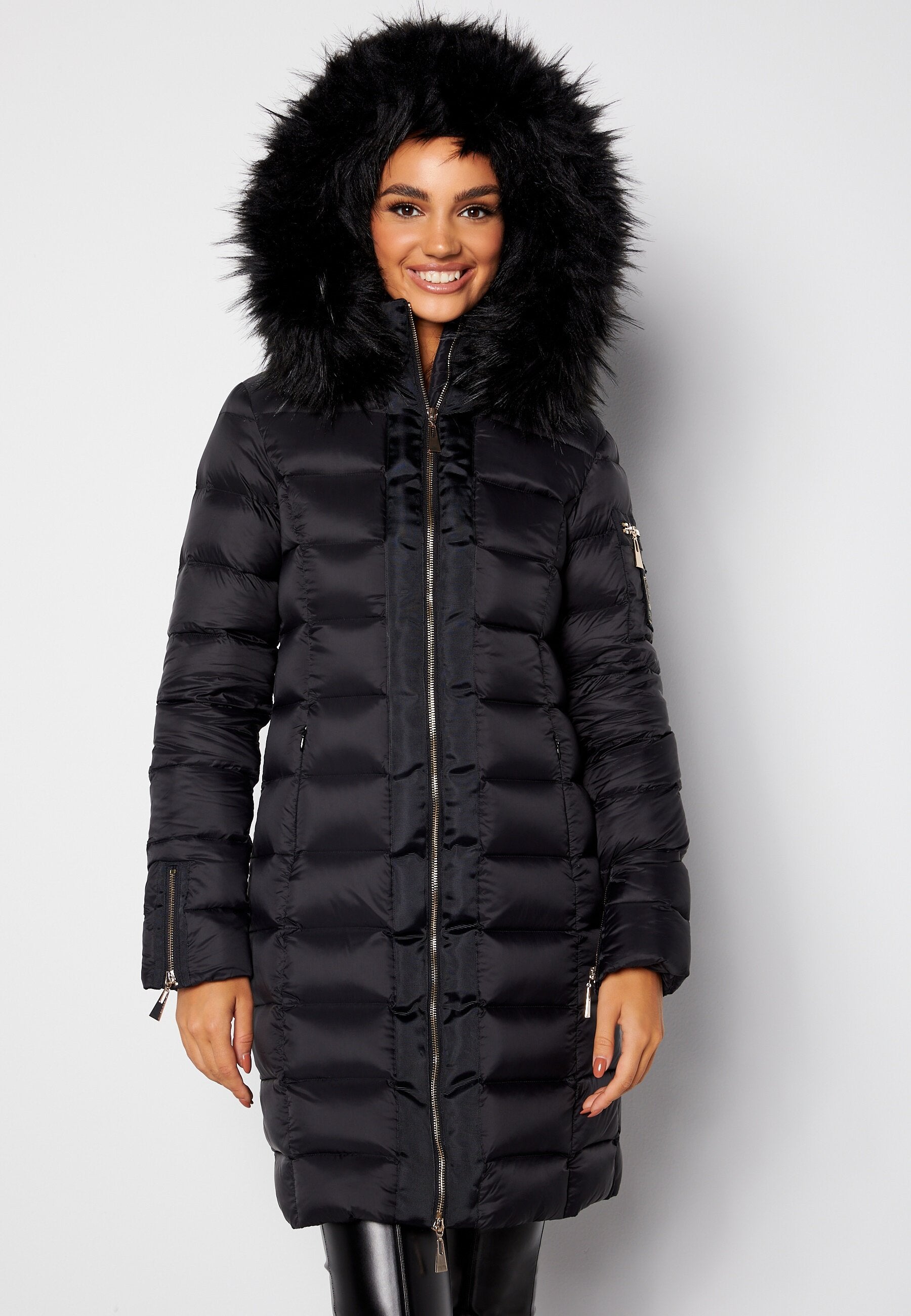 - Hood with removable faux fur trim