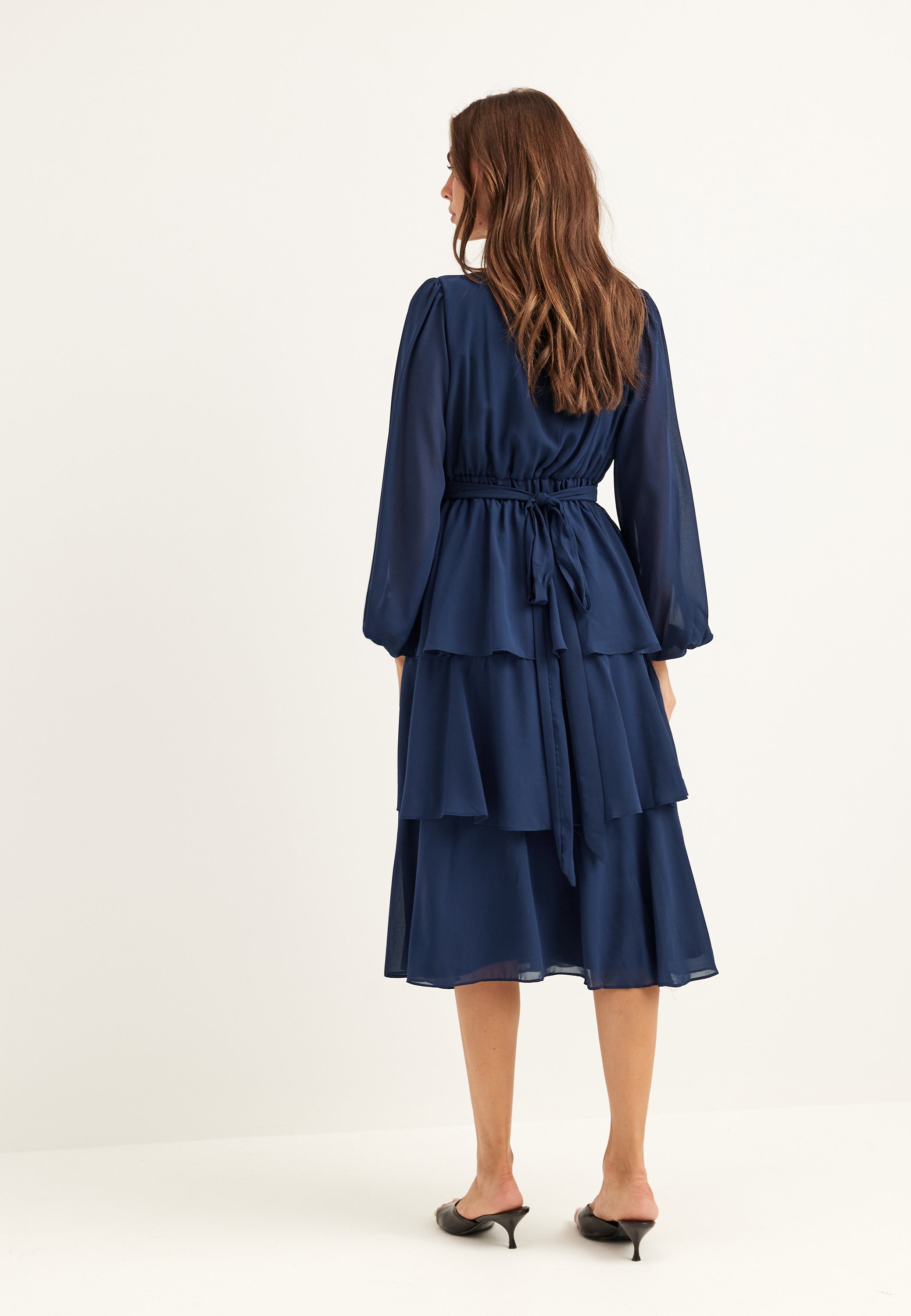 This long sleeve tiered midi dress is an easy choice for weddings, parties, and dressier dinners when you want something feminine, flattering, and comfortable to wear for hours. The deep V-neckline, softly draped skirt, and rich navy tone give it a polished look, while the tiered shape adds movement that really comes to life as you walk.
