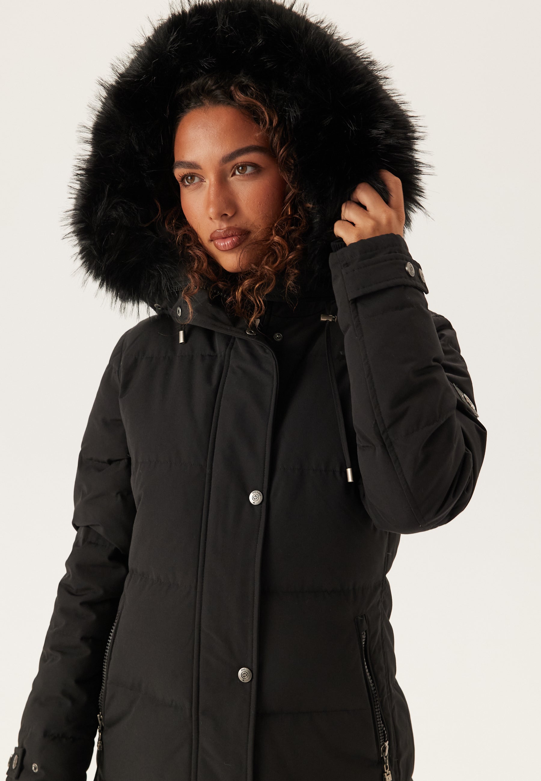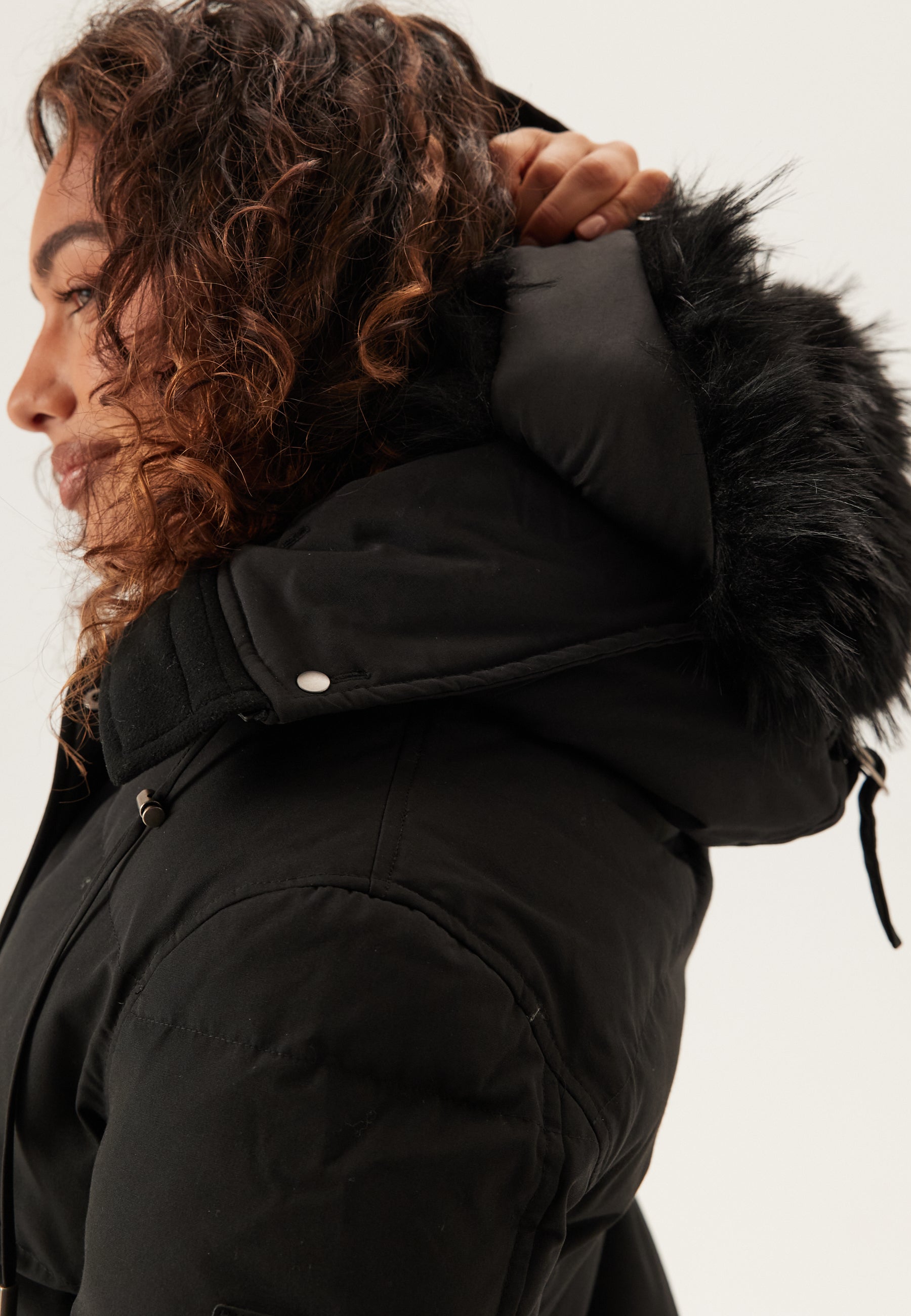 - Black, removable faux fur trim on the hood