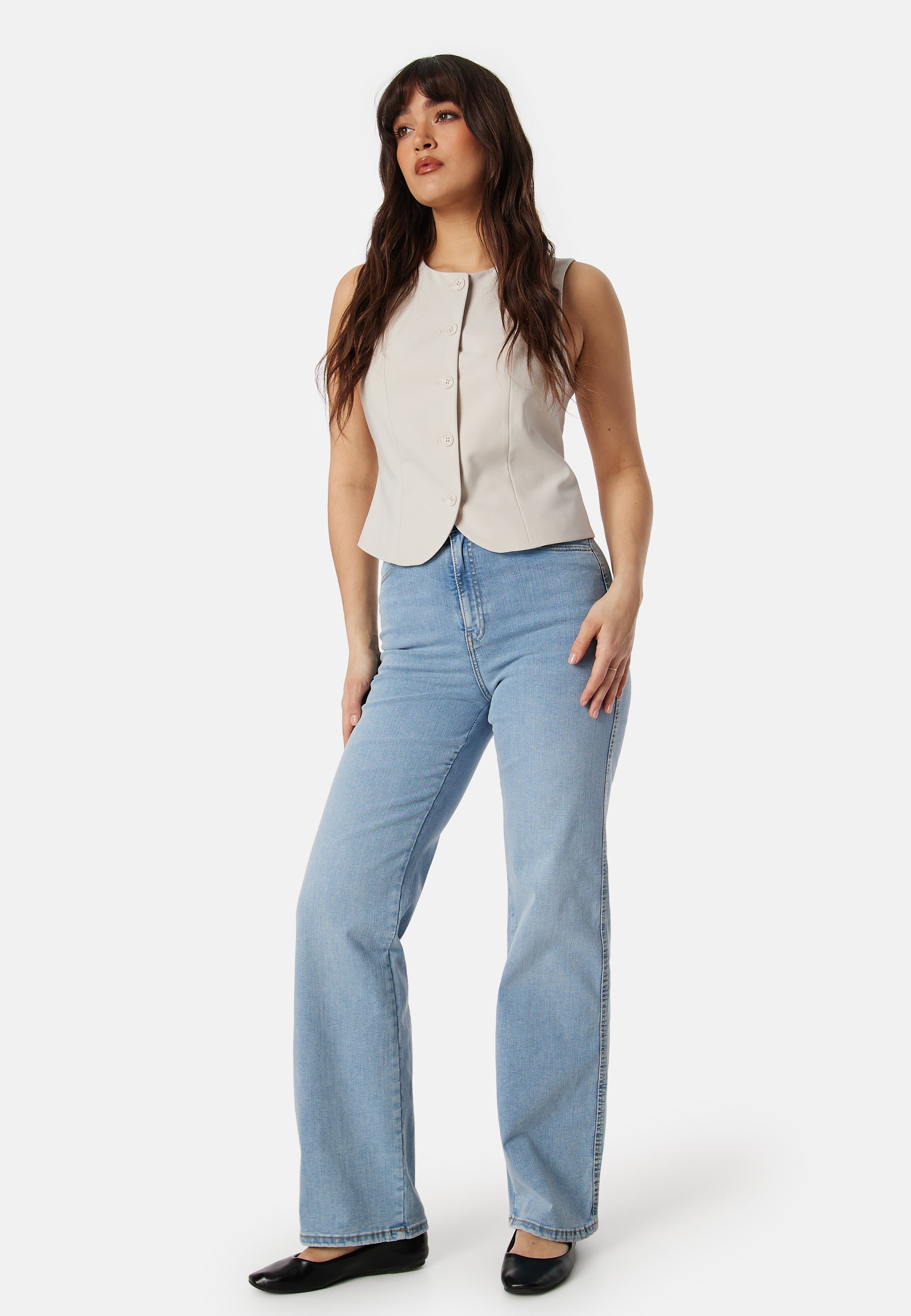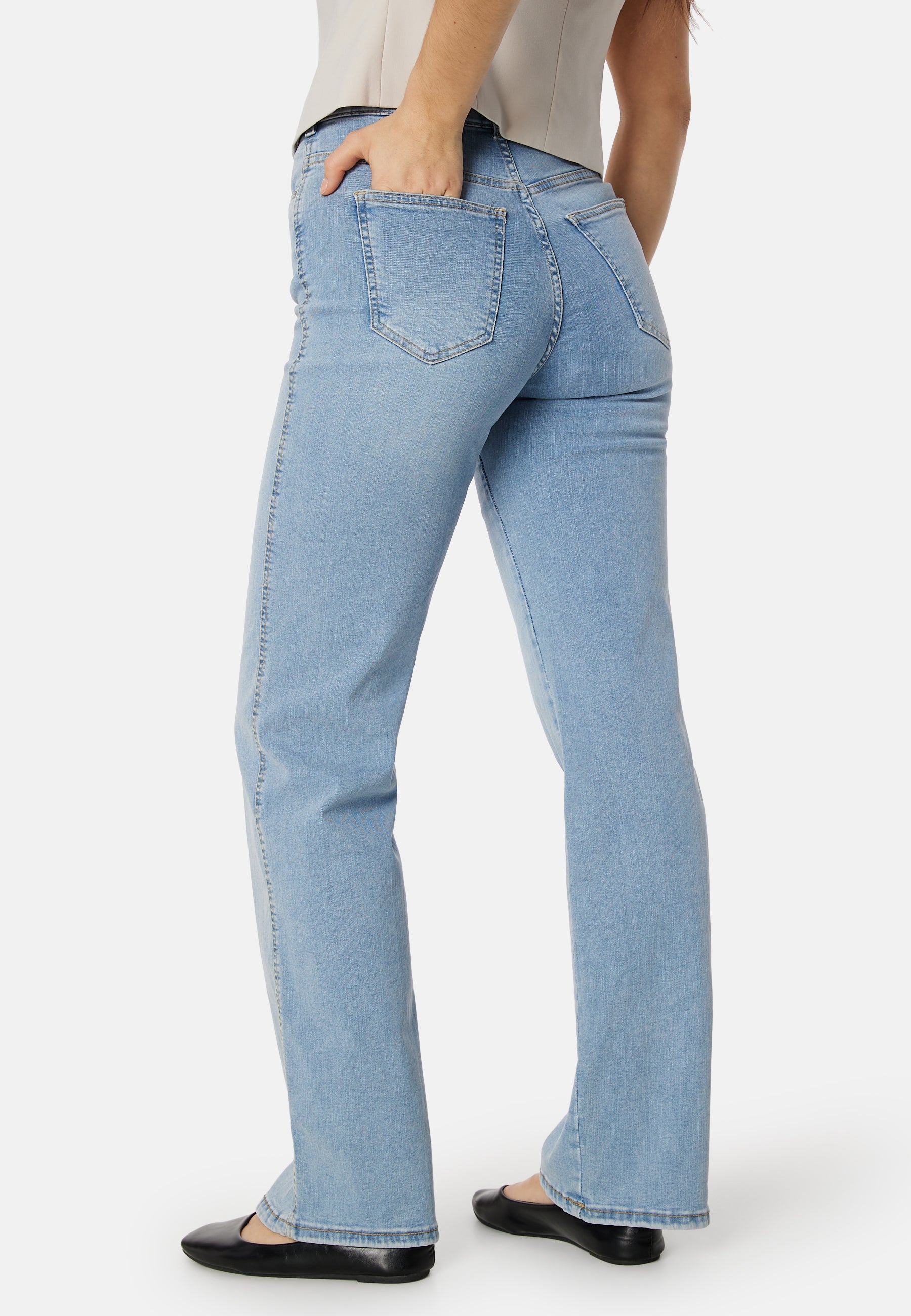 - Slim fit at the top with straight leg.