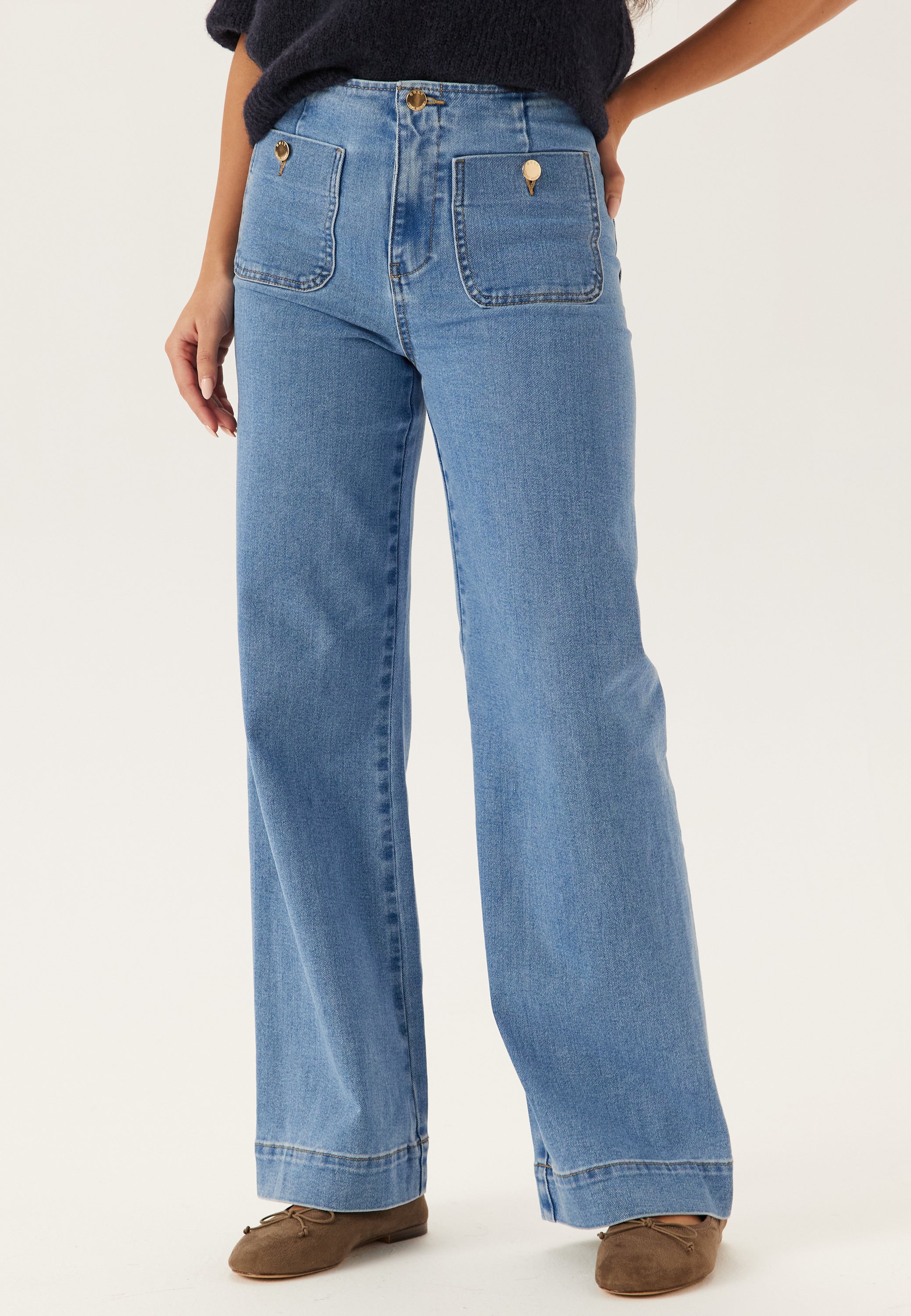 - Zip fly with button at the top