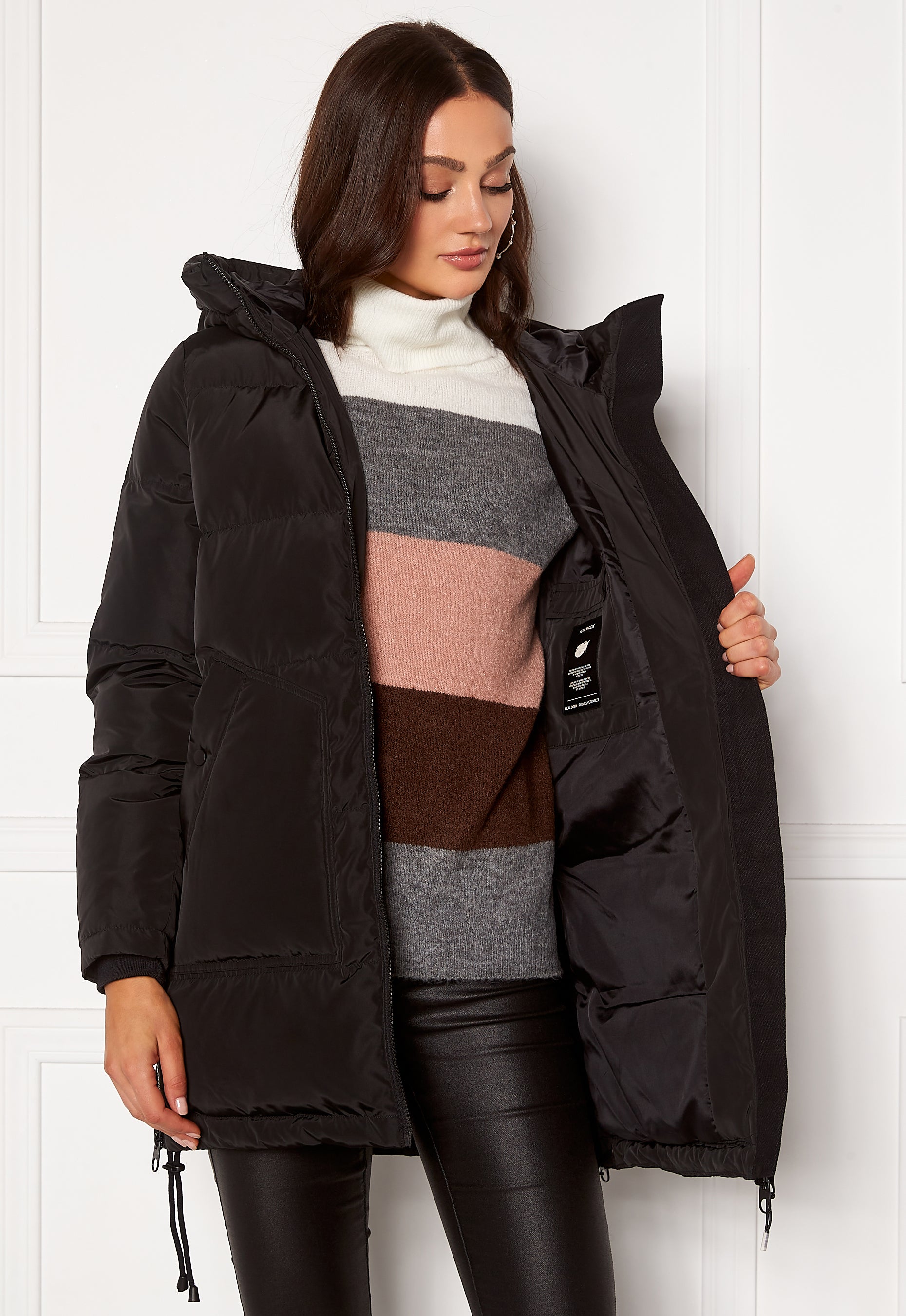 Gorgeous down jacket from VERO MODA. The jacket has a classical design with a hood. - Zipper at the front - Two front pockets with snap buttons - Comfortable cuffs at the wrists - An inside pocket - Side zipper - Drawsting at the sides at the lower hem - Logo on the left sleeve Back length from shoulder 82 cm in size S. The model is 178 cm tall and wears a size S. Machine wash at 30 degrees.