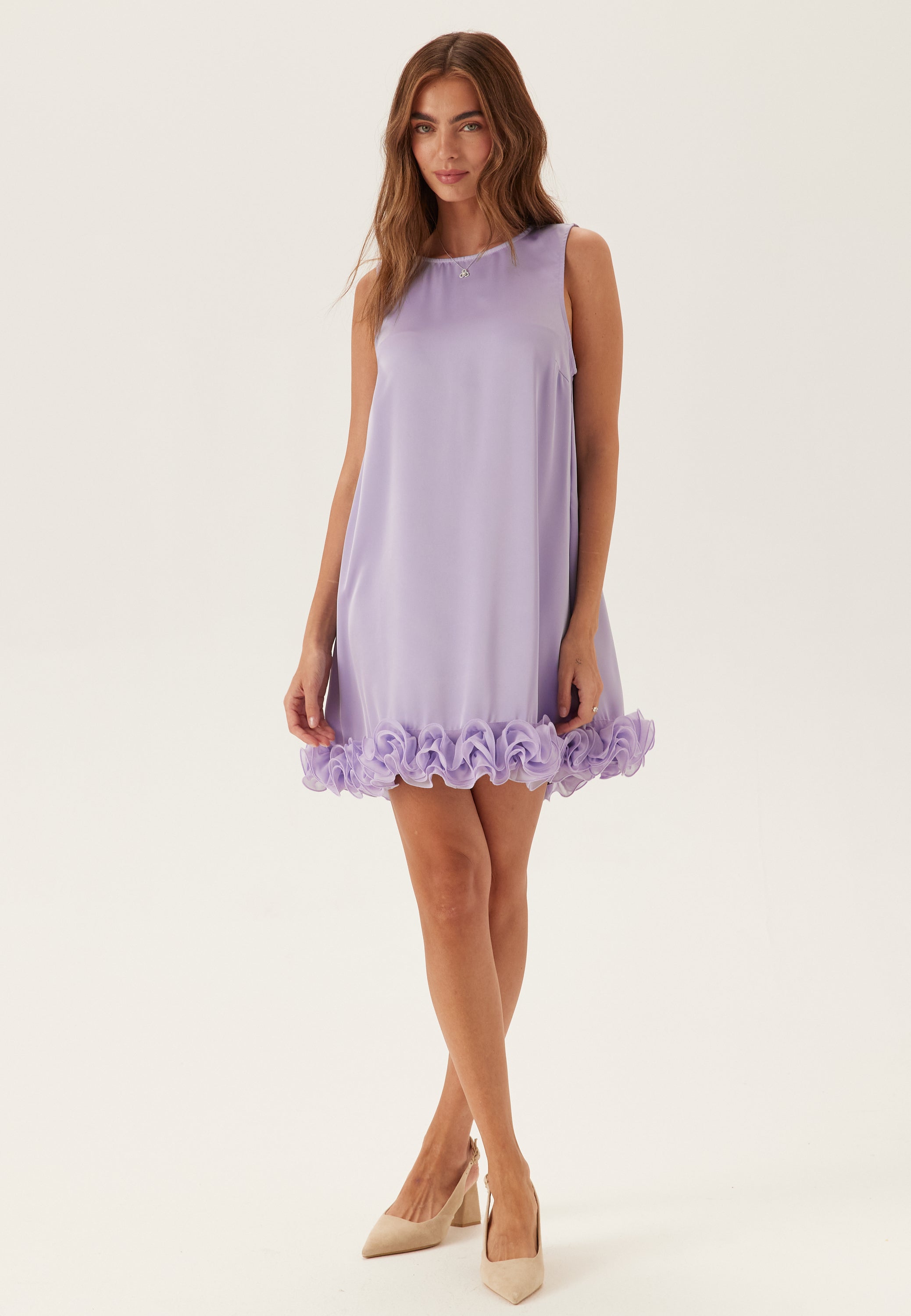 - A-line design with a flounce along the bottom edge