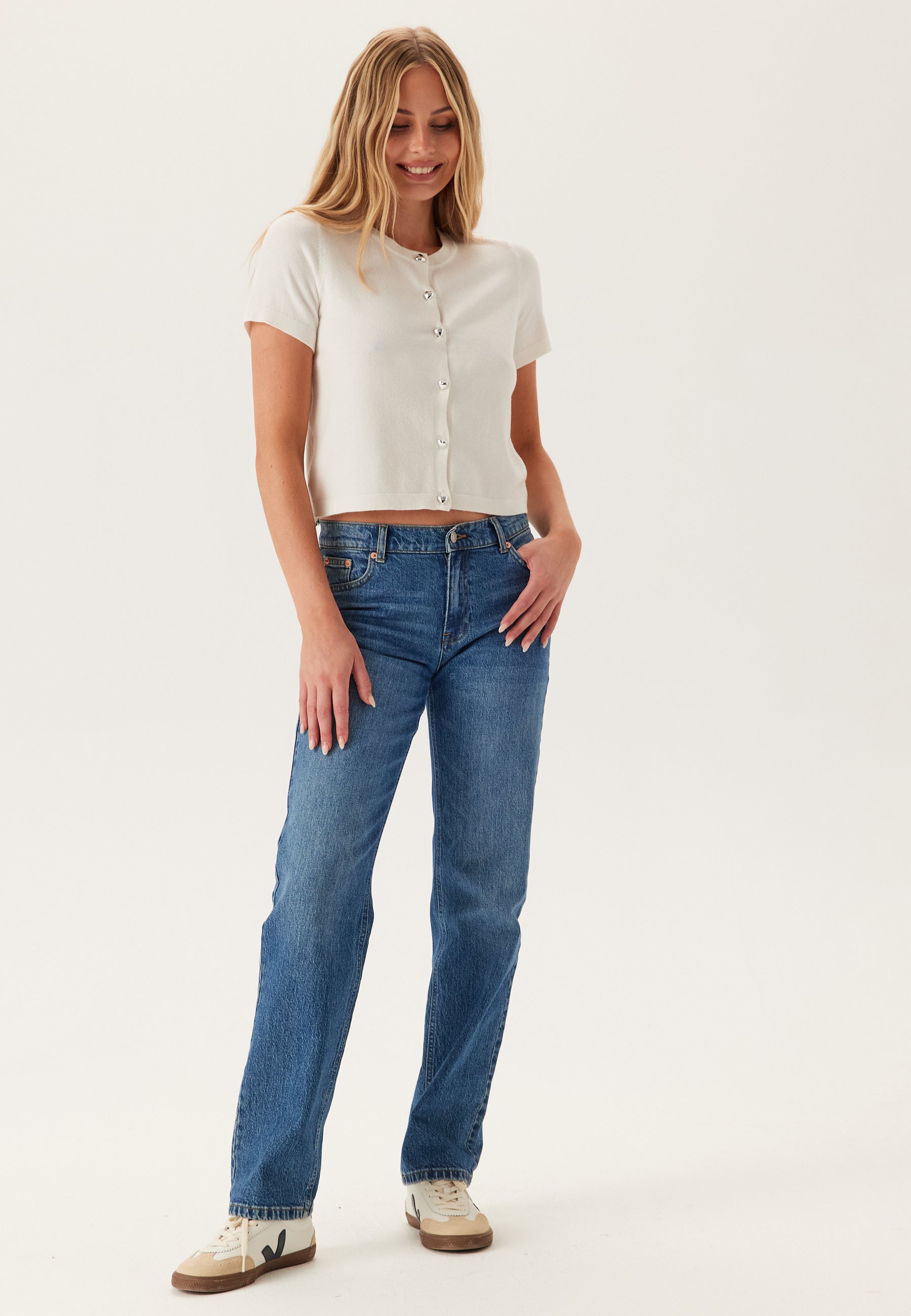 What makes this one stand out is the row of heart-shaped buttons at the front, adding a subtle playful detail to an otherwise simple silhouette. In the image, the light cream tone keeps the look fresh and easy to style, while the smooth knit gives it a neat finish that feels polished without trying too hard.