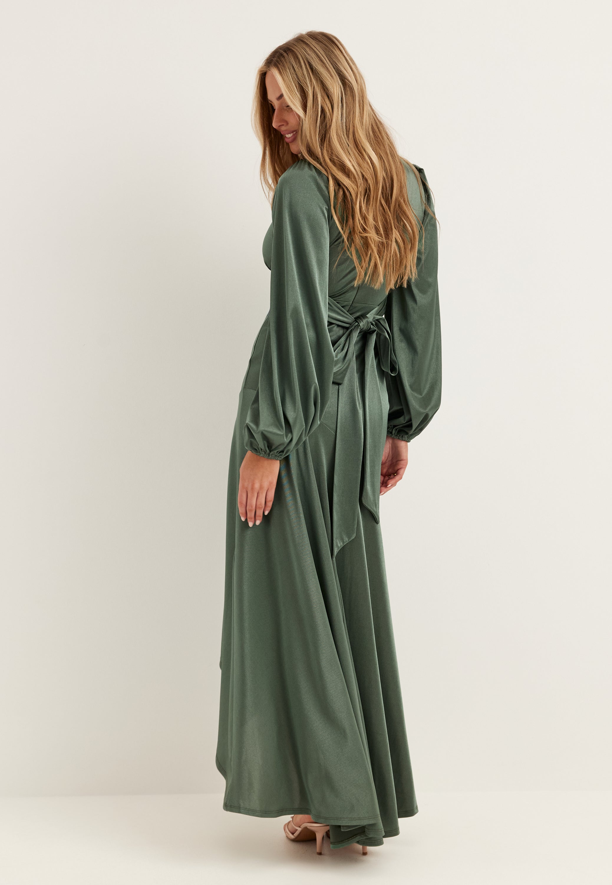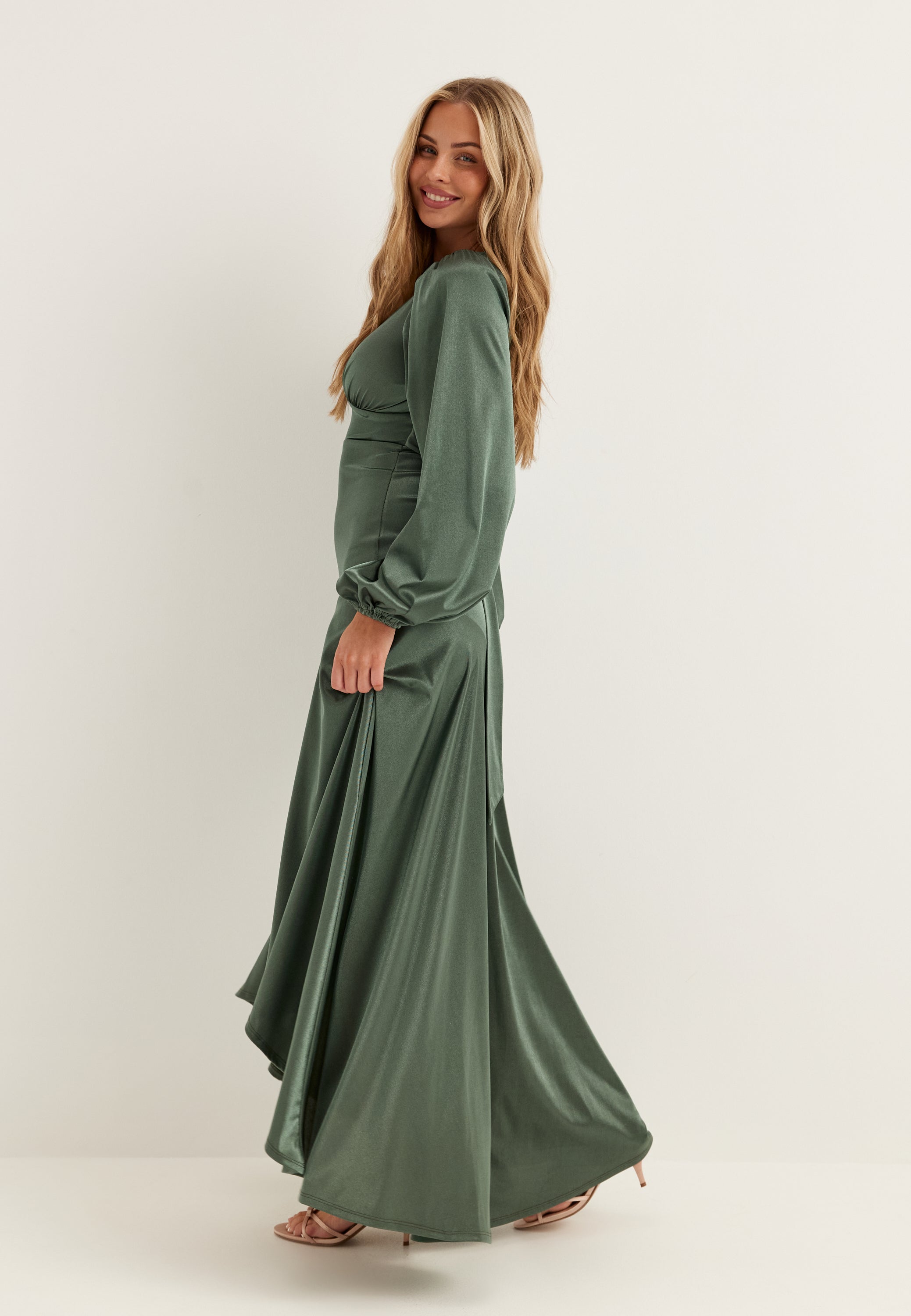 A great option if you want a long sleeve prom dress that feels feminine without being overdone, this style is easy to dress up with heels and simple jewellery. The draped satin finish, soft stretch, and swishy asymmetric hem make it stand out from plainer maxi dresses while still feeling timeless enough to wear again.