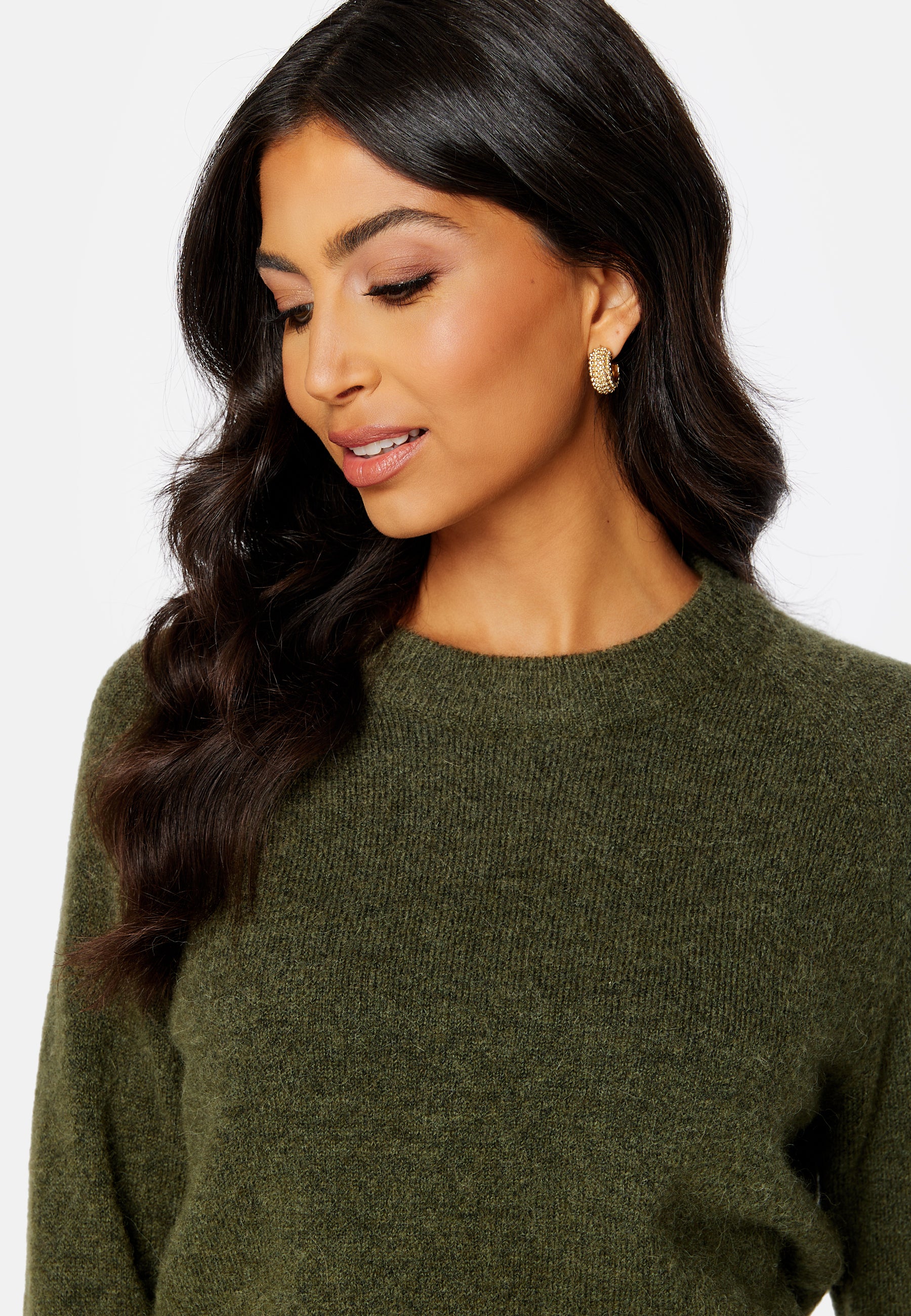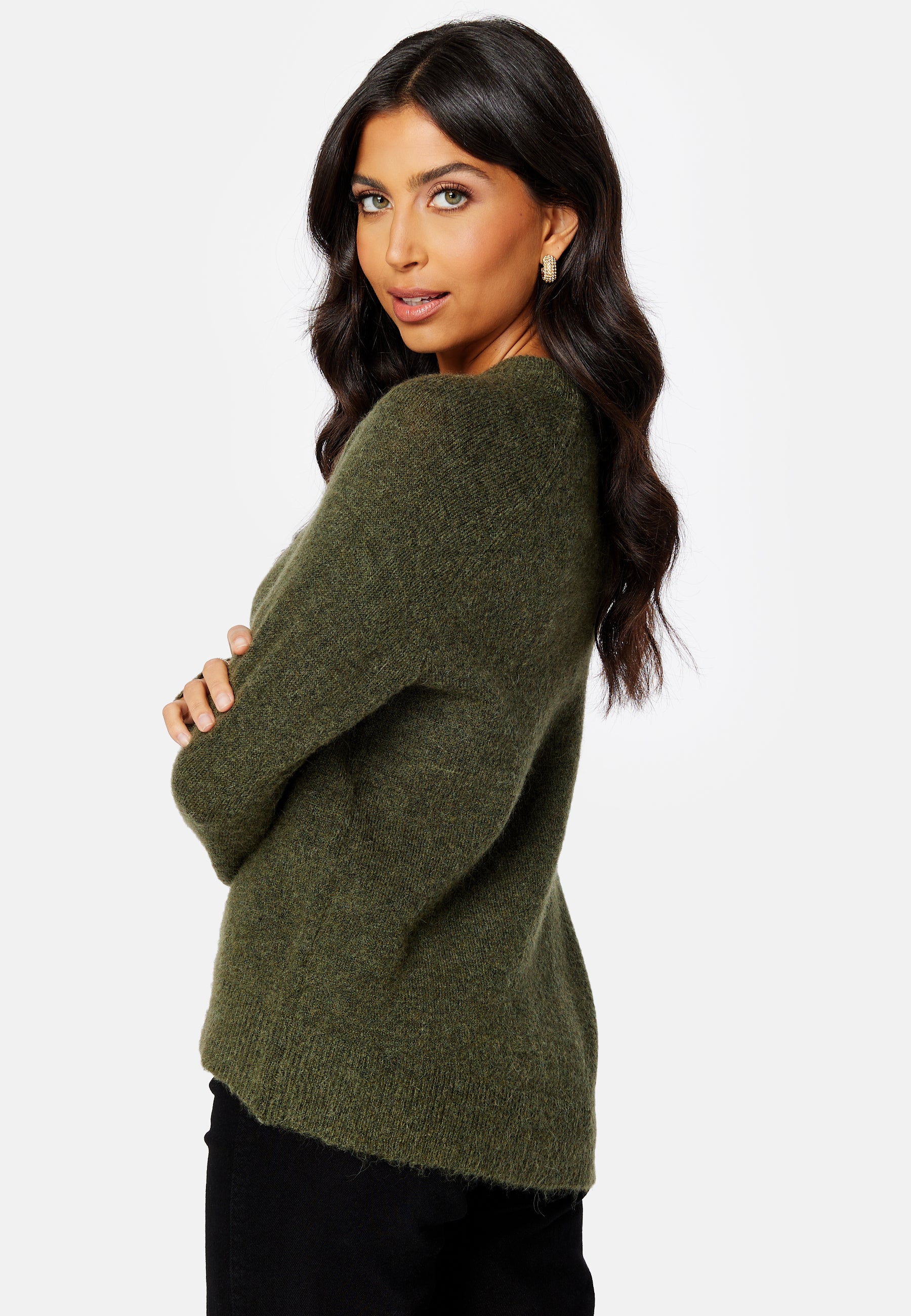 - Rib knit at the bottom, around the neckline and on the sleeve ends