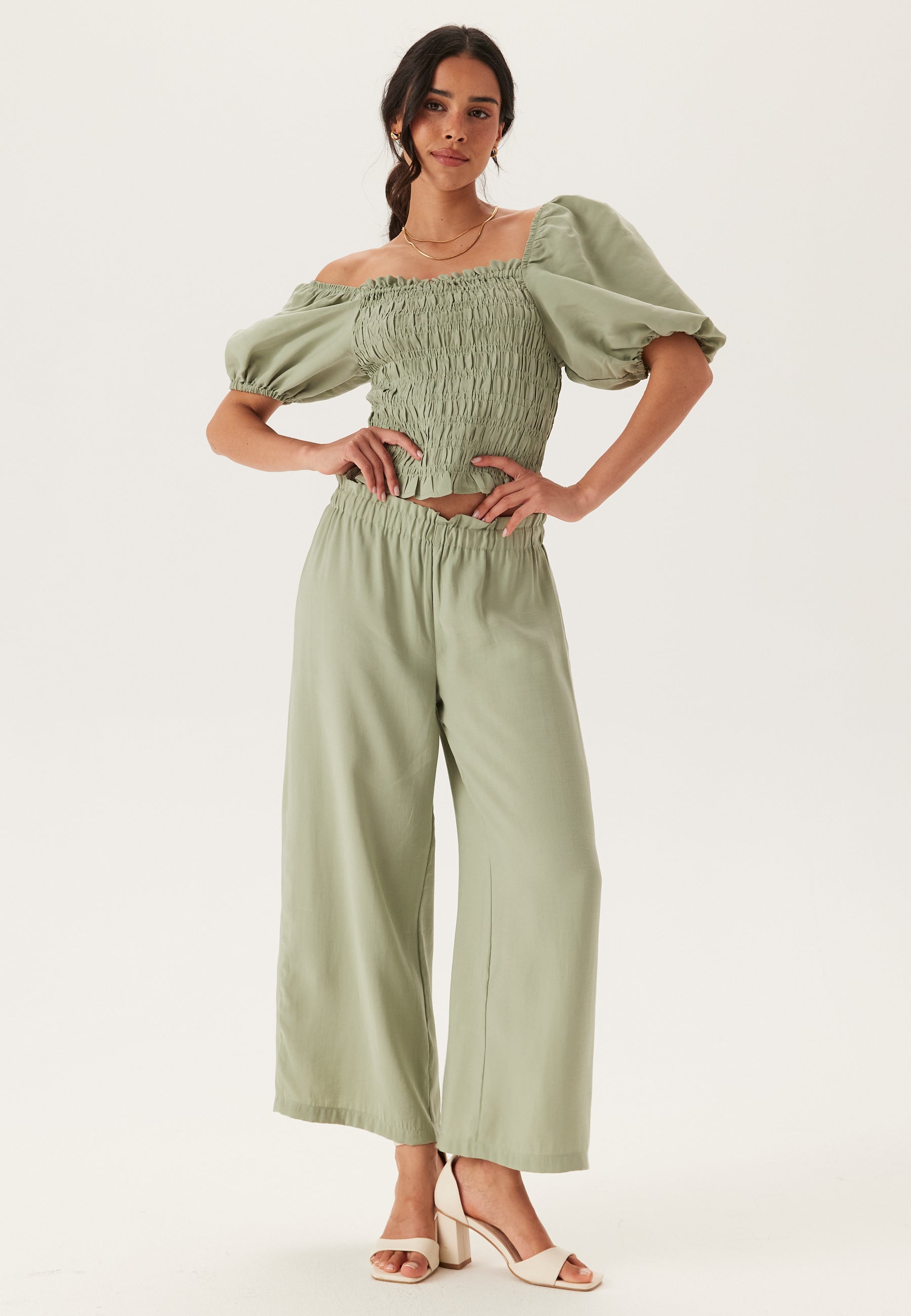 - Puff sleeves with elastic at the shoulder and on the sleeve ends