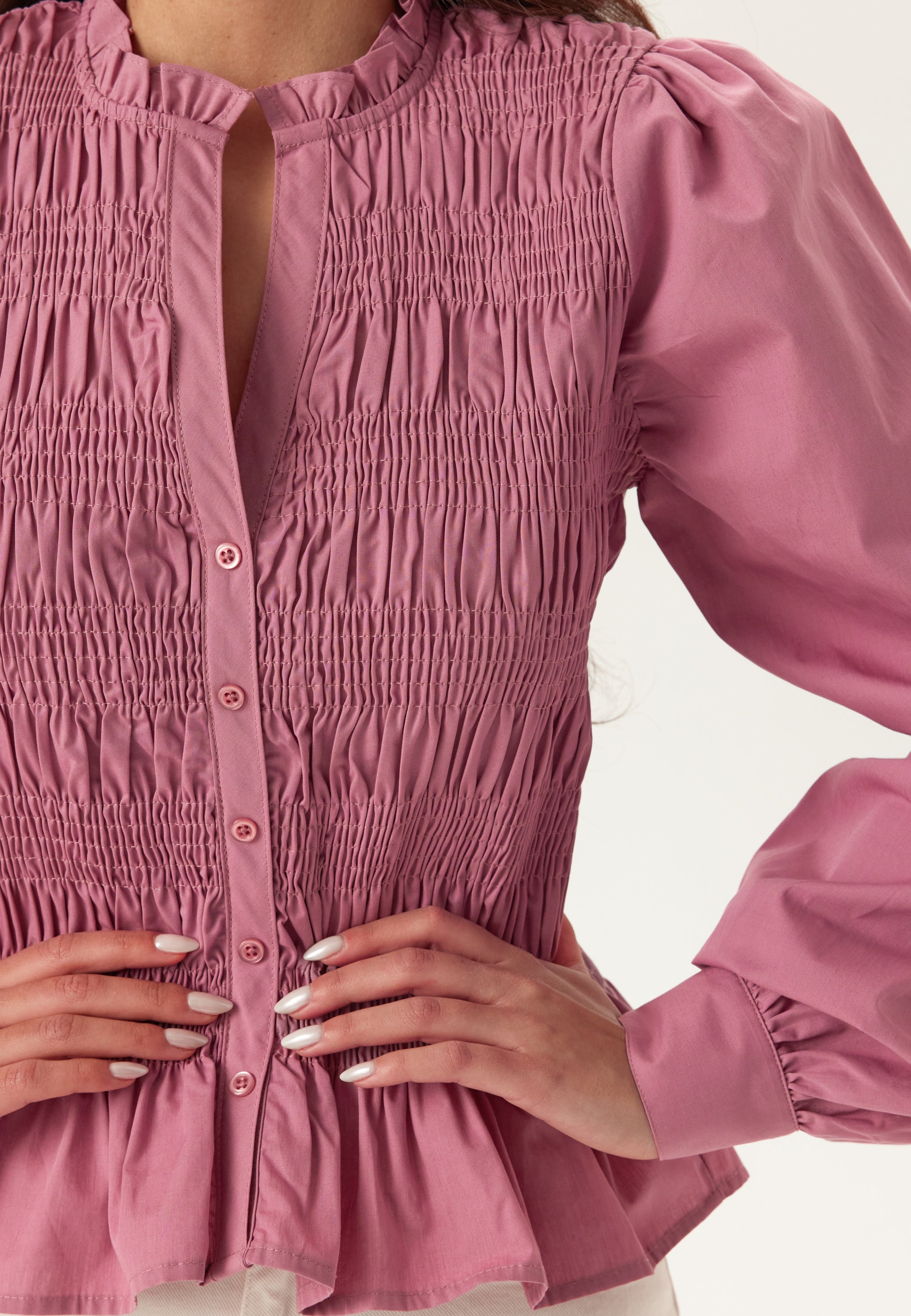 What makes it stand out is the contrast between the fitted shape and the fuller details: puff sleeves with cuffs at the sleeve ends, a softly flounced hem, and decorative non-functional buttons at the front. The old rose color adds a warm, feminine feel without being hard to style.