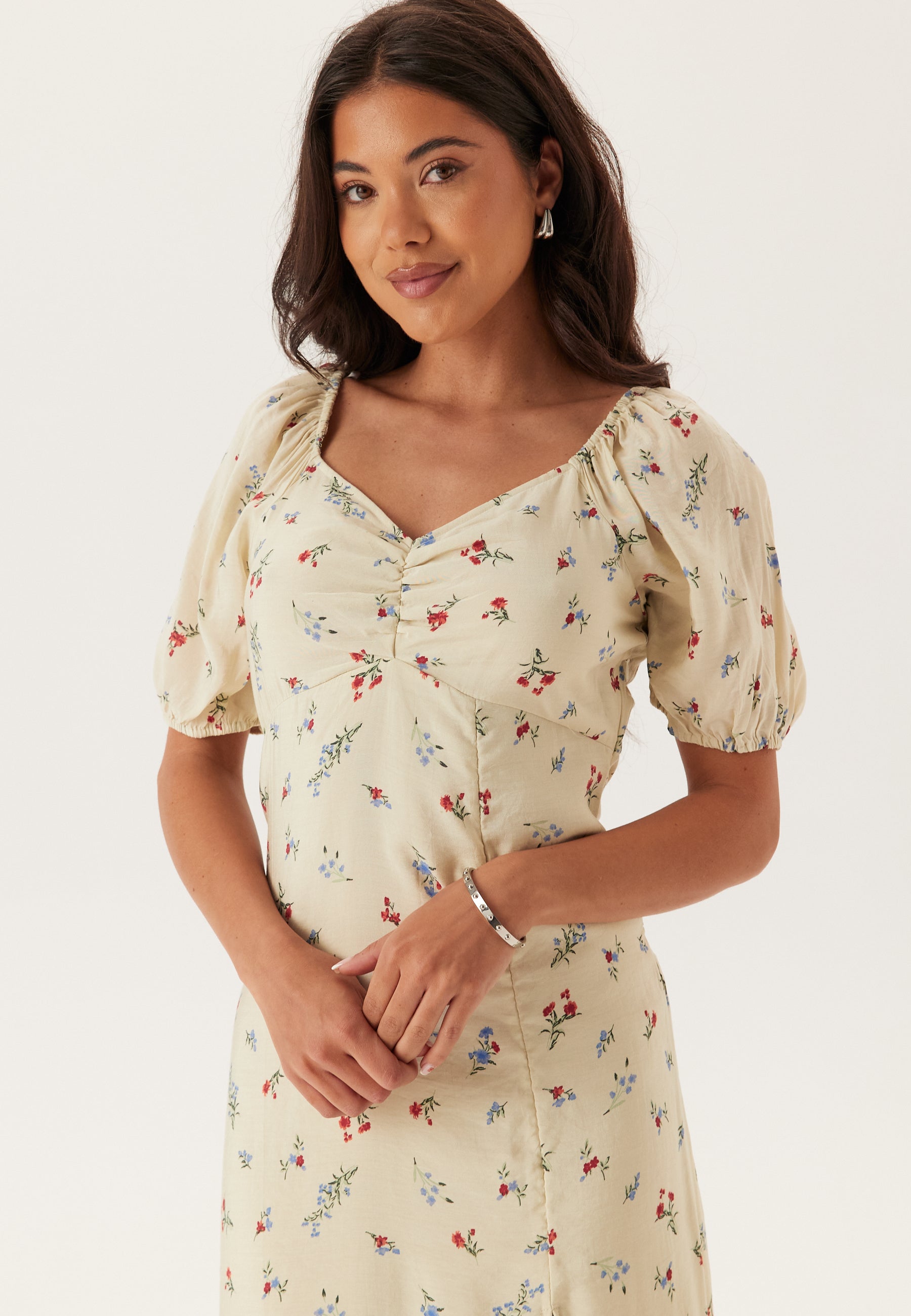 - Short puff sleeve with elastic along the bottom edge.