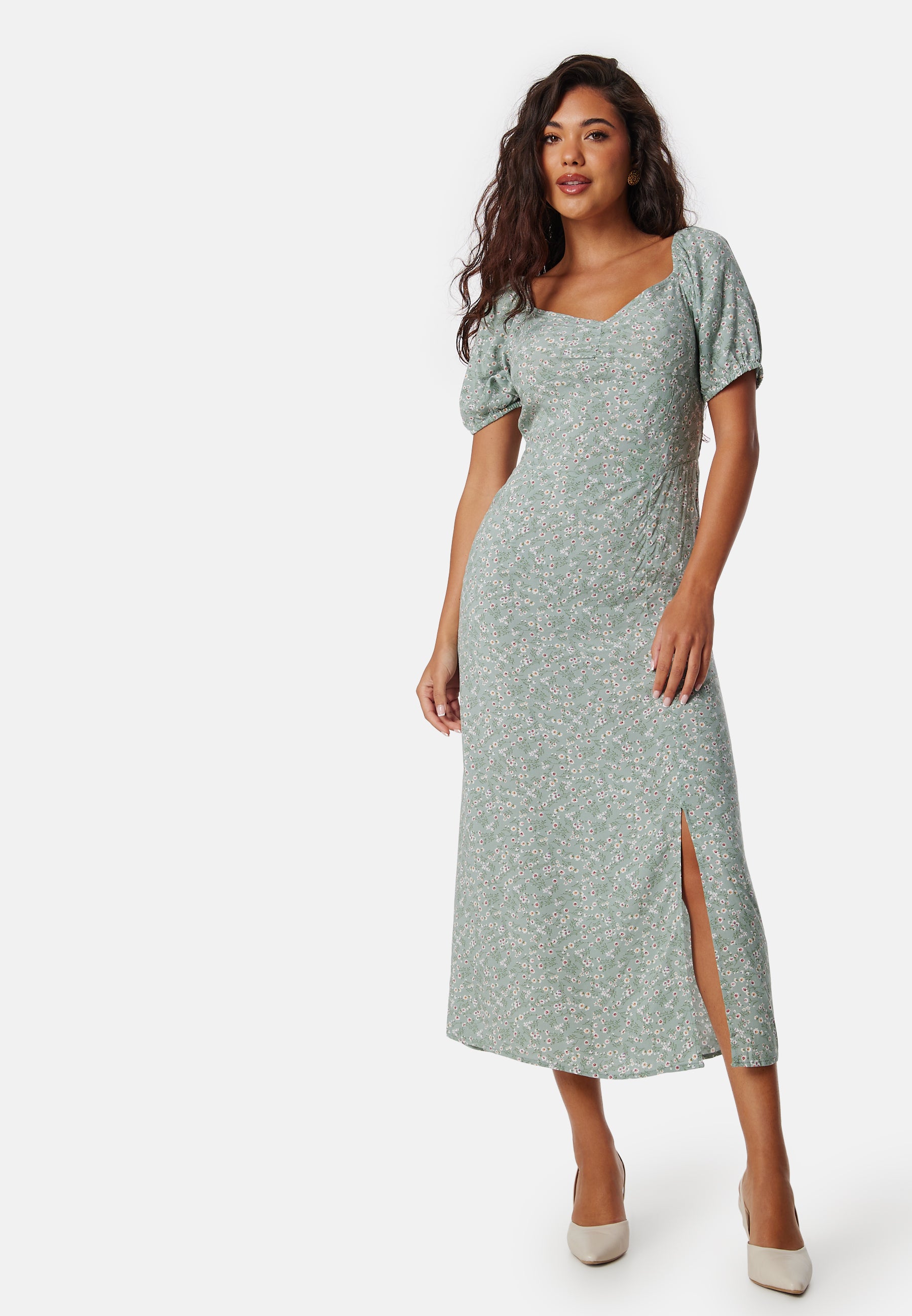 - Short puff sleeve with elastic on the sleeve ends.