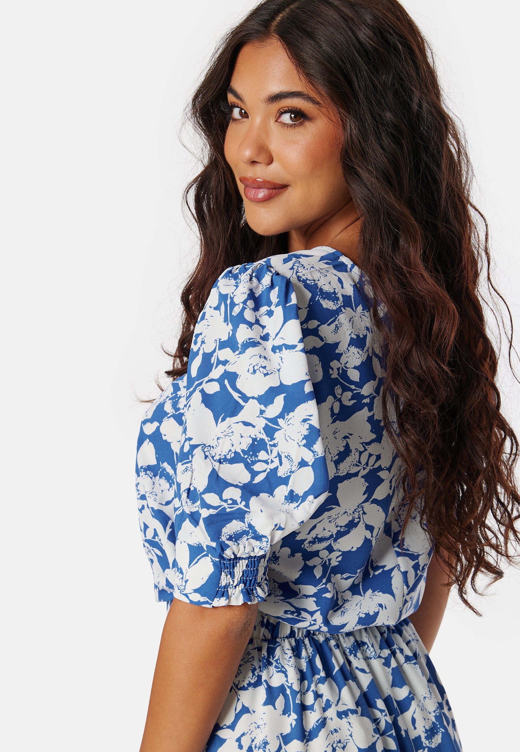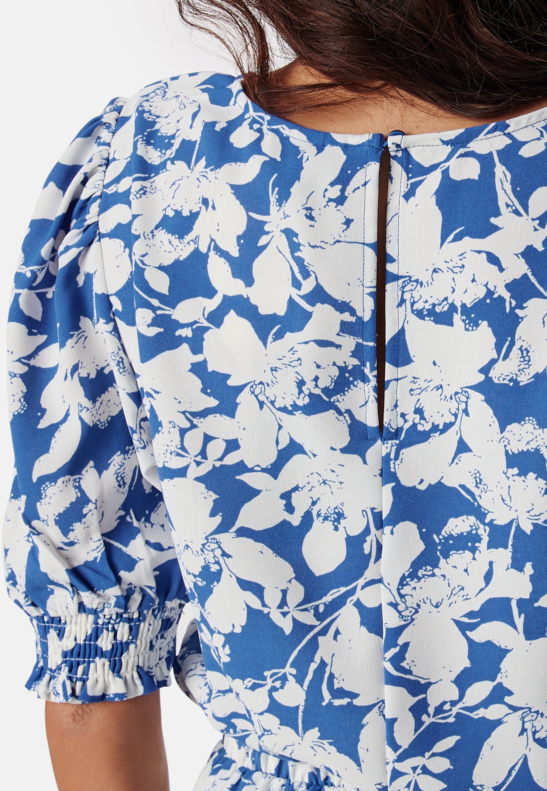 - Short puff sleeve with elastic on the sleeve ends.