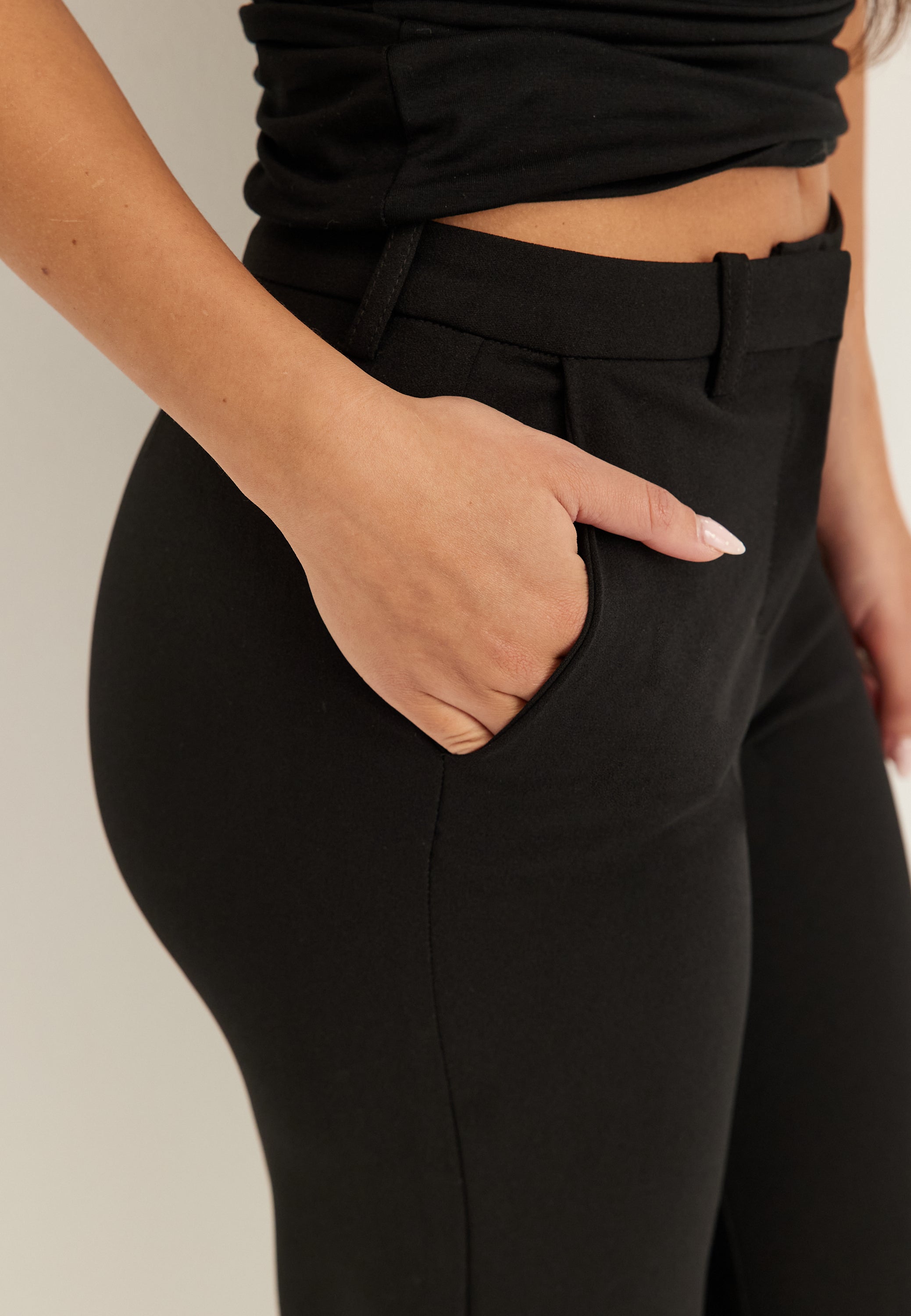 Cut with a neat waistband, belt loops, and a zip, hook and button closure, they have that classic tailored feel with practical details you’ll actually use, including two open side pockets. The simple black finish makes them especially easy to style with everything from a fitted top and heels to a blazer for a full matching set look.