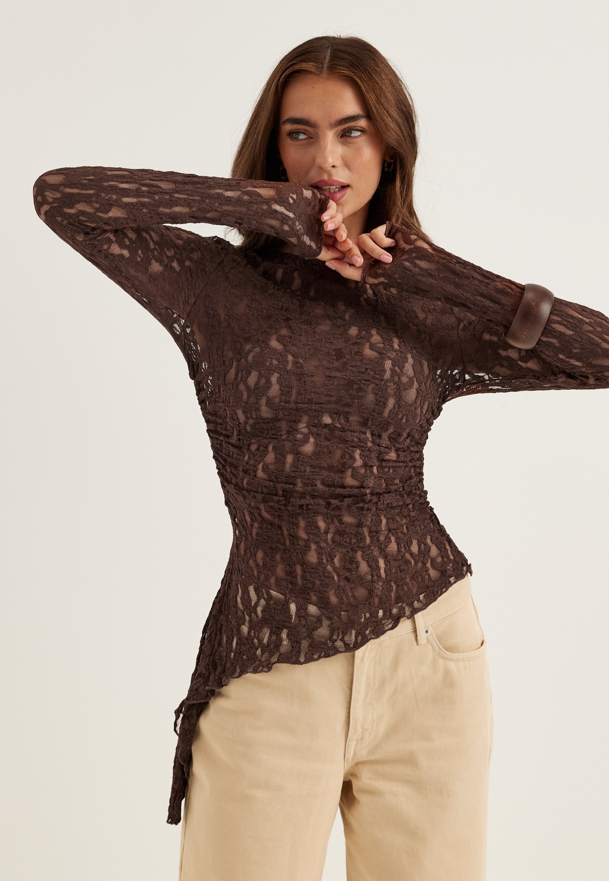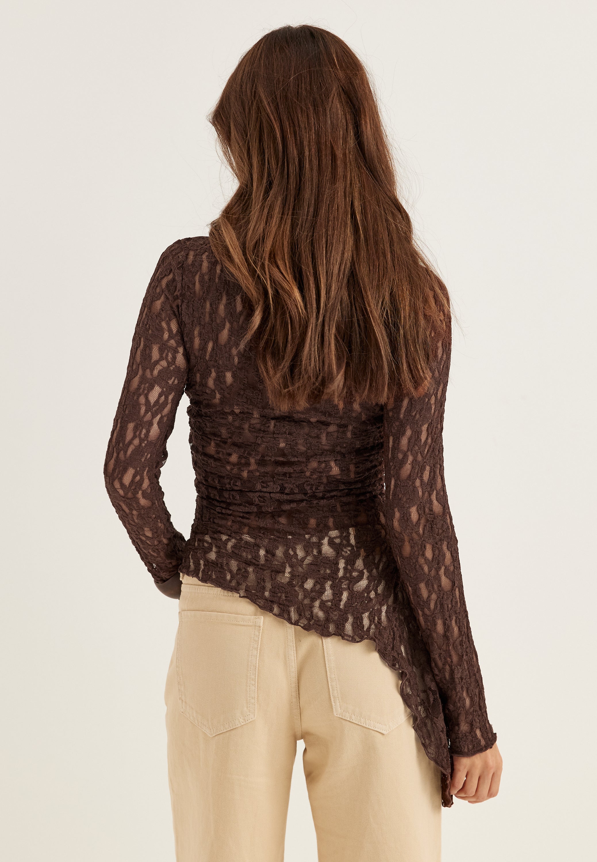 Den här långärmade spetstoppen är en figurnära festtopp som enkelt klär upp jeans, skräddade byxor eller en enkel kjol. Den transparenta spetsen och den asymmetriska fållen ger den ett mer modernt uttryck än en vanlig åtsittande topp, medan den nära passformen håller silhuetten smal och gör den enkel att bära i lager.