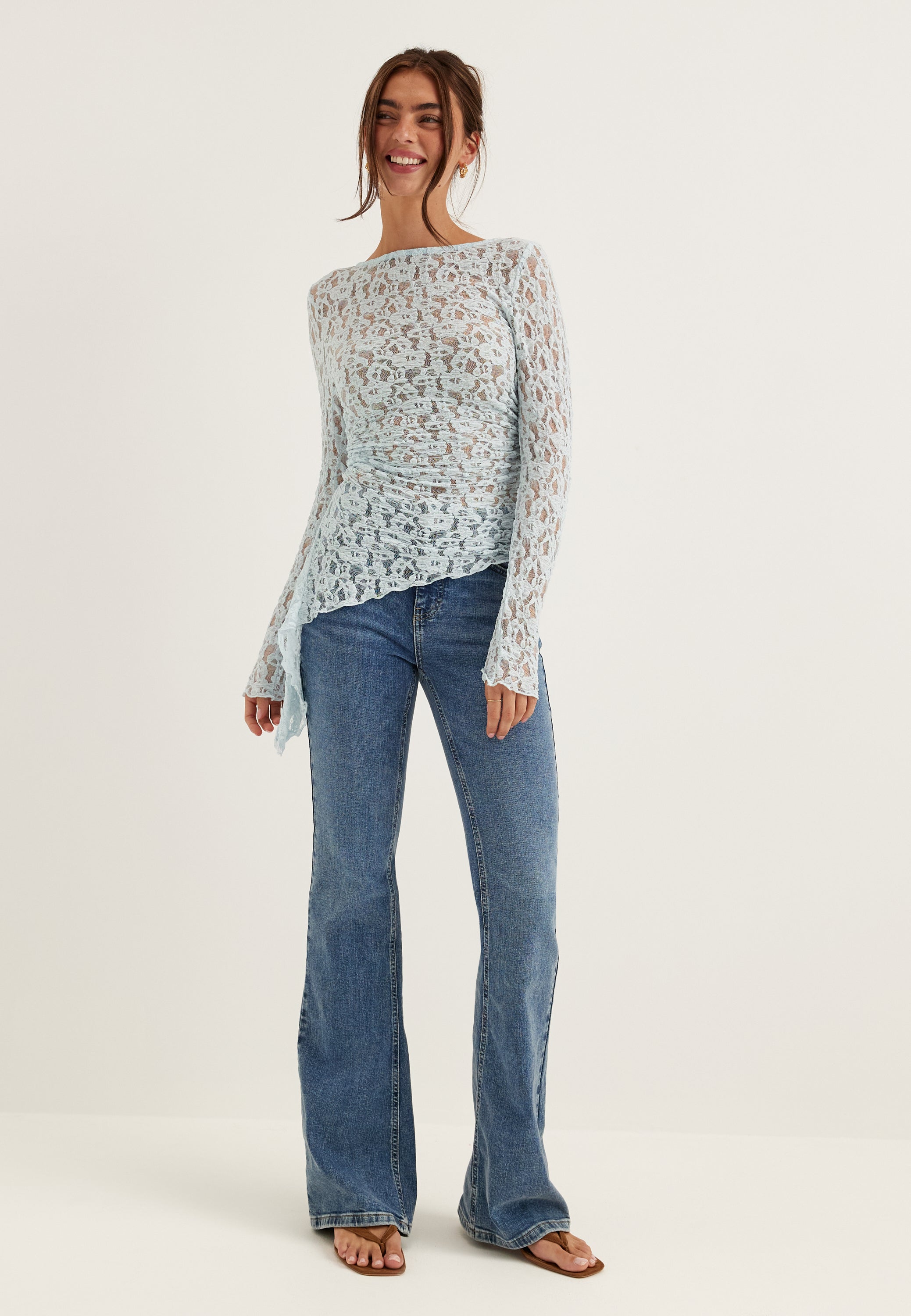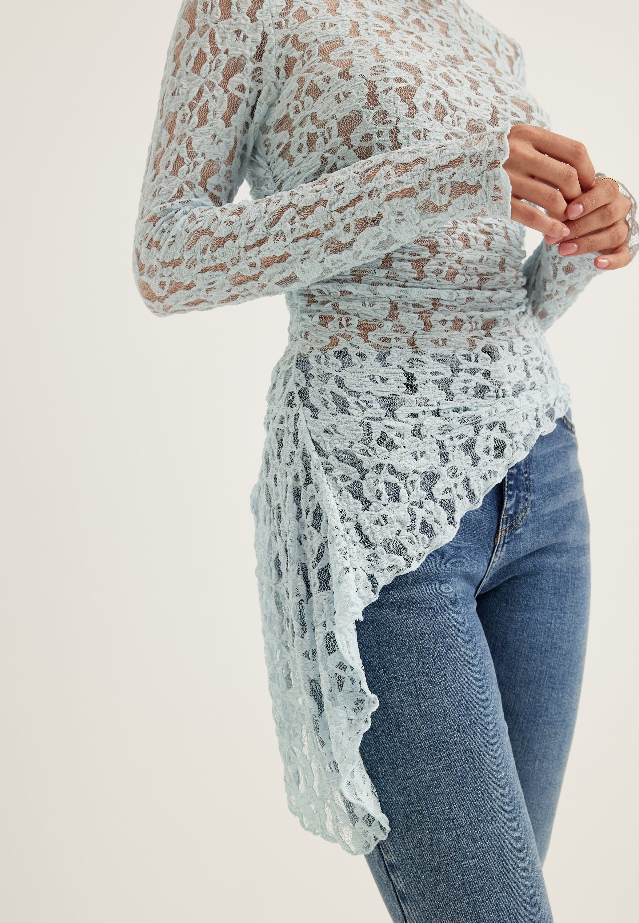 • Den här långärmade spetstoppen är en figurnära, transparent festtopp med asymmetrisk fåll, perfekt när du vill klä upp jeans, kostymbyxor eller en enkel kjol utan att behöva tänka för mycket. Den kroppsnära passformen ger en stilren silhuett, medan den mjuka ljusblå spetsen känns lättare och mer modern än en klassisk kvällstopp.