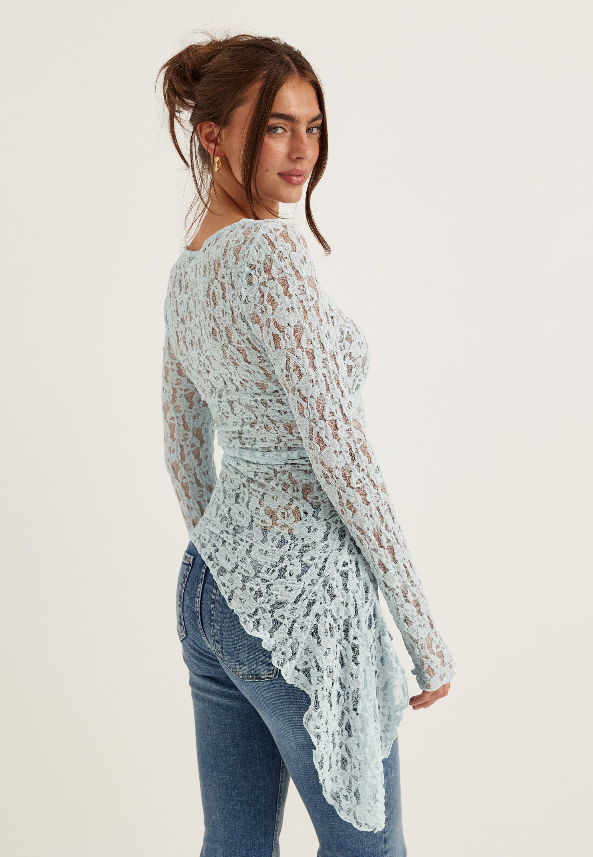 Den här långärmade spetstoppen är en figurnära, transparent festtopp med asymmetrisk fåll, perfekt när du vill klä upp jeans, kostymbyxor eller en enkel kjol utan att behöva tänka för mycket. Den kroppsnära passformen ger en stilren silhuett, medan den mjuka ljusblå spetsen känns lättare och mer modern än en klassisk kvällstopp.
