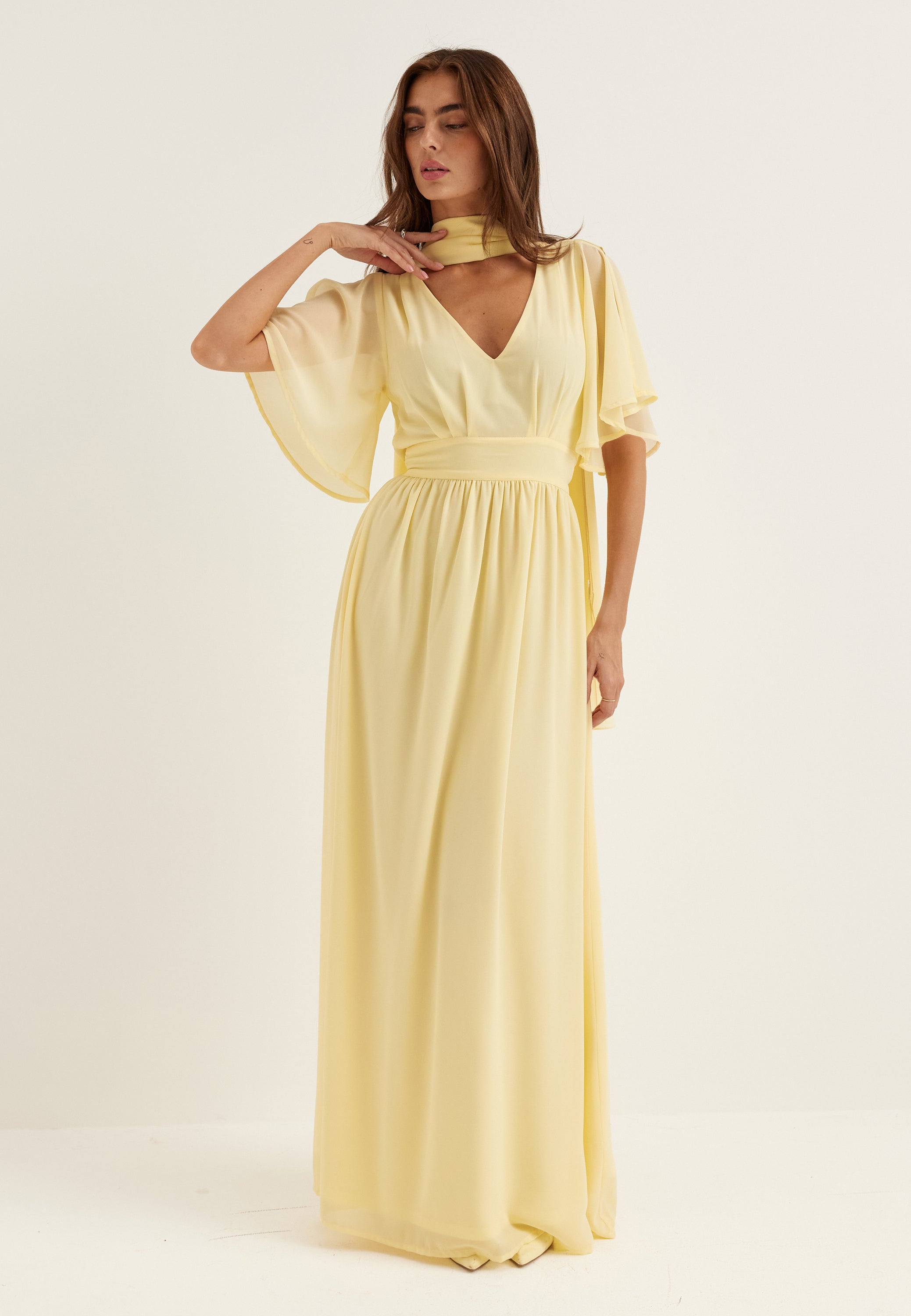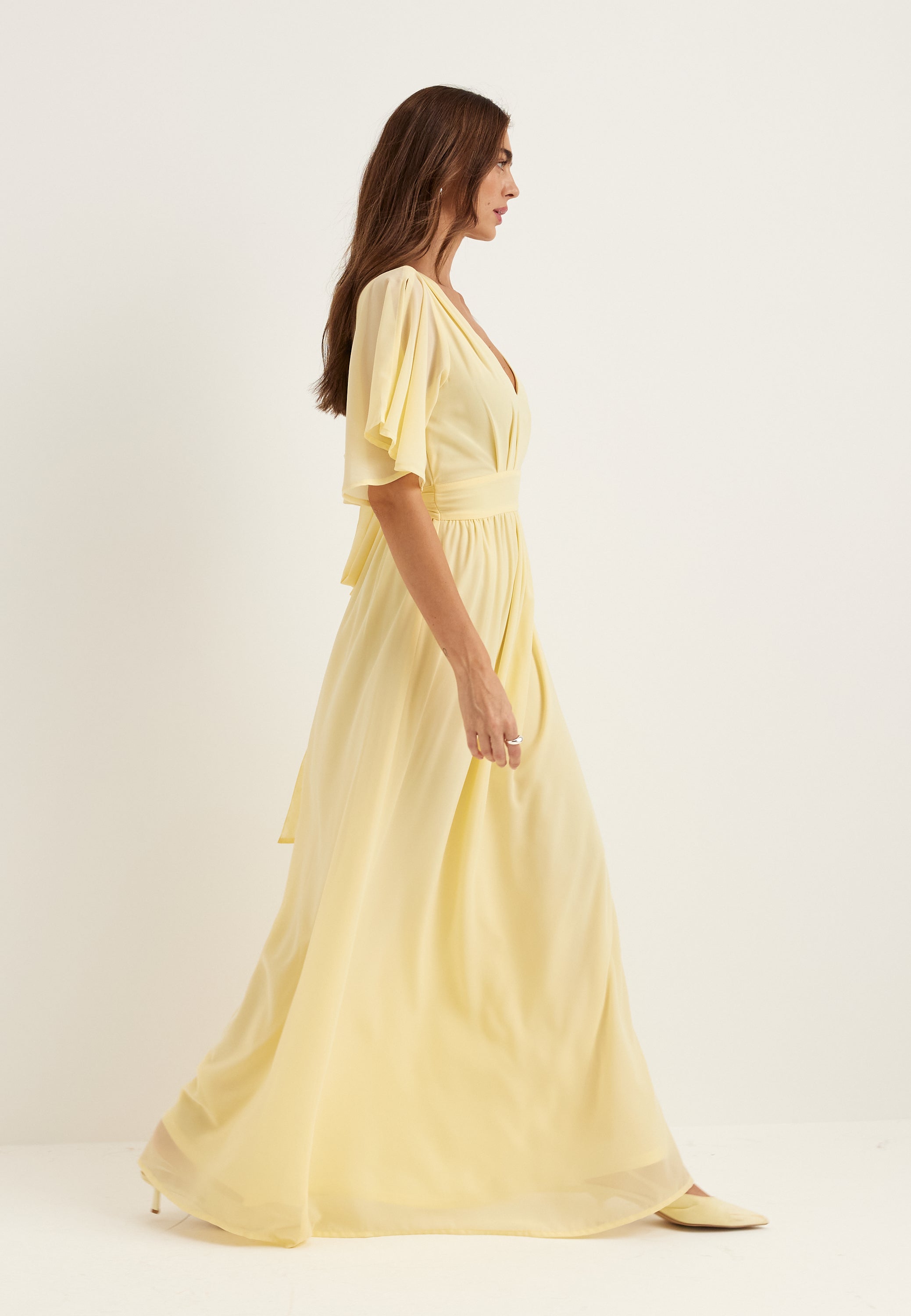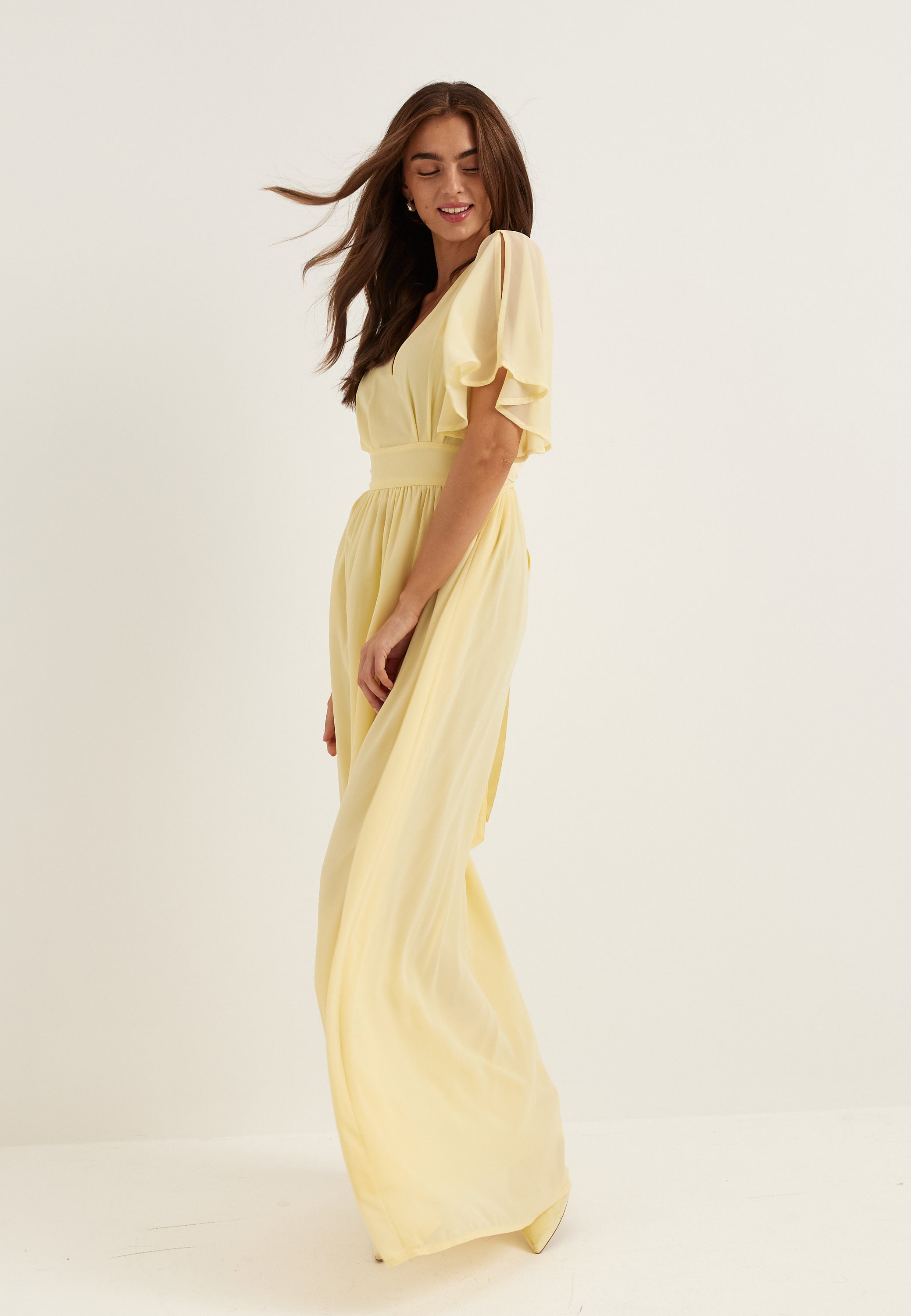 Den här gula maxiklänningen i chiffong är som gjord för bröllop, tärnuppdrag, bal och andra uppklädda kvällar när du vill ha något lätt, smickrande och enkelt att bära. Den mjuka V-ringningen, de svepande fjärilsärmarna och den hellånga kjolen ger ett luftigt uttryck, medan den höga elastiska midjan skapar en fin silhuett utan att kännas stram.