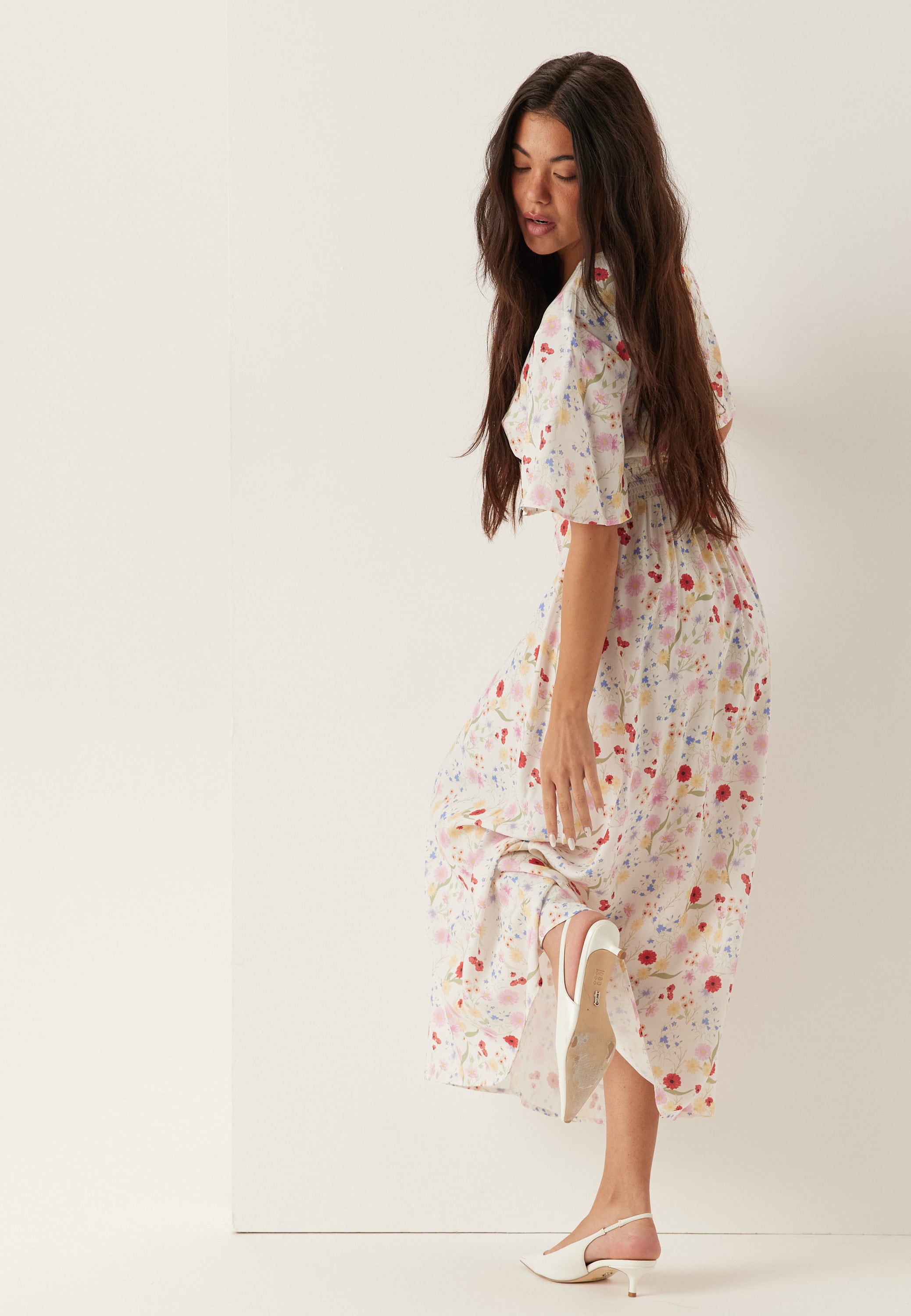 • Den här blommiga maxiklänningen är en enkel sommarklänning för trädgårdsfester, semestrar och middagar i värmen när du vill ha något lätt, feminint och bekvämt. Den mjuka vävda viskosen faller fint i kjolen, medan V-ringningen och de luftiga fjärilsärmarna ger en smickrande och ledig känsla.