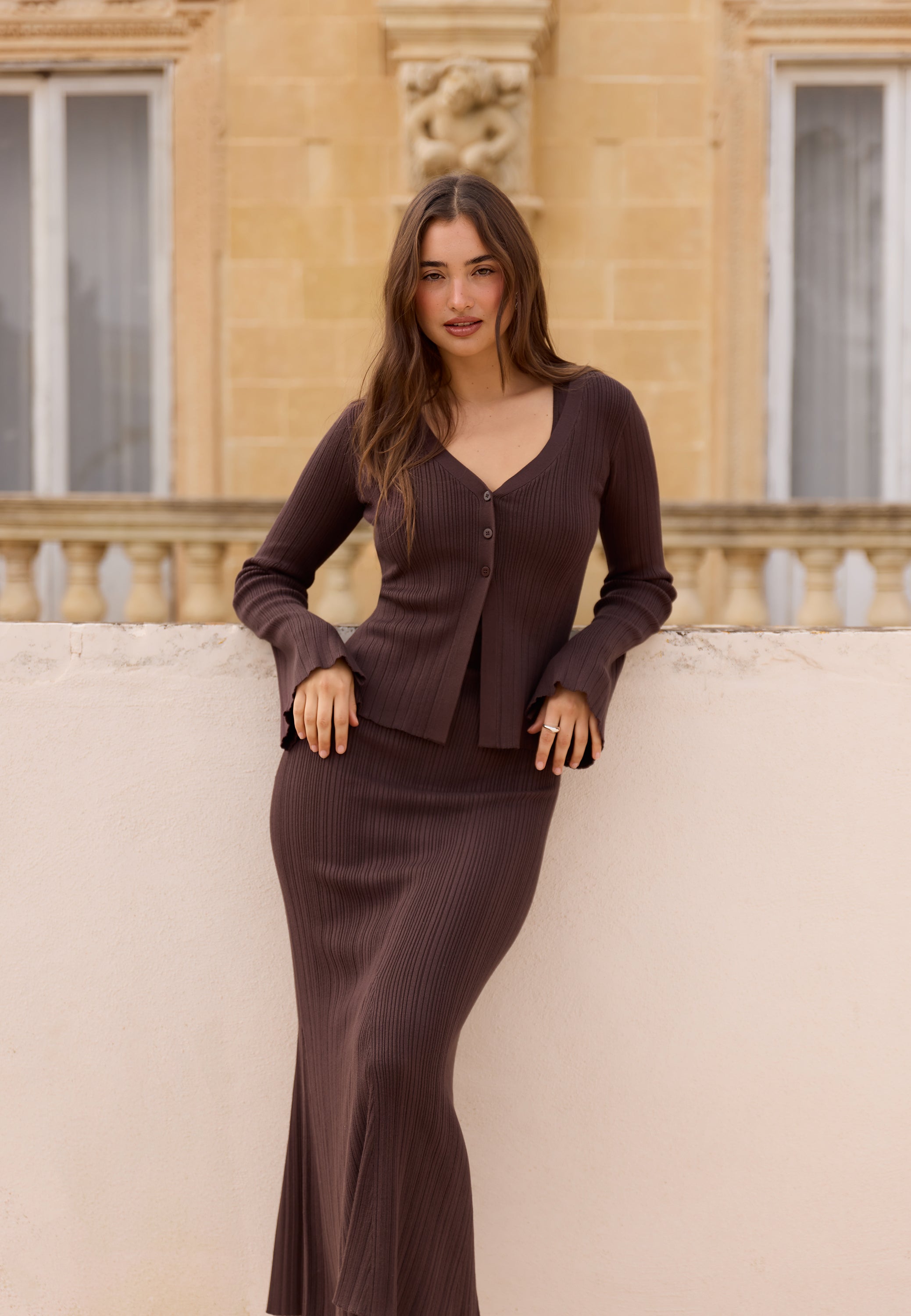 Den här ribbstickade koftan har en figurnära passform och knäppning framtill – perfekt till kjol, byxor eller jeans när du vill ha något mjukt, smickrande och enkelt att klä upp. Den djupa V-ringningen och den kroppsnära formen ger ett mer genomtänkt och stylat uttryck än en vanlig stickad tröja, medan den mörkbruna tonen gör den extra lätt att matcha med neutrala färger.
