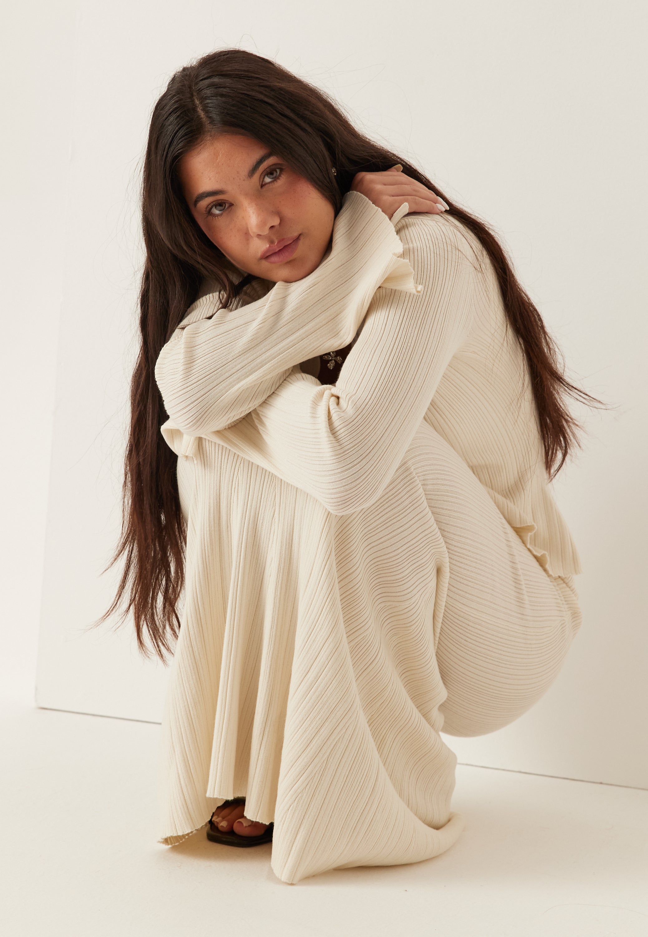 Den kroppsnära passformen ger en slät, skulpterad silhuett, och den ribbade strukturen tillför precis lagom med detalj för att kännas lite mer speciell än en enkel stickad klänning. I en ljus krämfärgad ton passar den lika fint med platta sandaler på dagen som med klackar och enkla smycken på kvällen.
