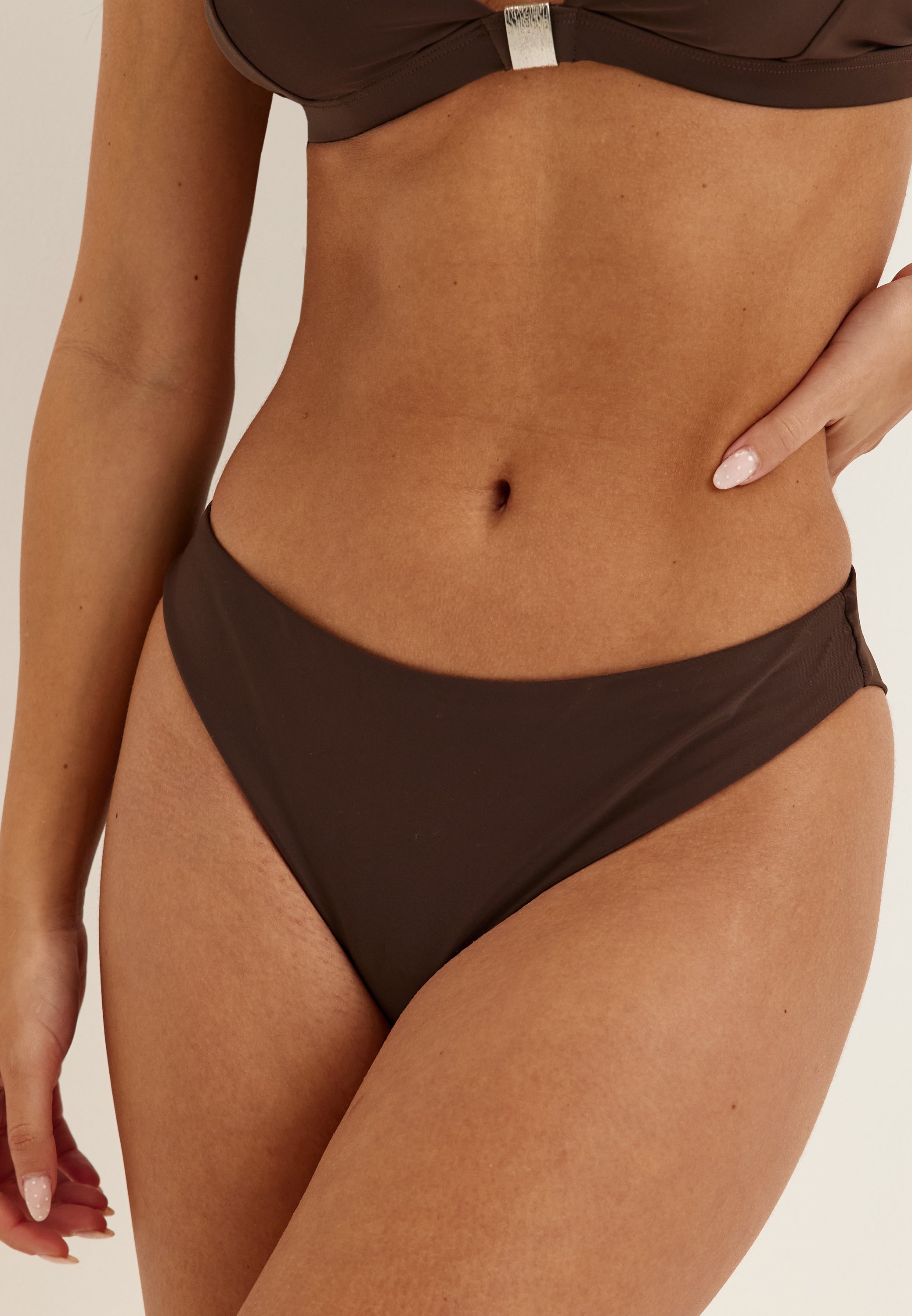 De här cheeky bikinitrosorna med låg midja är gjorda för stranddagar, häng vid poolen och soliga resor när du vill ha en ren och smickrande passform med lite mer attityd. Den släta bruna ytan ger dem en stilren, minimalistisk look som är enkel att matcha, medan cheeky-skärningen håller silhuetten modern och självsäker.