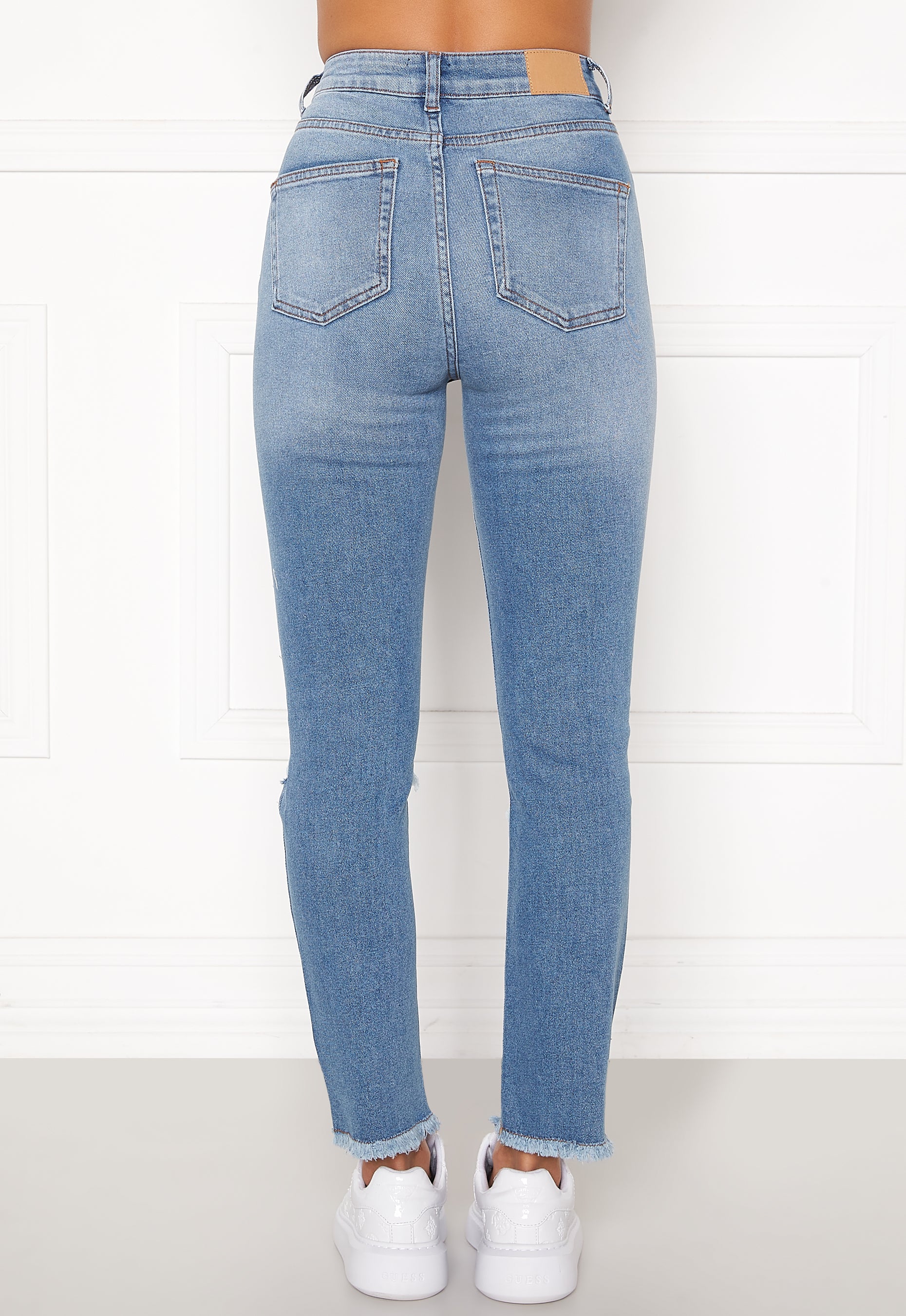 • 5-pocket jeans with distressed knees.
