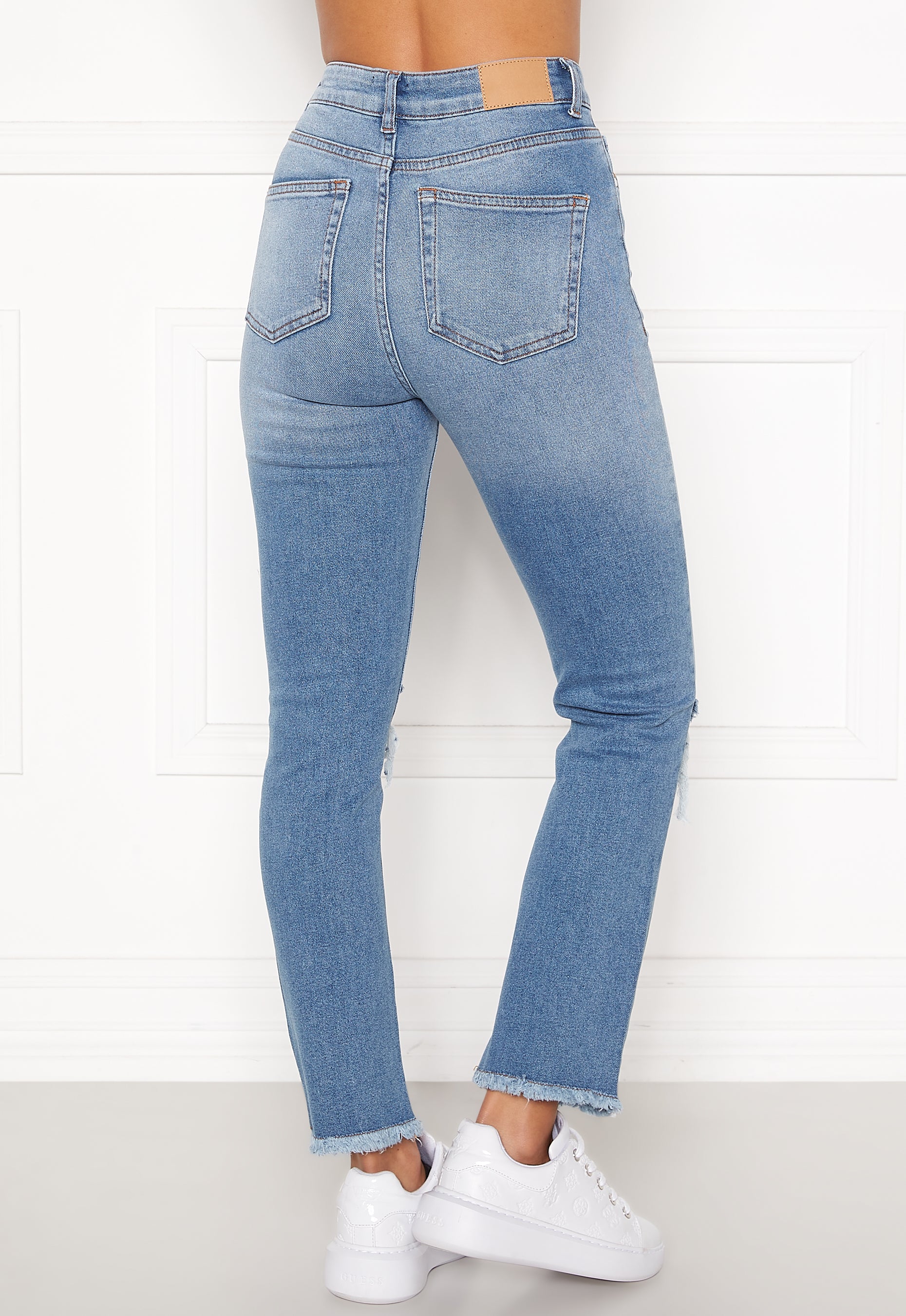 5-pocket jeans with distressed knees.
