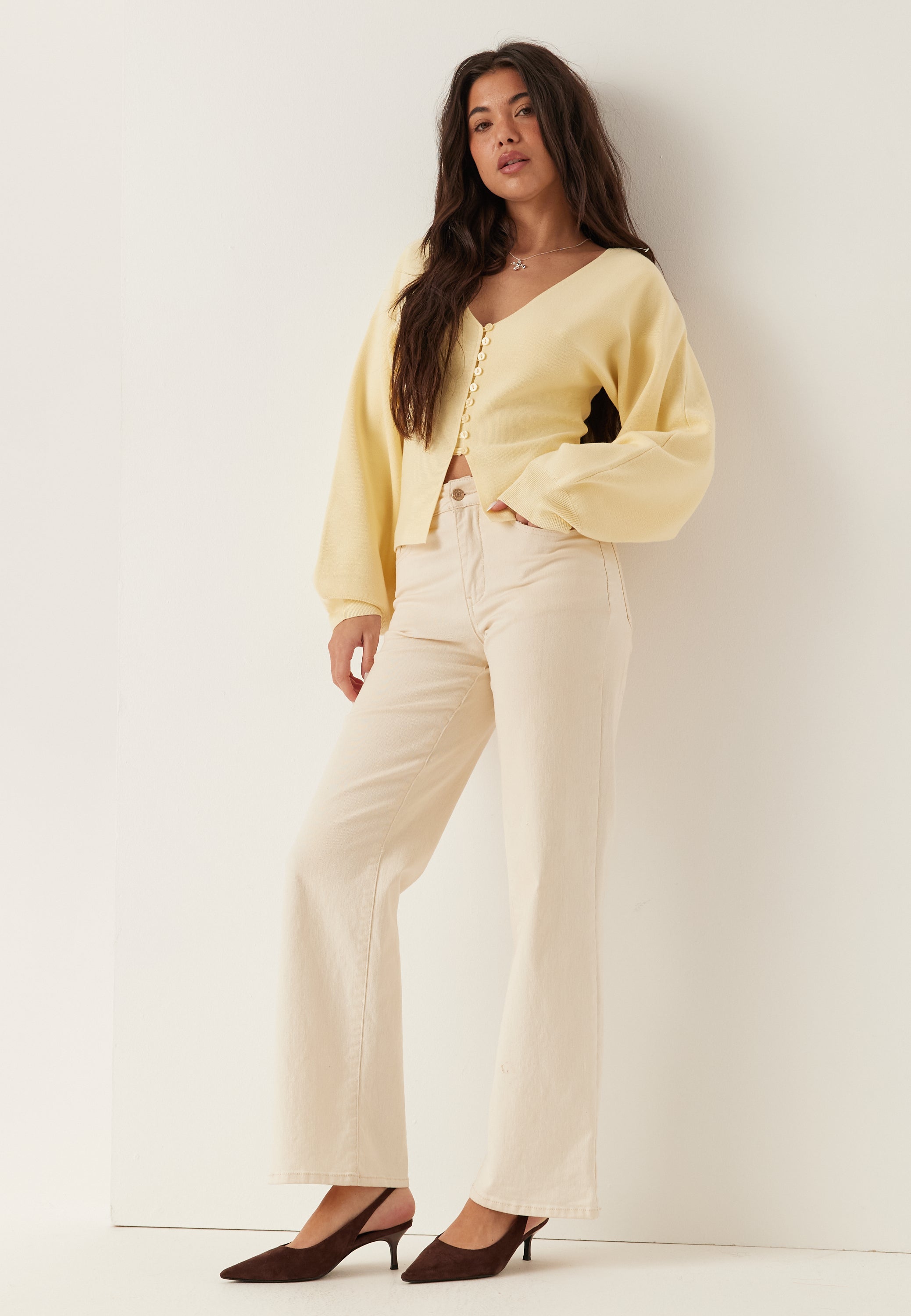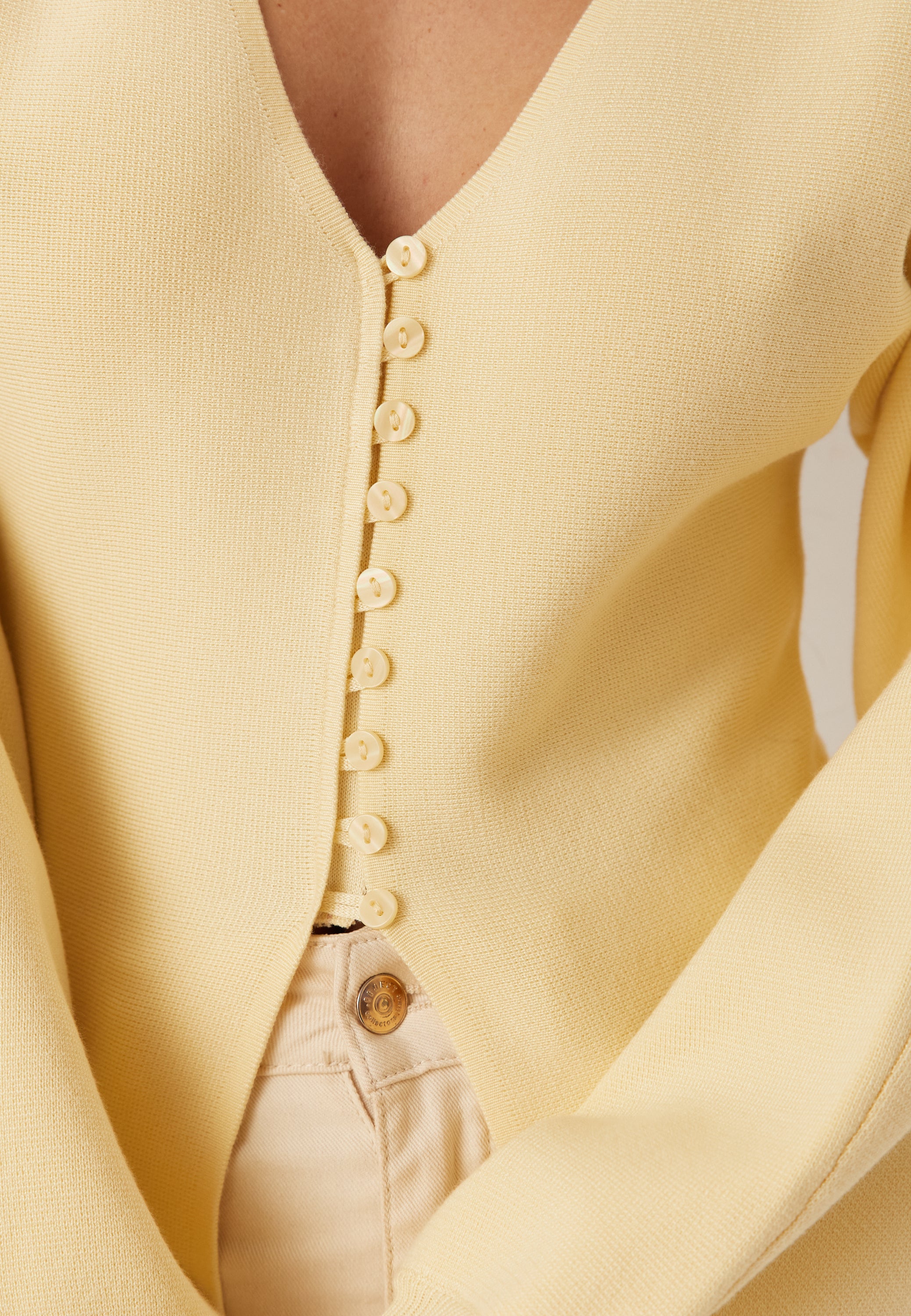 Den här finstickade koftan är ett mjukt och stretchigt lager med knäppning framtill som passar perfekt till vardags. Den har en ren, kroppsnära passform som funkar lika bra till jeans som över en klänning. Den ljusgula tonen ger ett fräscht och lätt intryck, medan den snygga silhuetten gör den enkel att klä upp till middagen eller hålla avslappnad på dagen.