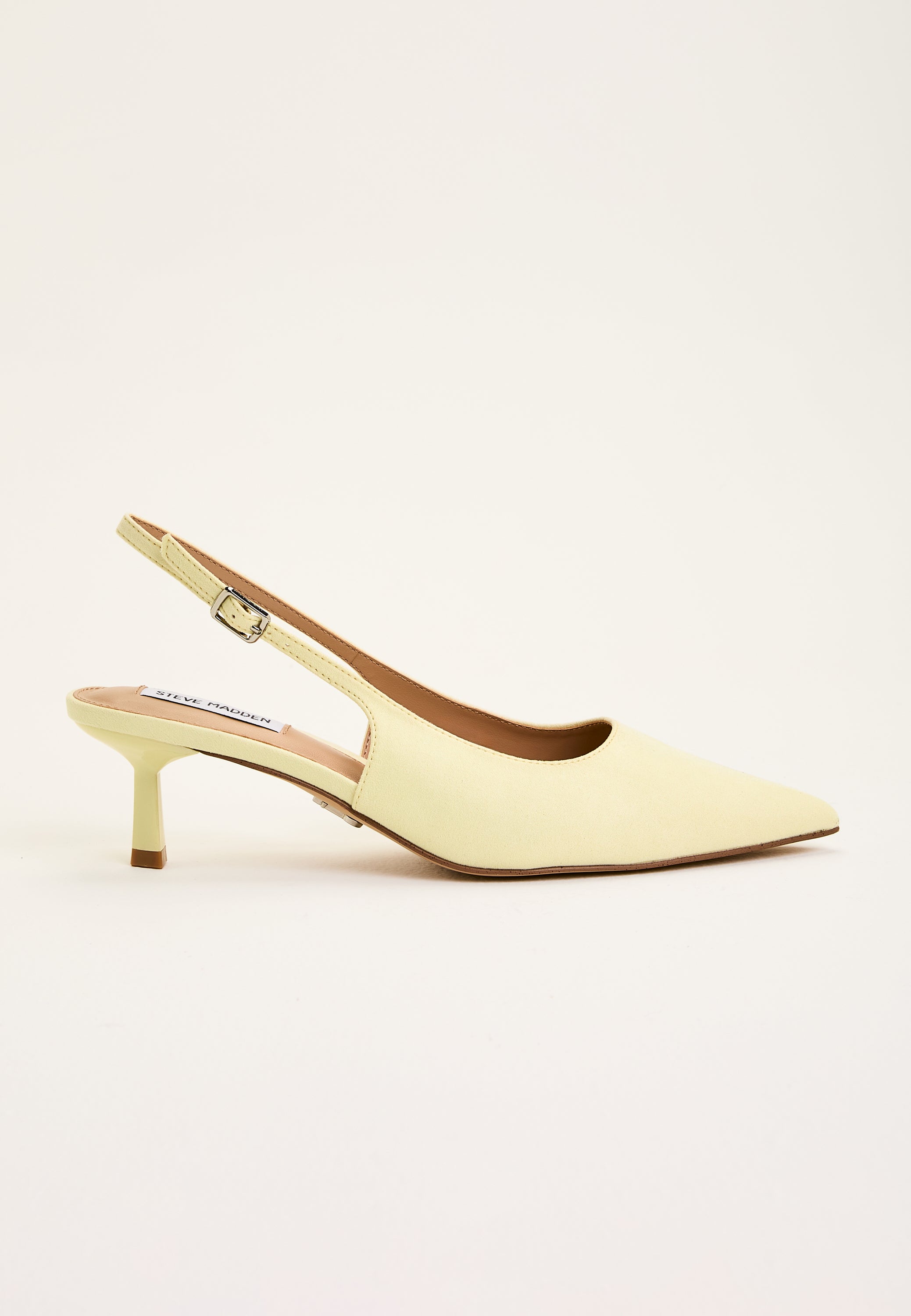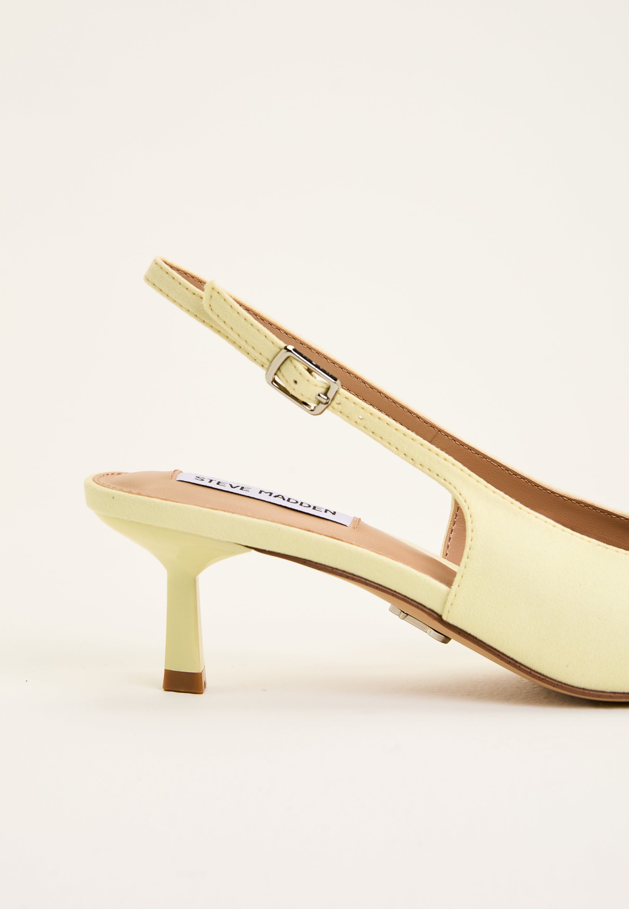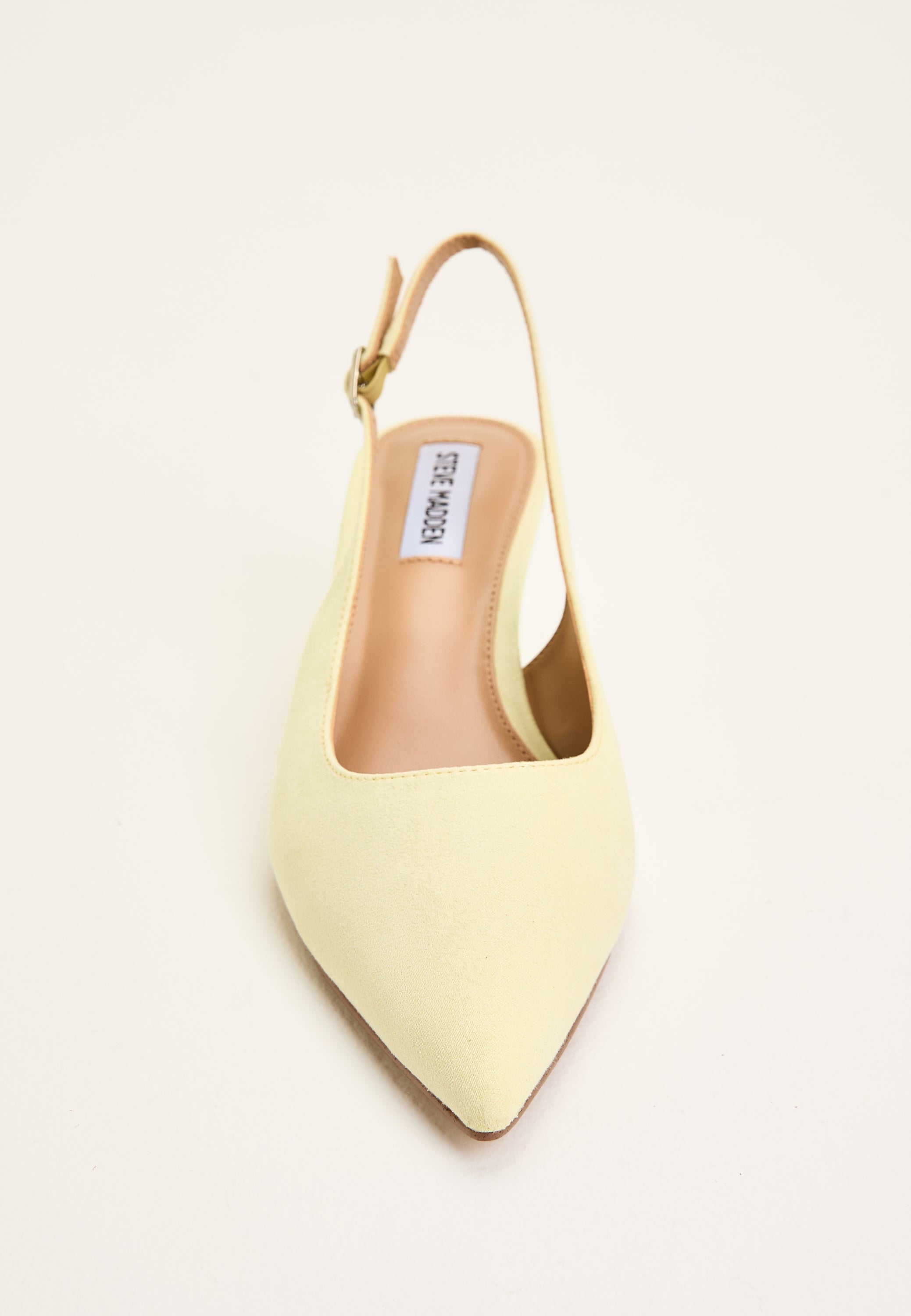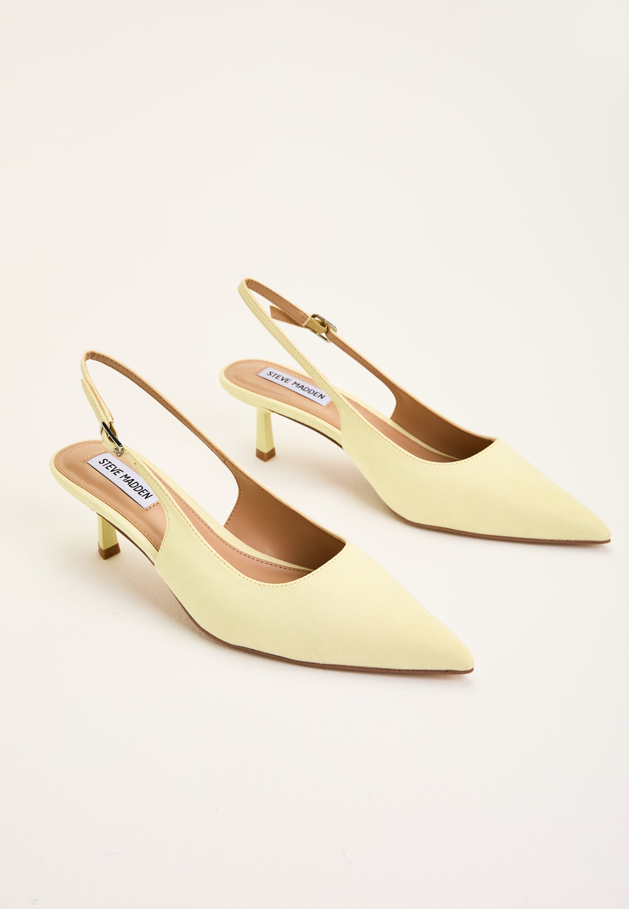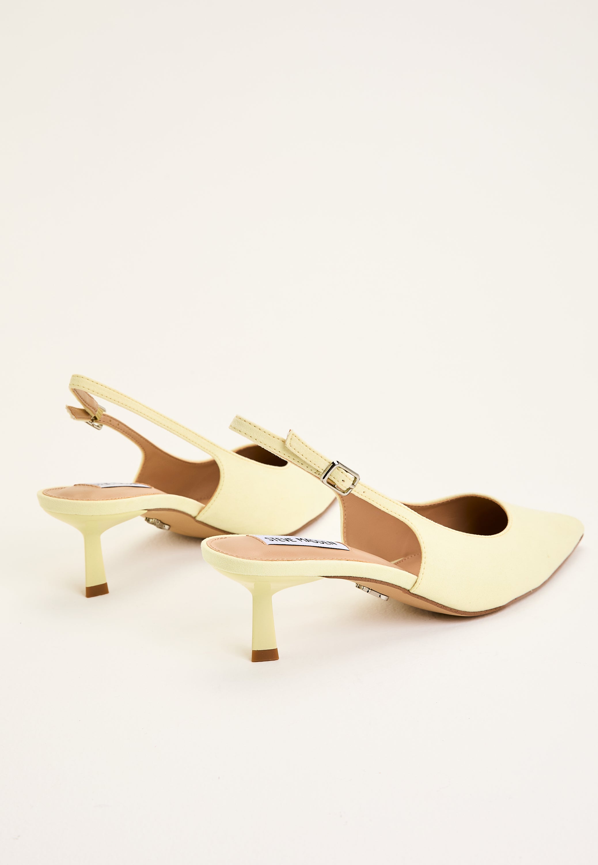 De här slingback-klackarna med spetsig tå är ett enkelt val när du vill klä upp dig till jobbet, middag eller fest och ändå känna dig bekväm. Den mjuka ljusgula tonen ger dem en fräsch, modern känsla, medan den smala silhuetten gör att hela looken känns skarp och stilren.