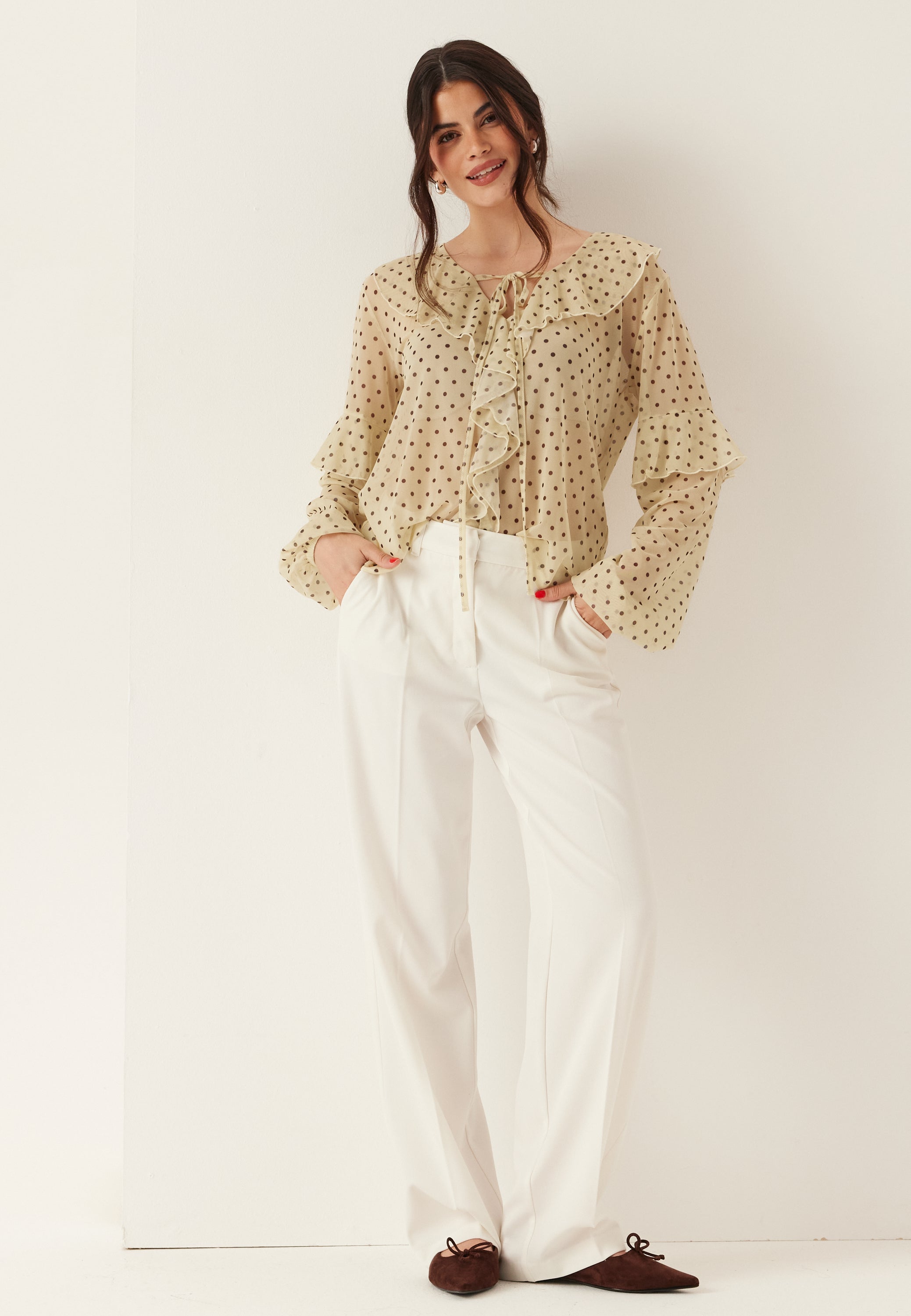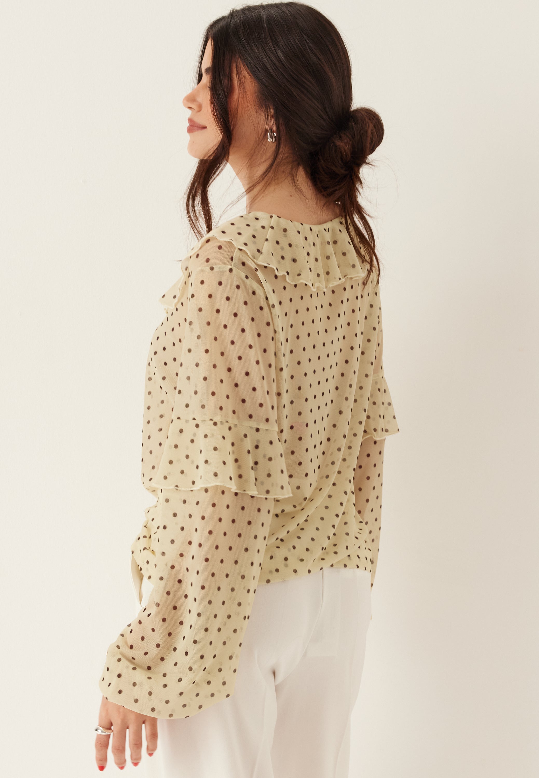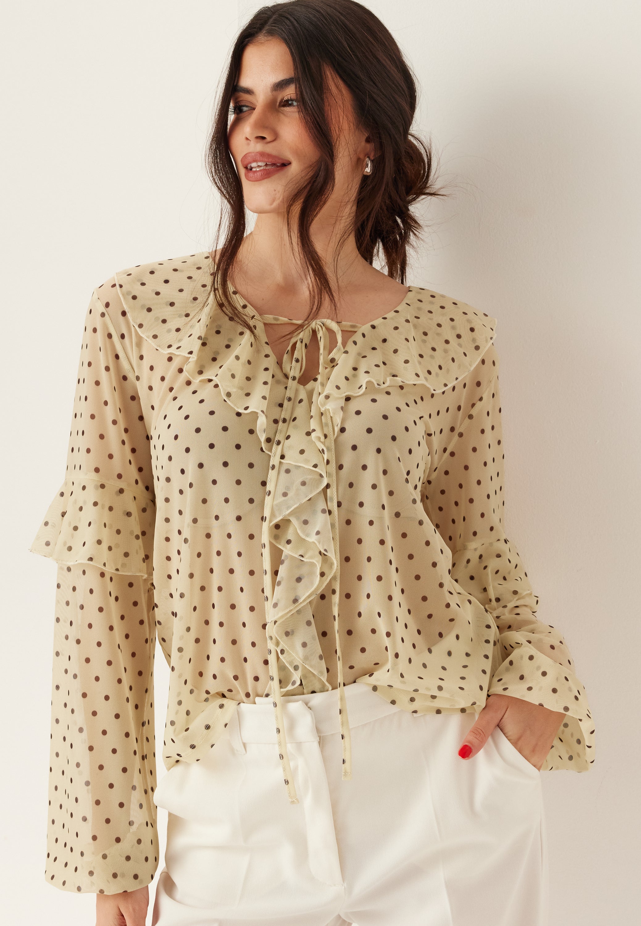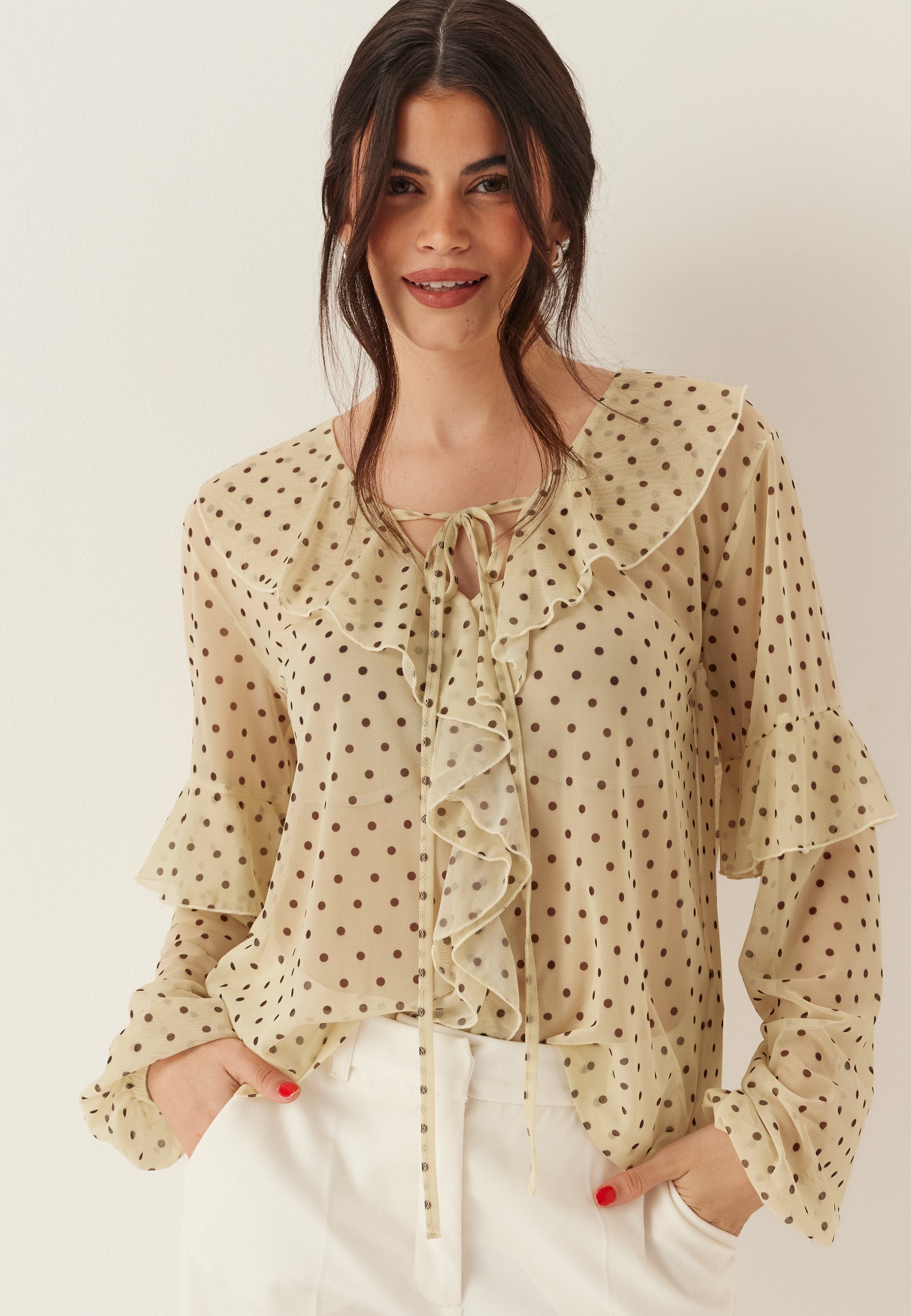 Den här transparenta meshblusen är en lätt och ledig topp för middagar, fester och uppklädda vardagslooks. Den har en mjuk V-ringning, knytband och volangkant som ger den en mer feminin känsla. Den genomskinliga meshen och det prickiga mönstret över hela plagget gör att den känns lite lekfull, samtidigt som den är enkel att styla.