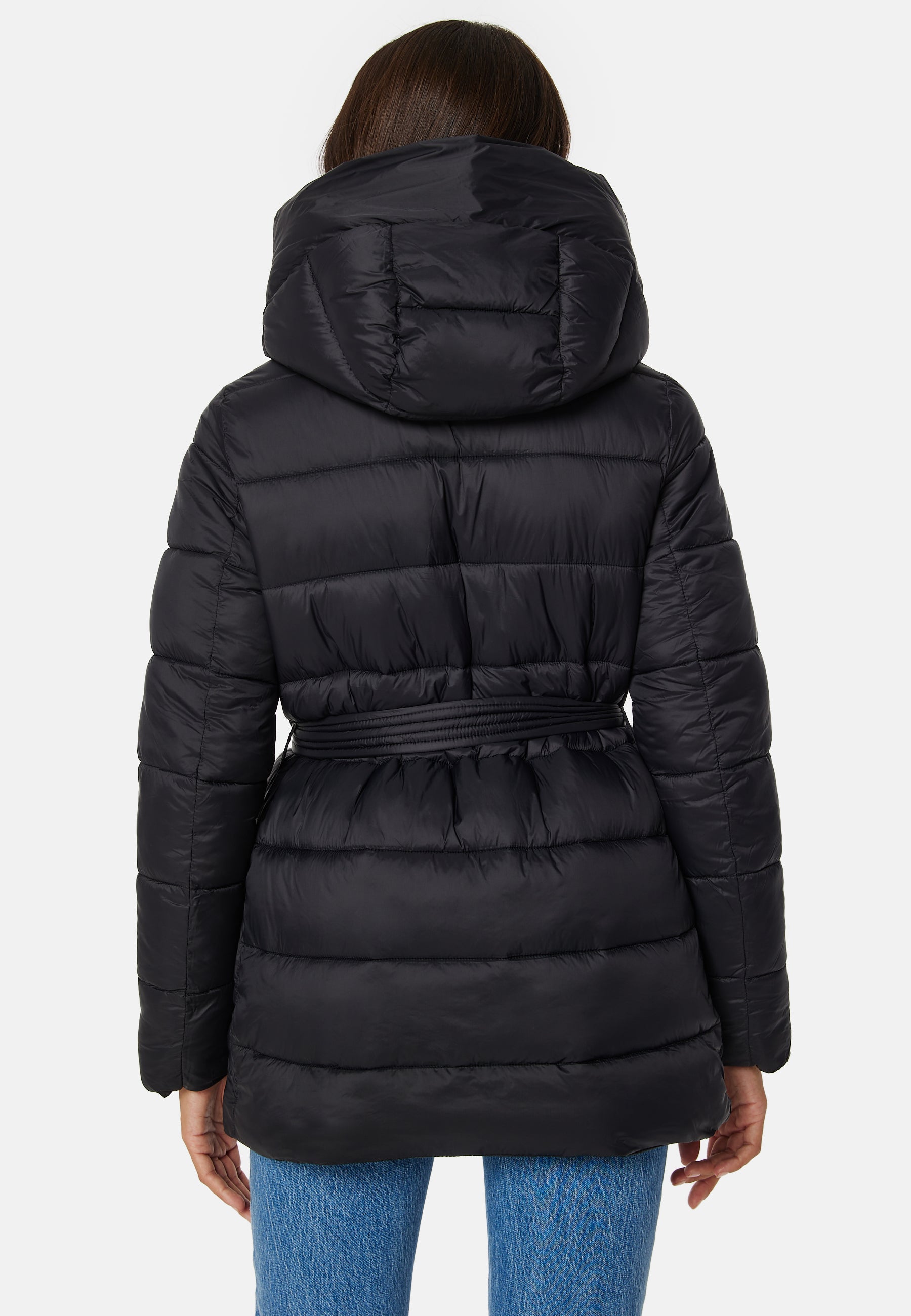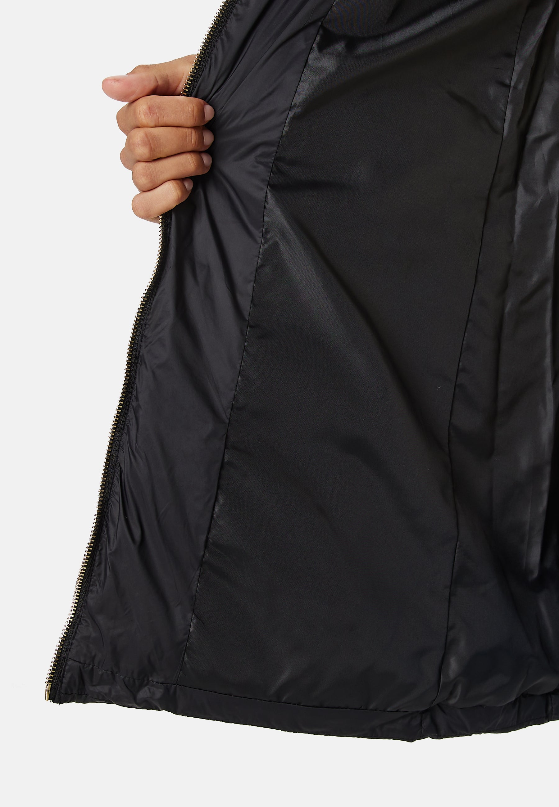- Dragkedja framtill med knytbälte i midjan