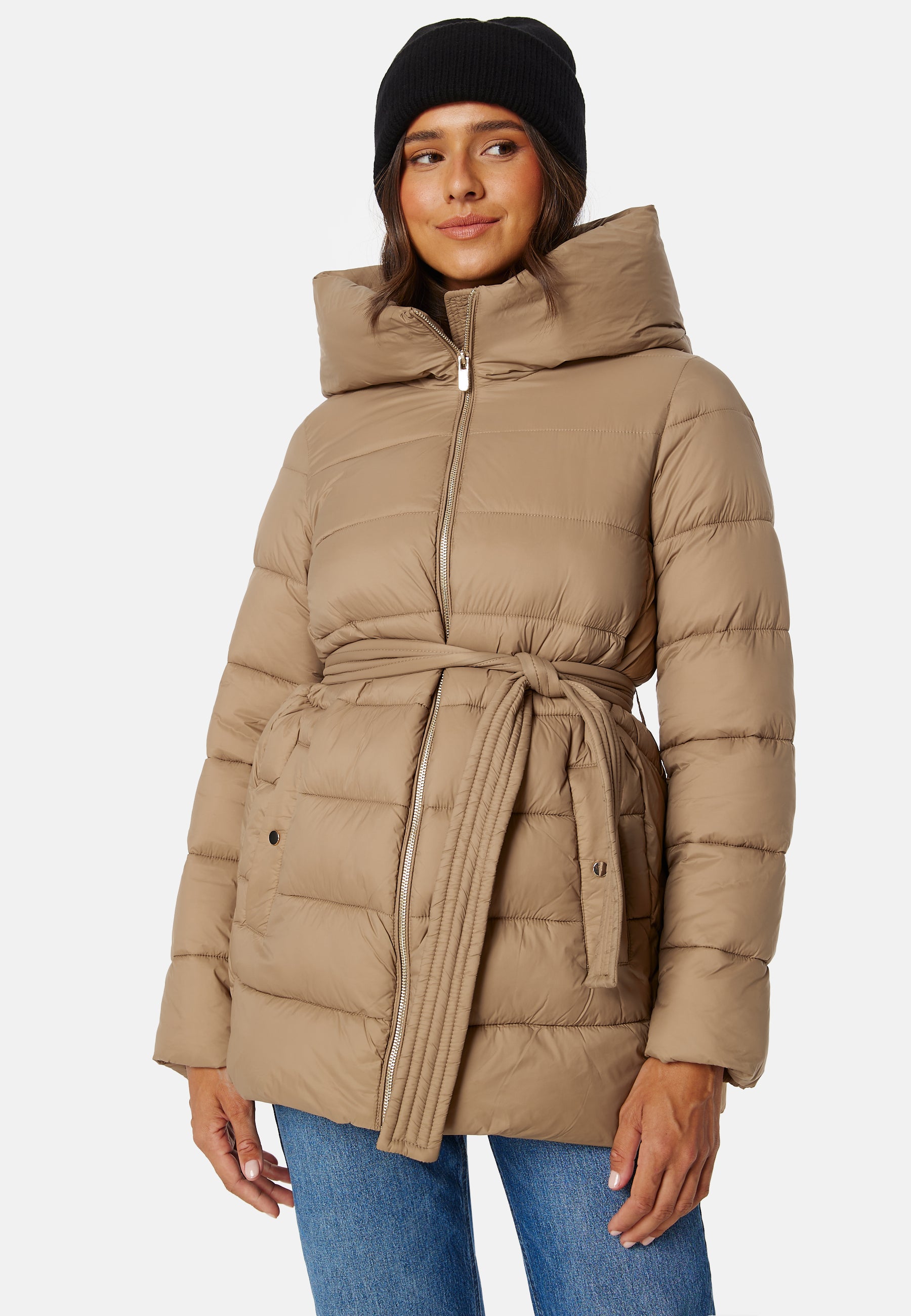 - Dragkedja framtill med knytbälte i midjan