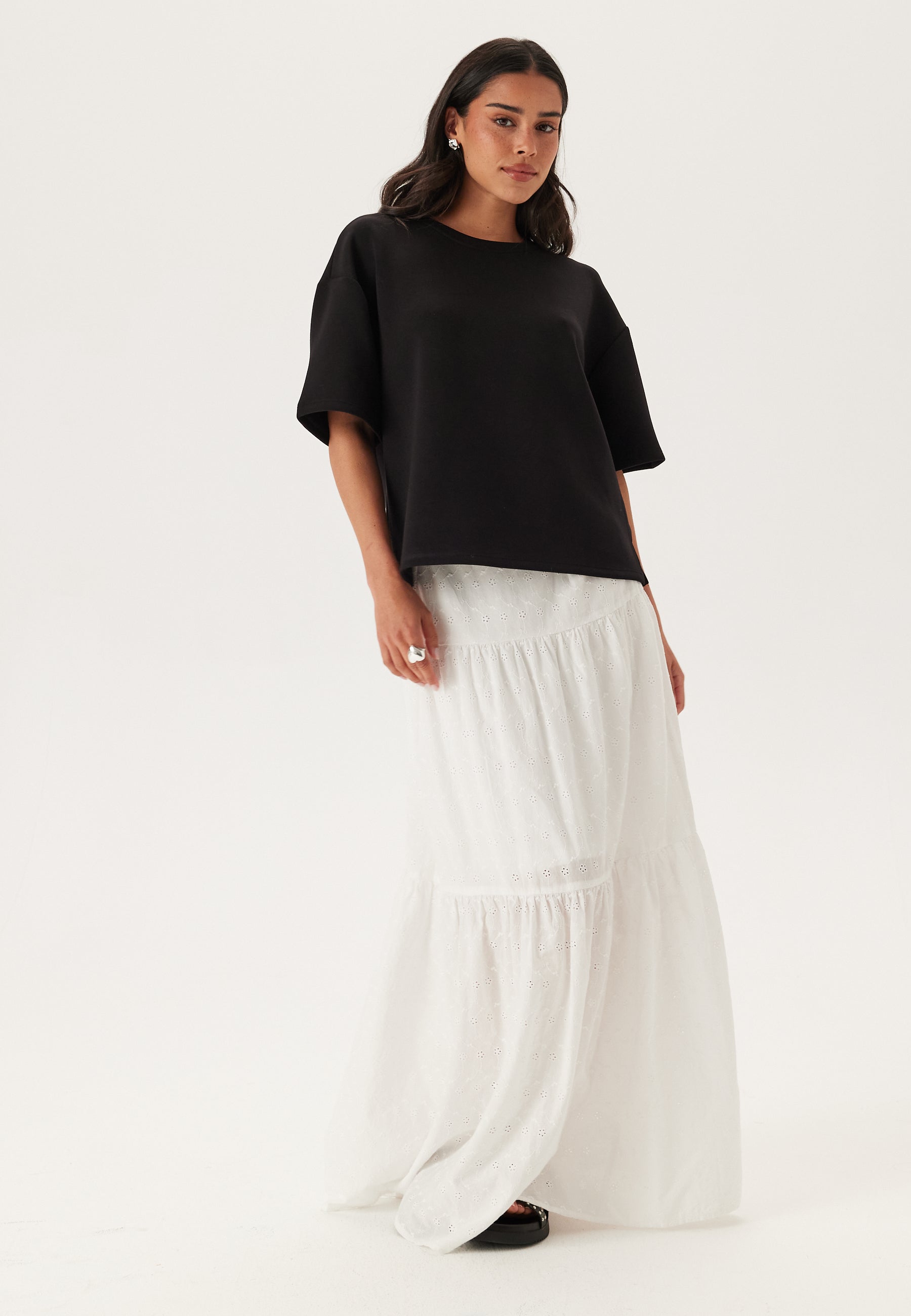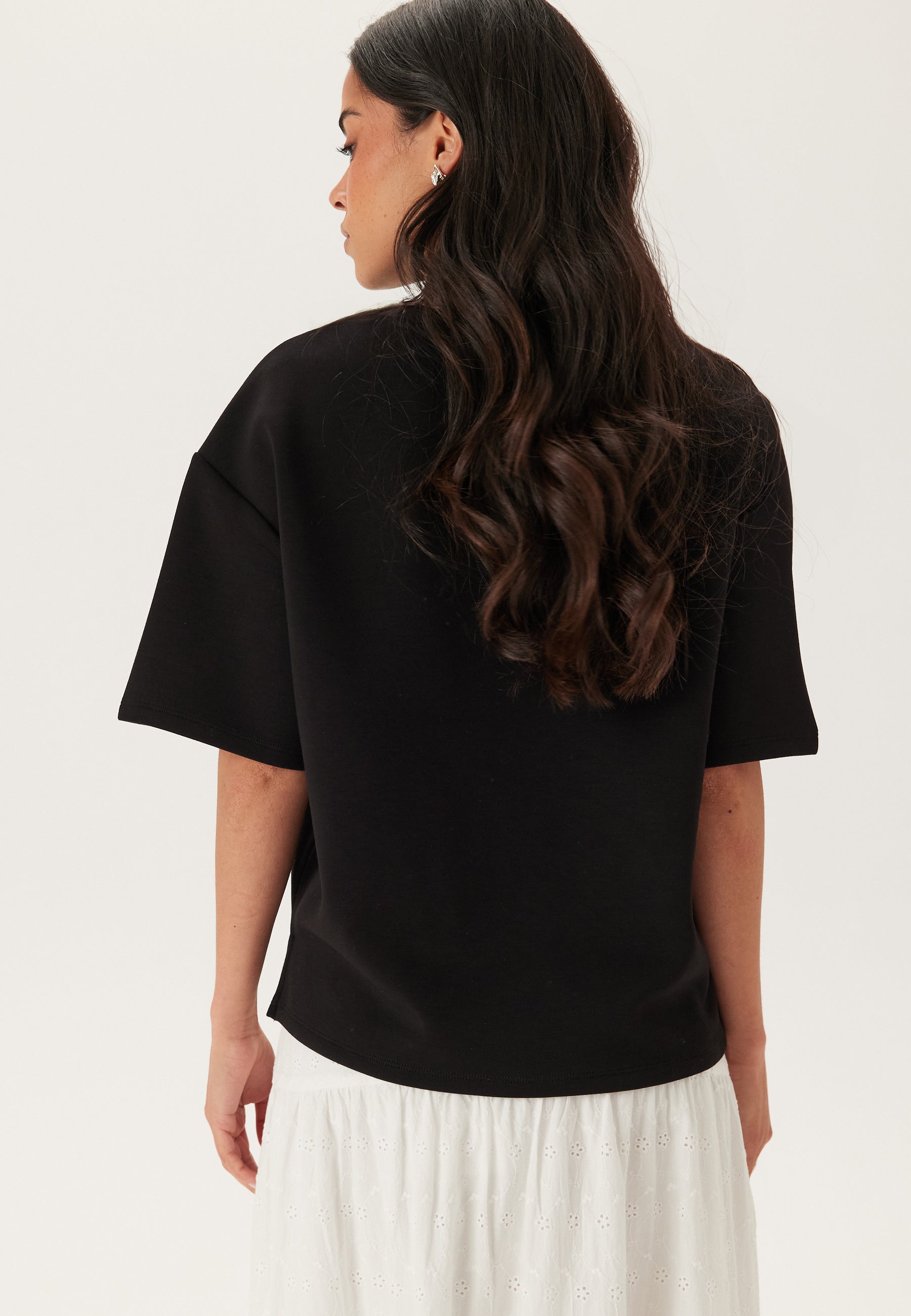 Den här svarta oversized T-shirten är en enkel favorit för vardagen – perfekt till jobbet, helgen och avslappnade lager på lager-looks. Den mjuka, stretchiga känslan och det rena, minimalistiska uttrycket gör den lätt att bära om och om igen. Den boxiga, lediga passformen ger en avslappnad silhuett som funkar lika fint med jeans och dressade byxor som med kjol.