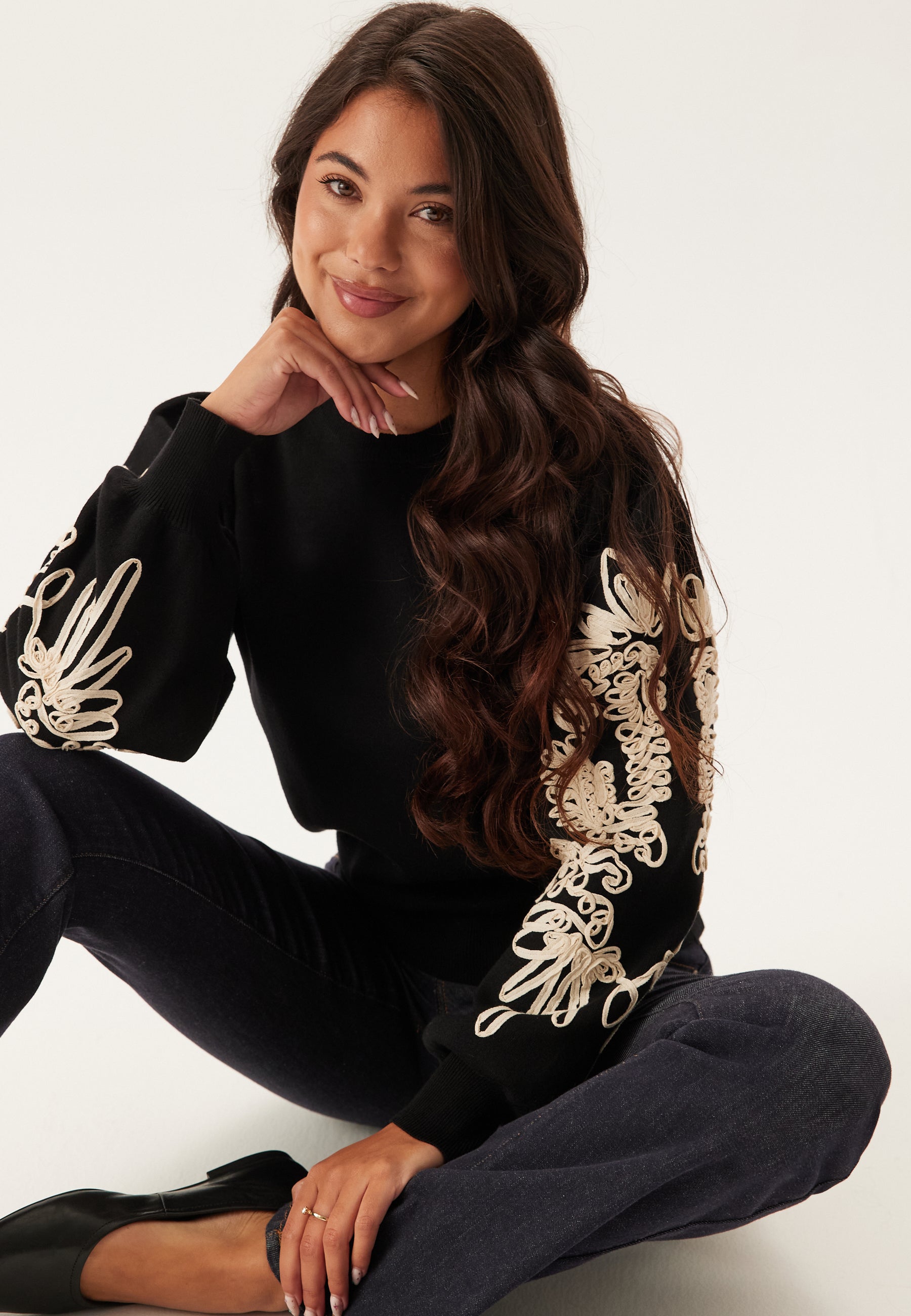 - Påsydda dekorationer på ärmarna