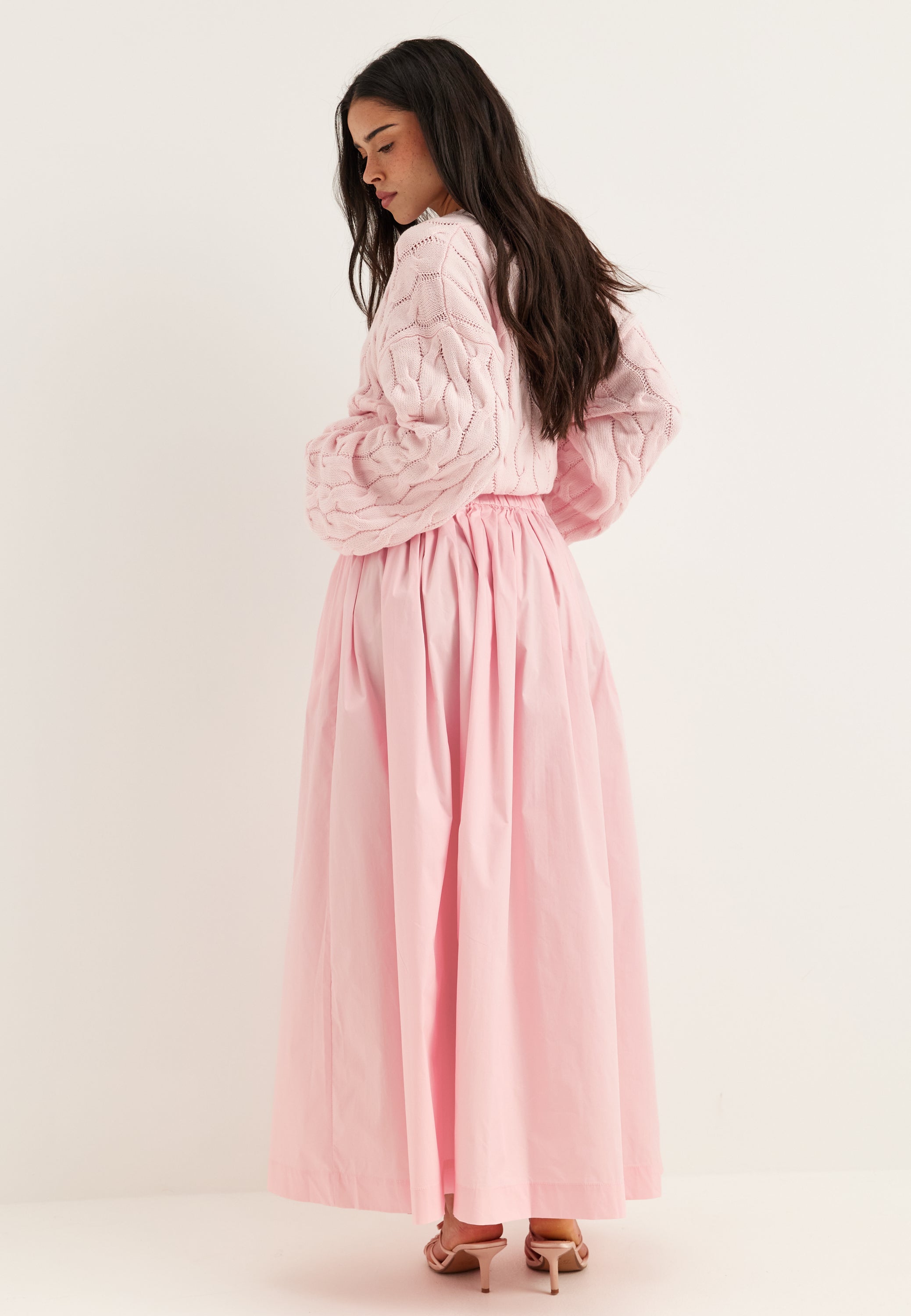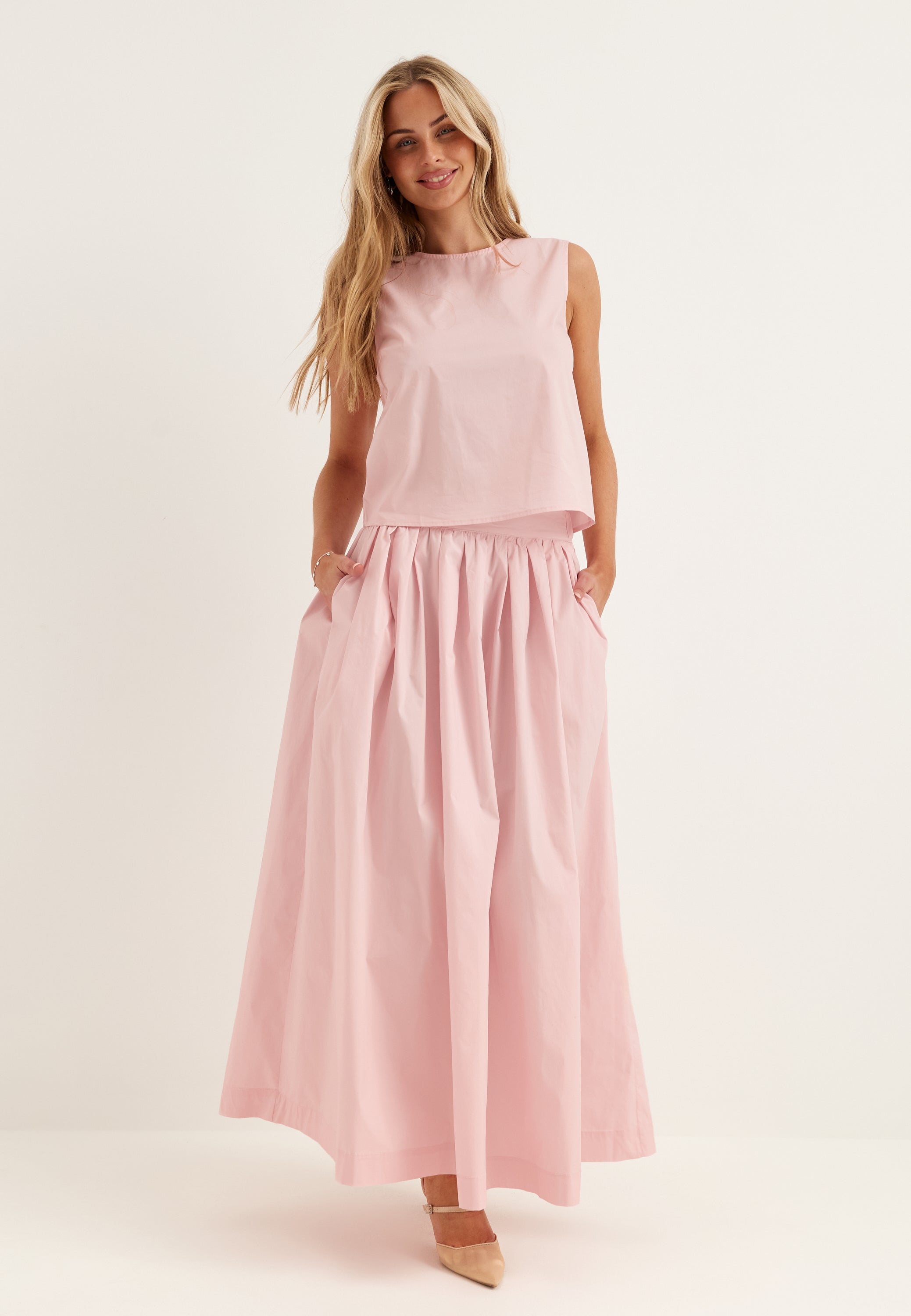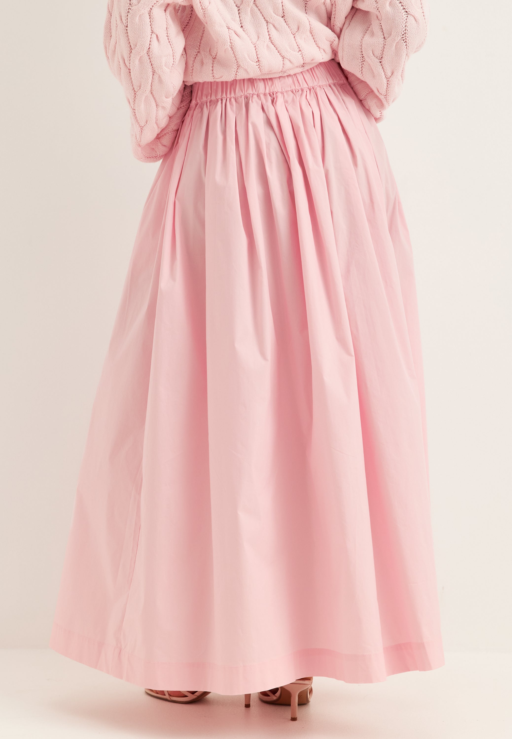 Den här maxikjolen med hög midja är ett enkelt sätt att få in mjuk volym och färg i vardagslooken – oavsett om du ska på brunch, packar för semestern eller vill klä upp dig lite för middag. Den vida silhuetten och den ljusrosa tonen ger ett lätt och luftigt intryck, medan den långa längden skapar den där svepande, uttrycksfulla looken utan att det känns för uppstyrt.