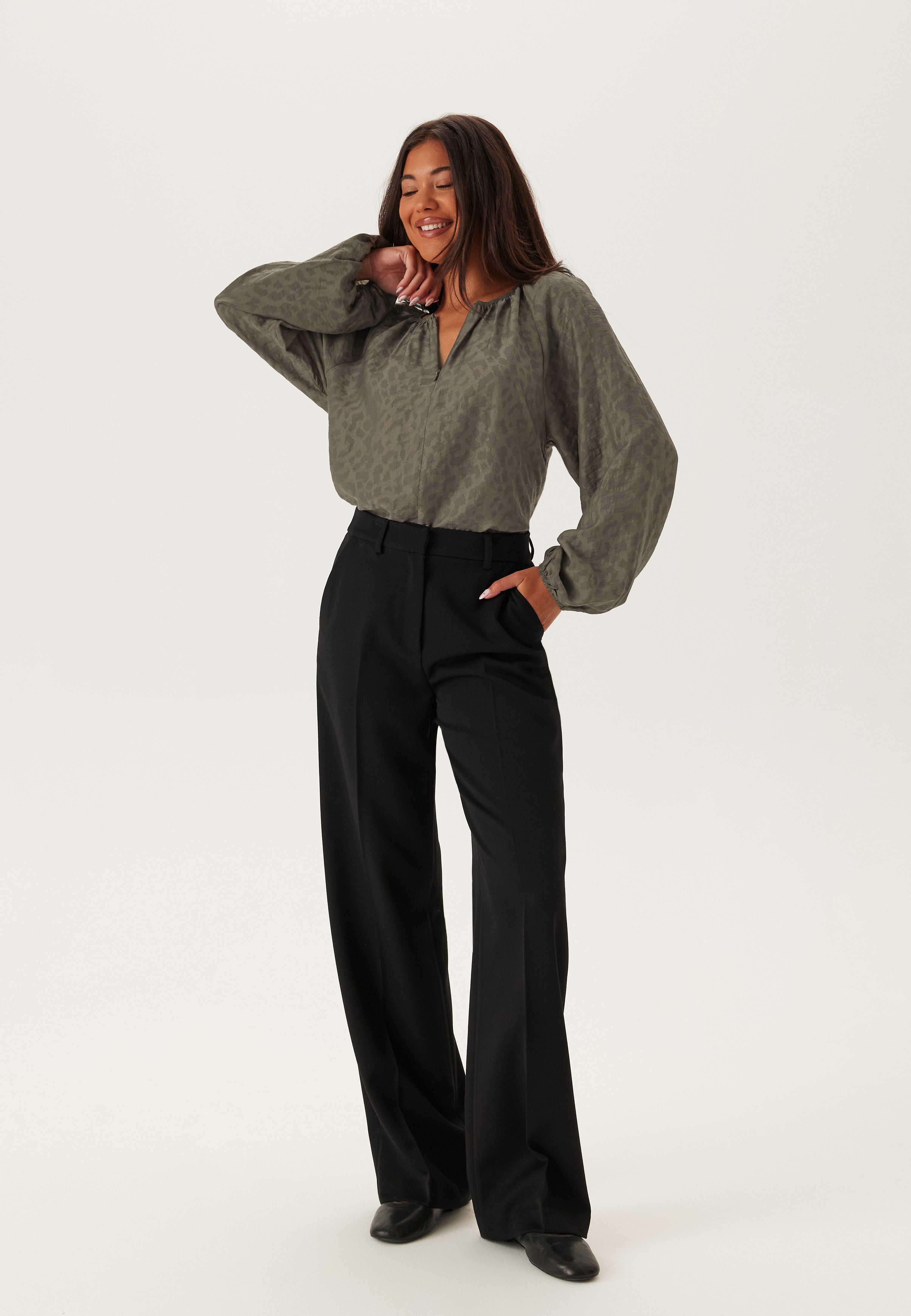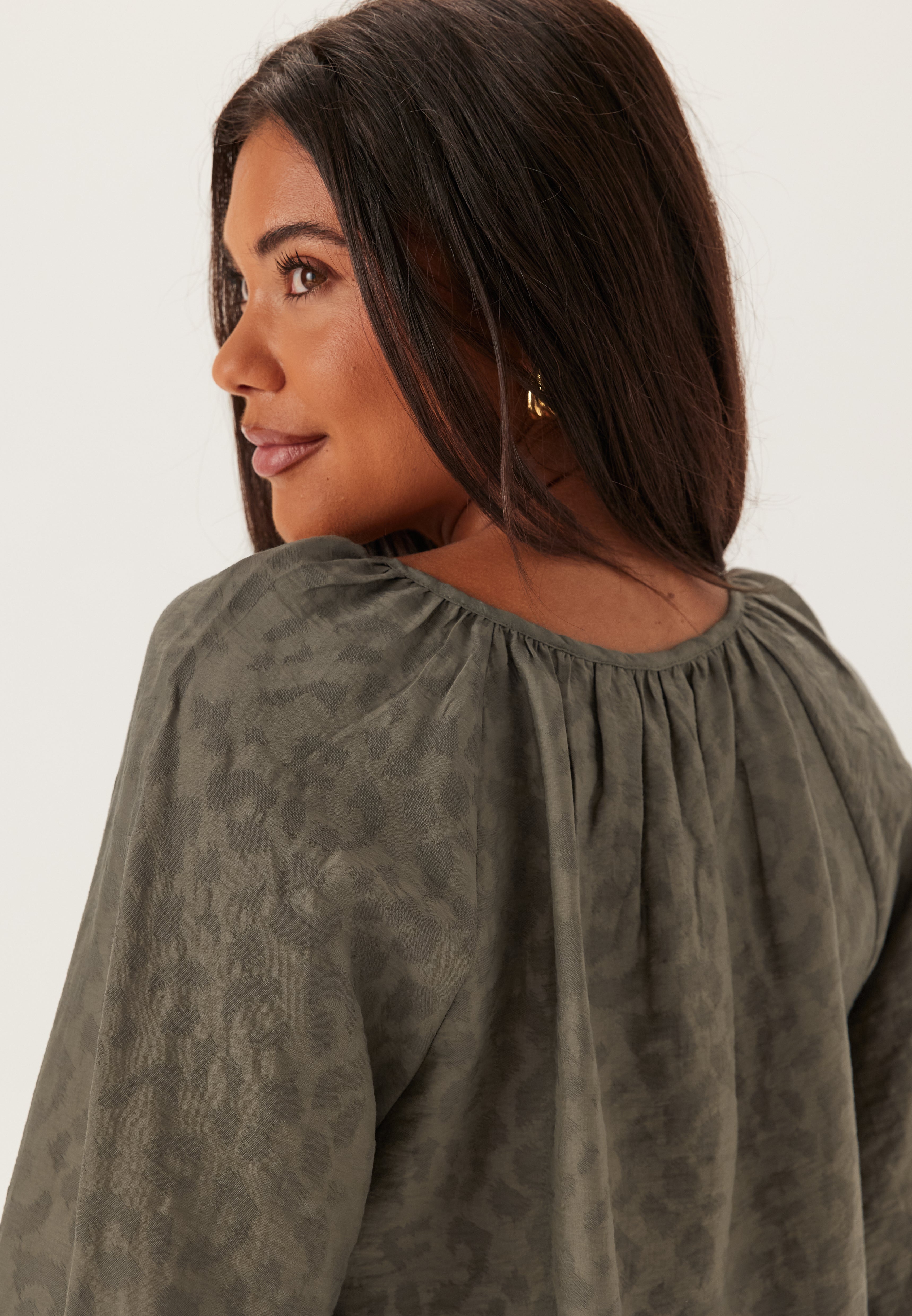 Den här långärmade blusen har en ledig passform som passar lika bra till jobbmiddagar och fester som till dagar när du vill känna dig välklädd utan att vara för uppklädd. Det vävda tyget utan stretch ger ett fint fall, medan den mjuka olivgröna tonen och den diskreta ton-i-ton-strukturen ger mer liv än en enkel enfärgad blus.