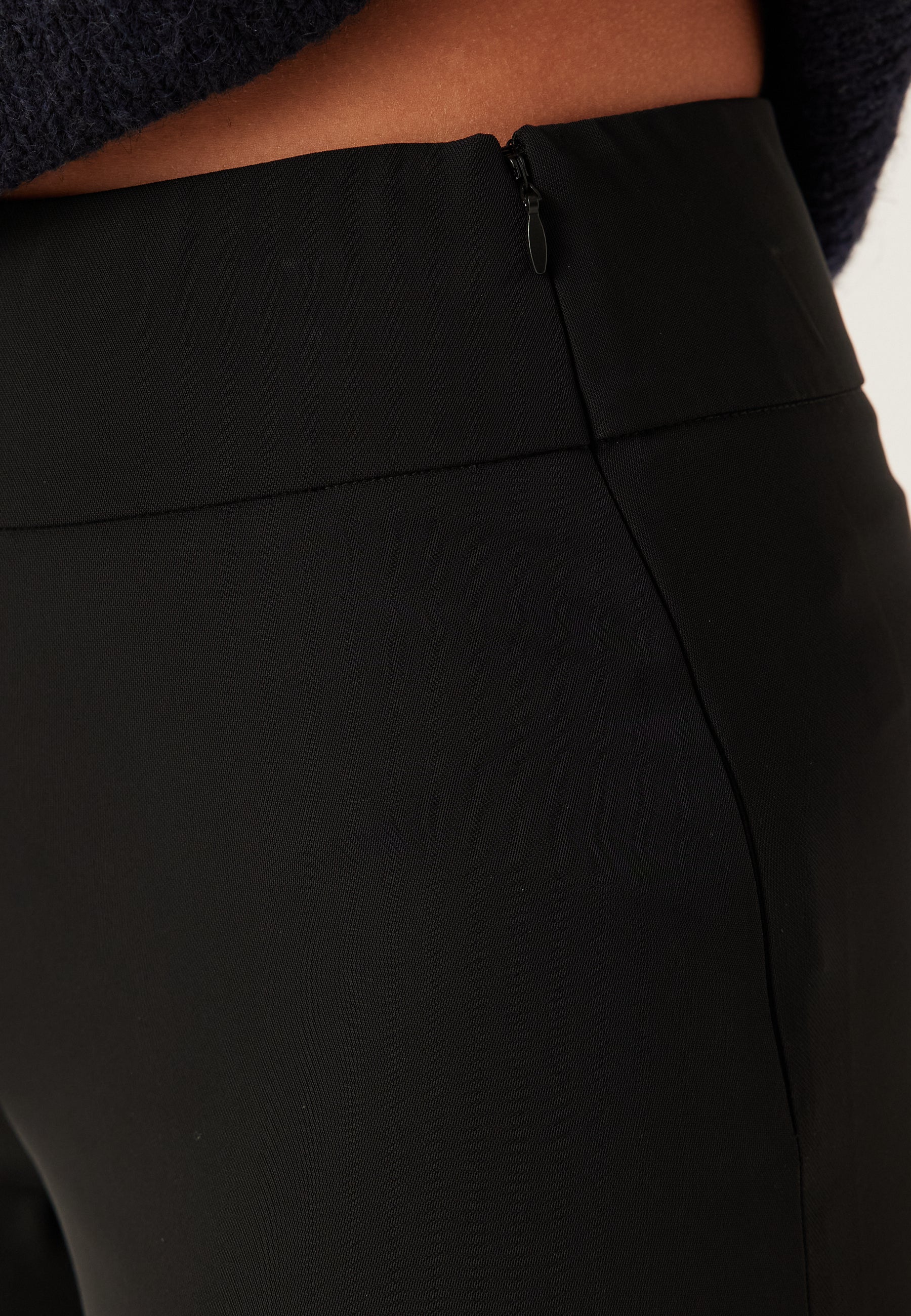 Det vävda materialet har lätt stretch, så byxorna känns mjuka och sköna att röra sig i, medan den invändiga resåren i midjan ger extra komfort utan att ändra det stilrena uttrycket. En dold dragkedja i sidan håller looken ren och enkel, vilket gör att de här byxorna känns lite mer uppklädda än ditt vardagspar.