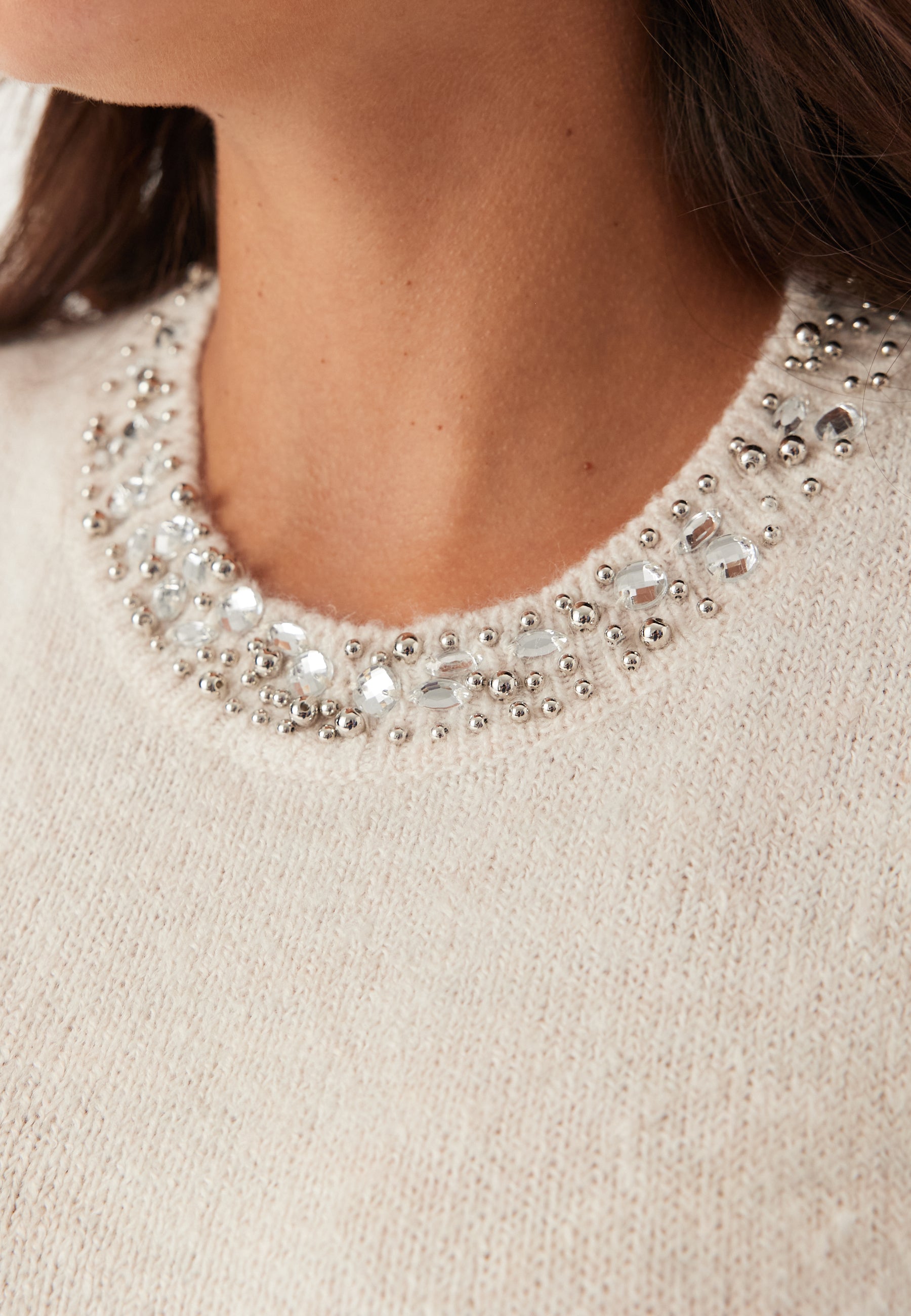 - Rundad halsringning med strassdetalj.