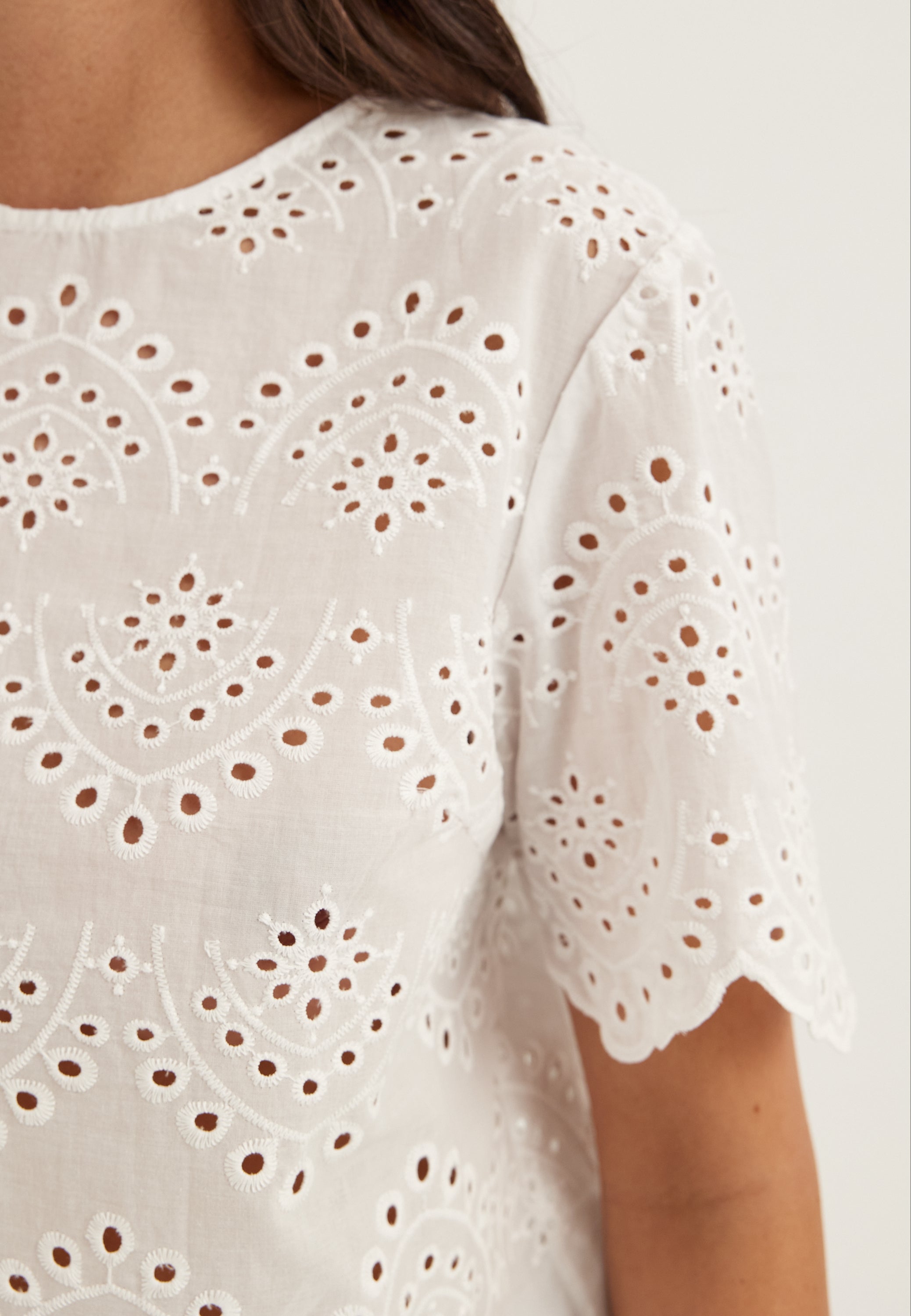 Det som får den här broderade toppen att sticka ut är kombinationen av krispigt klarvitt och fina utskurna detaljer, som ger en fräsch och luftig känsla som passar lika bra till helgplaner som i semesterpackningen.