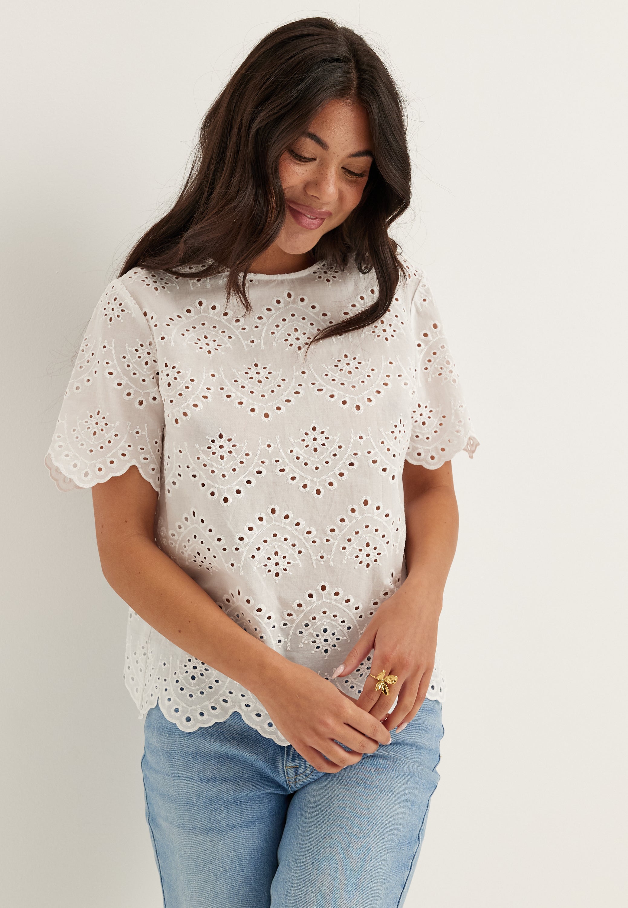 Den här vita toppen i broderie anglaise är en enkel sommarblus som passar perfekt till jeans, shorts och lediga dagar när du vill ha något lätt, fint och enkelt att styla. Den broderade hålmönstringen över hela plagget ger ett mjukare och lite mer uppklätt intryck än en vanlig t-shirt, medan den rundade halsringningen håller looken ren och lättburen.