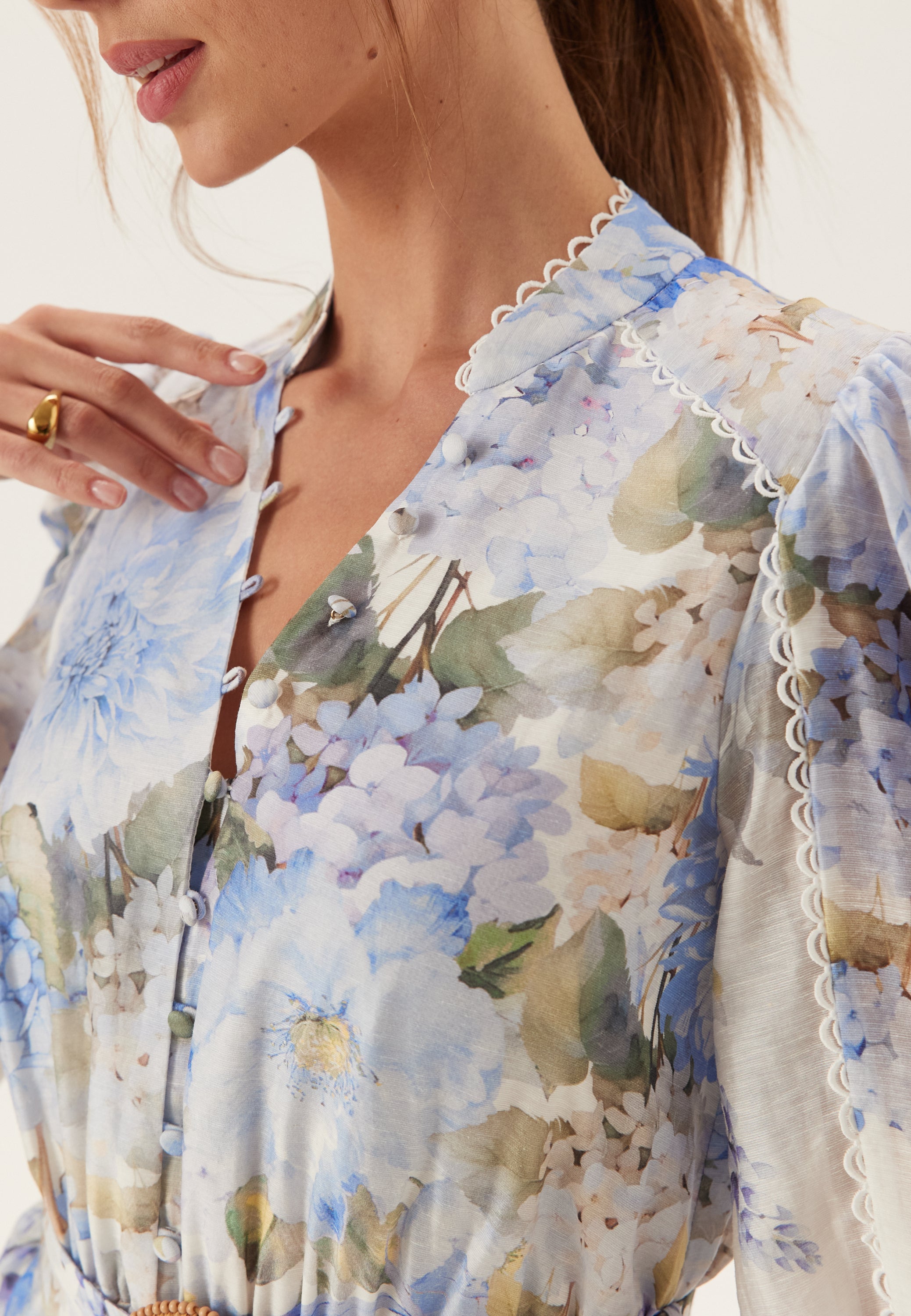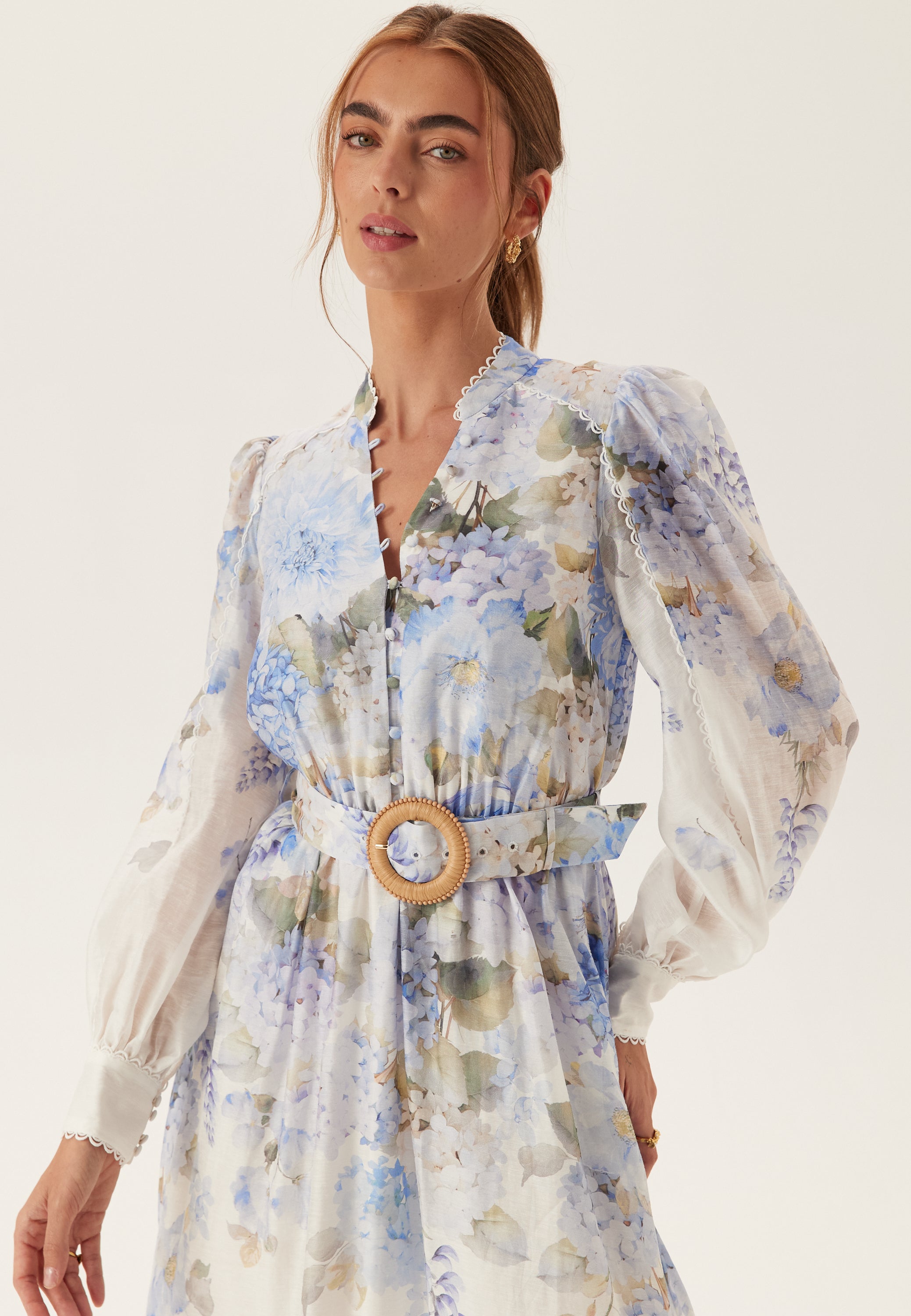 Den här blommiga midiklänningen är ett enkelt val till bröllop, trädgårdsfester och uppklädda dagsplaner. Det mjuka blåvita mönstret, de långa puffärmarna och den markerade midjan ger ett välklätt men ändå lätt intryck. Det vävda tyget utan stretch håller formen snyggt på plats, medan den följsamma kjolen ger fin rörelse när du går.