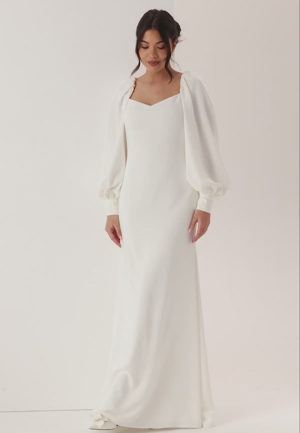 Ett fint val om du vill ha en lång brudklänning som känns elegant utan att vara för uppklädd. Den är enkel att styla med stilrena klackar, slöja eller markerade örhängen. Den avskalade designen ger ett sofistikerat bruduttryck, medan de voluminösa ärmarna tillför precis lagom mycket detalj för att kännas minnesvärd.